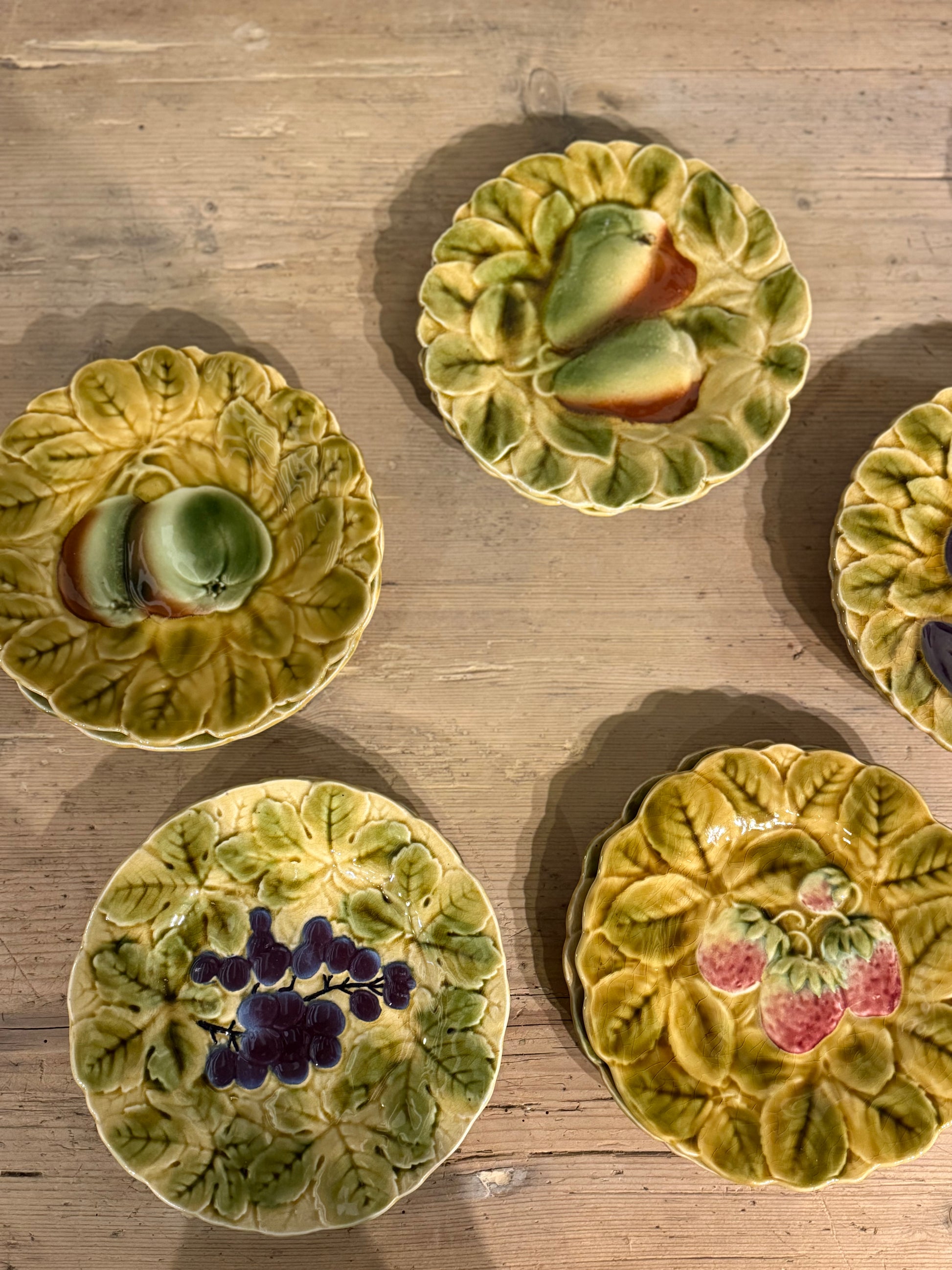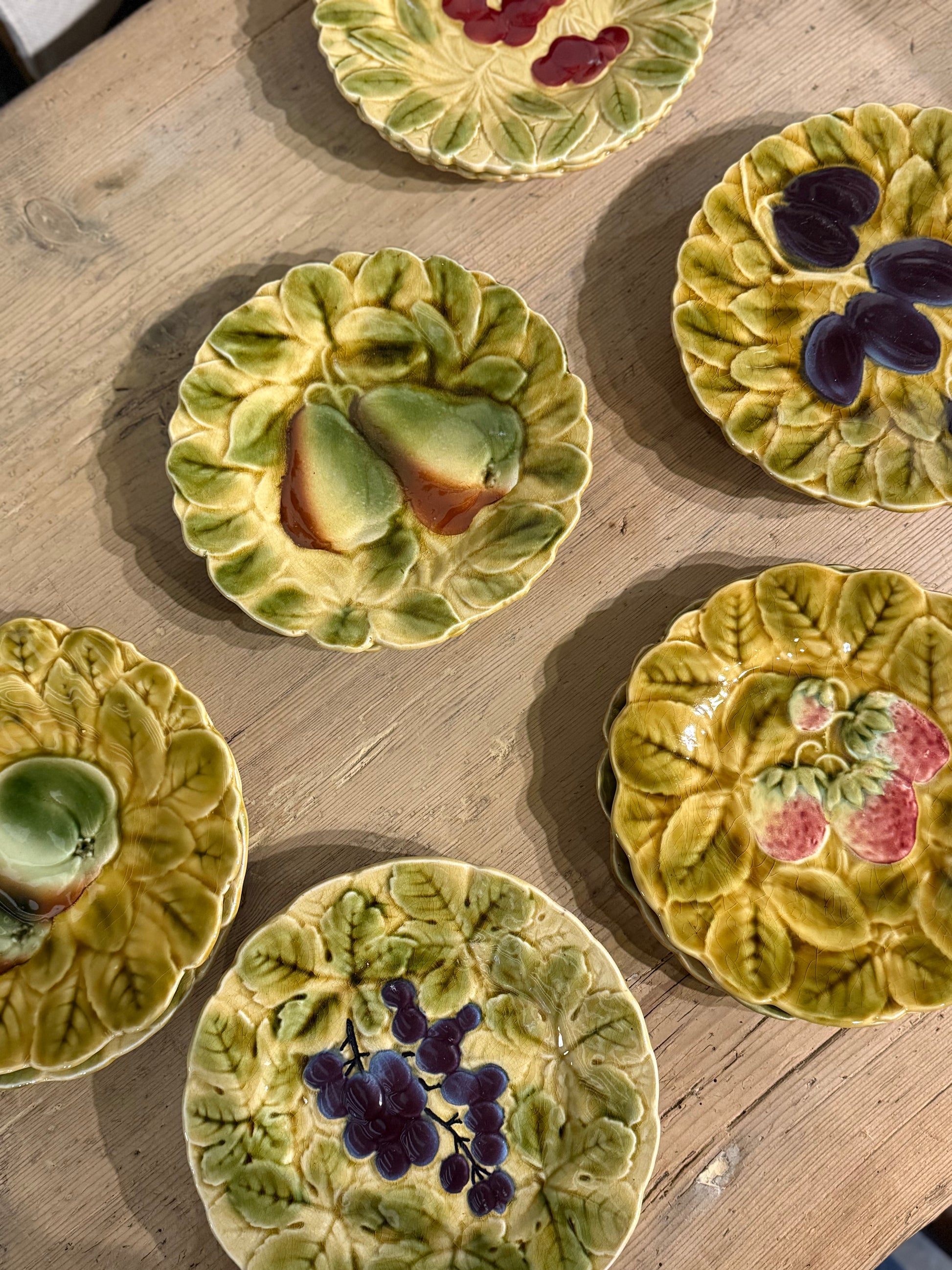 Preciosos platos franceses de la reconocida firma Sarreguemines, decorados con delicados motivos frutales en tonos suaves y llenos de encanto. Cada pieza refleja la elegancia y el savoir-faire de la cerámica francesa del siglo XX.
