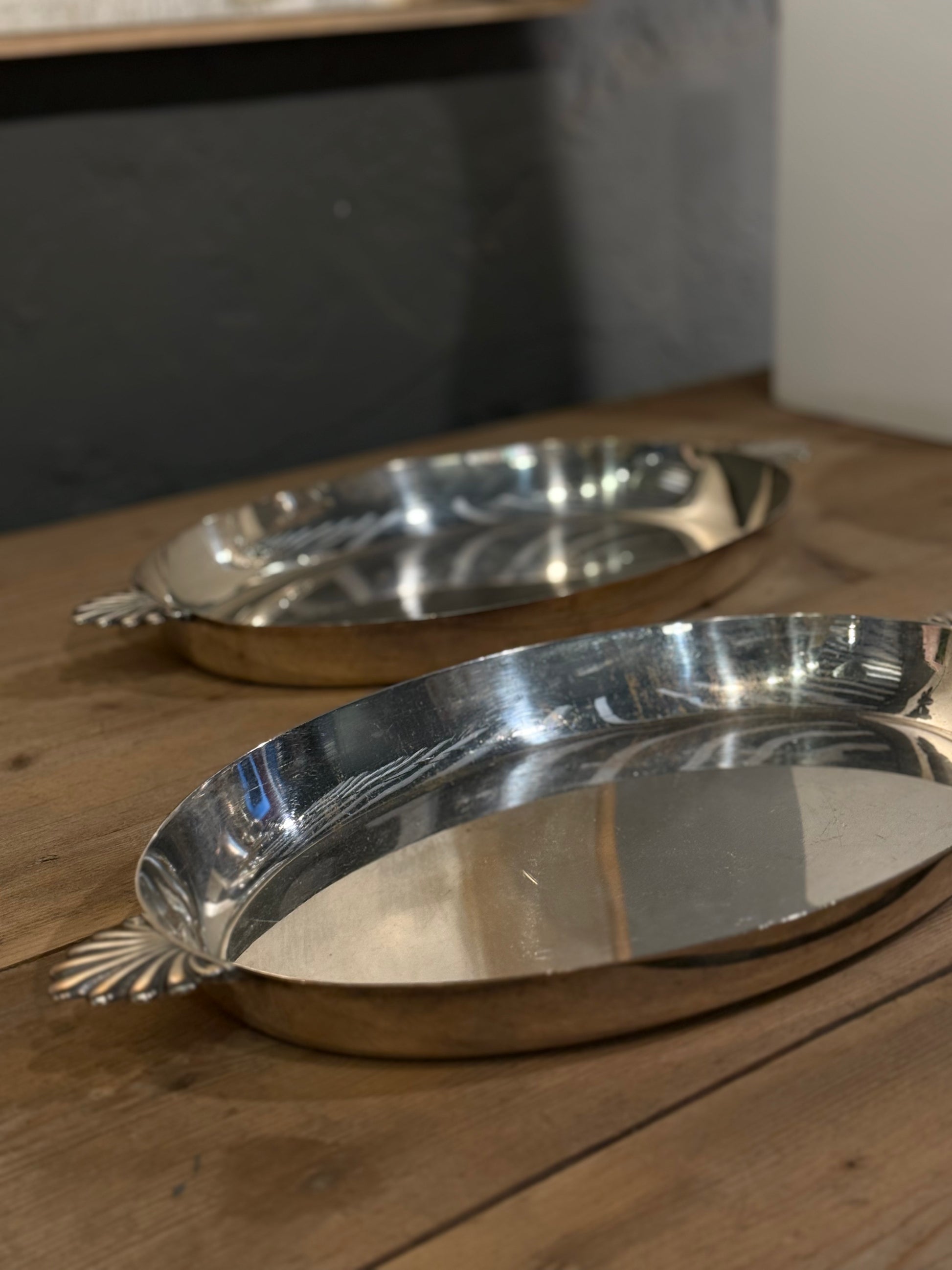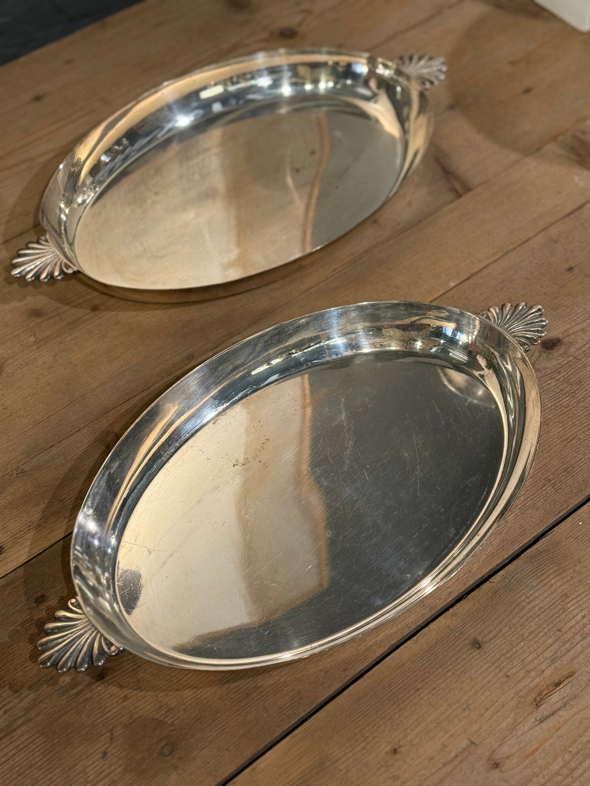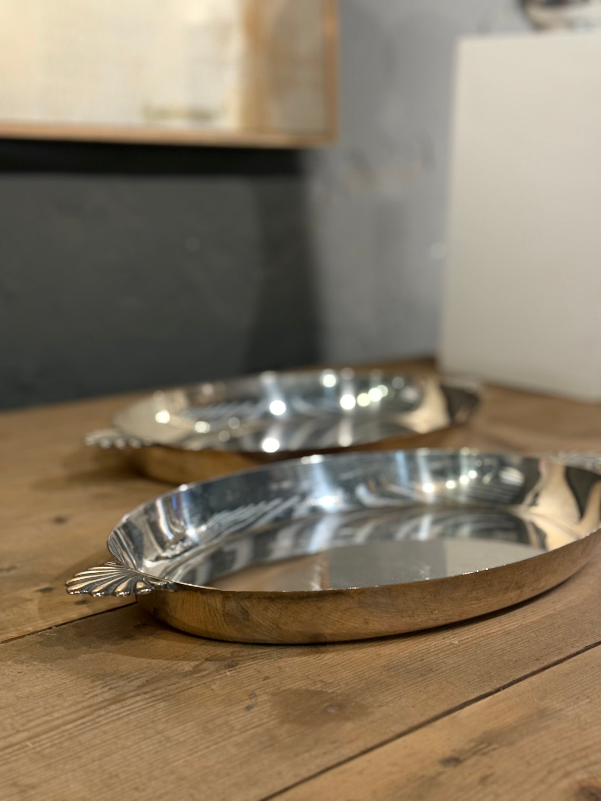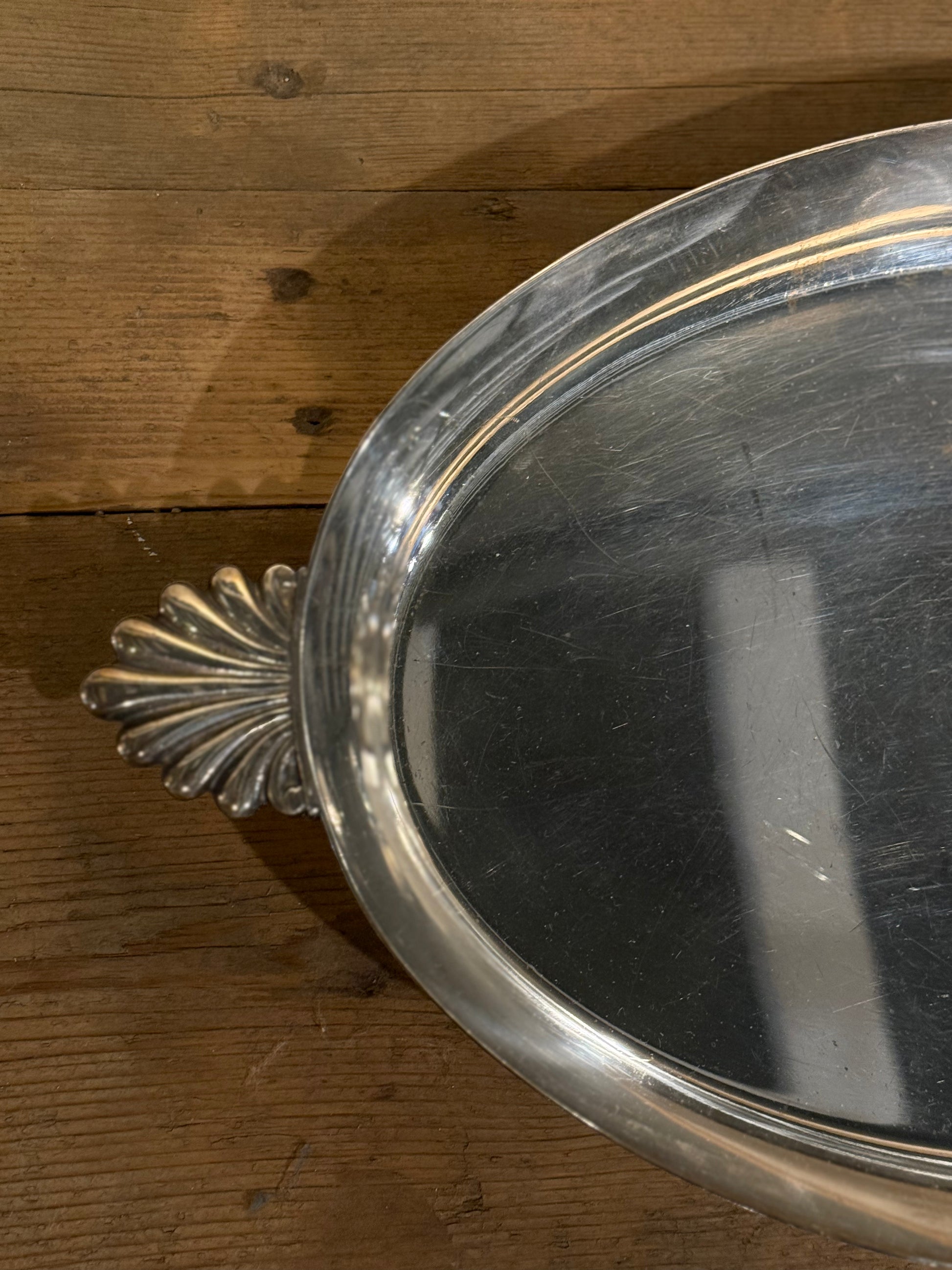Elegante bandeja de alpaca con asas rematadas en forma de concha. Una pieza clásica y refinada, perfecta para servir o decorar con estilo.