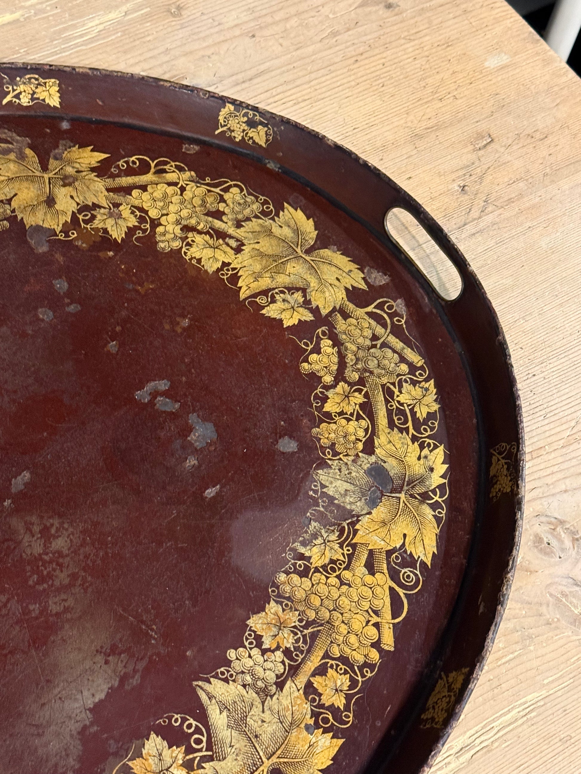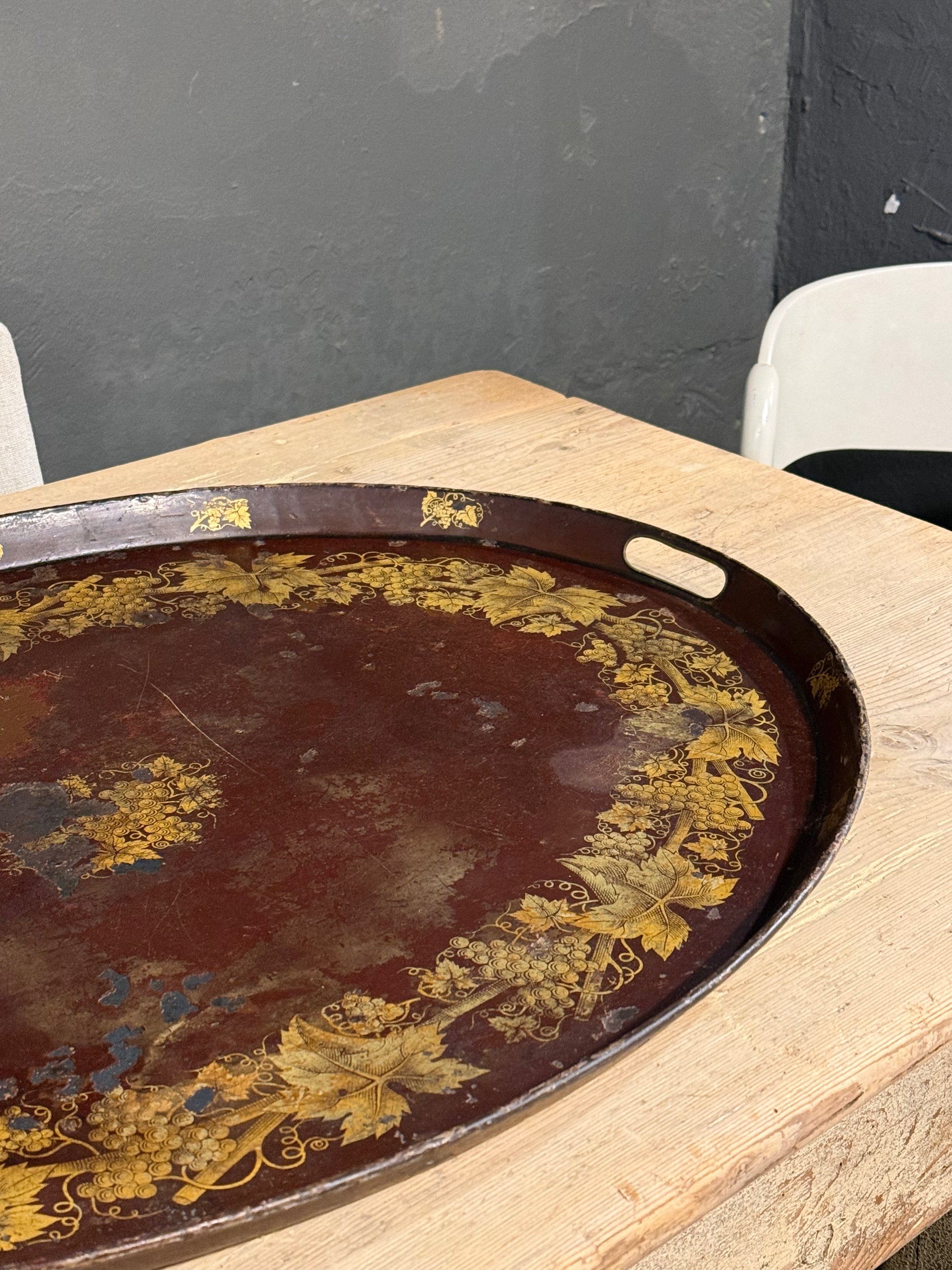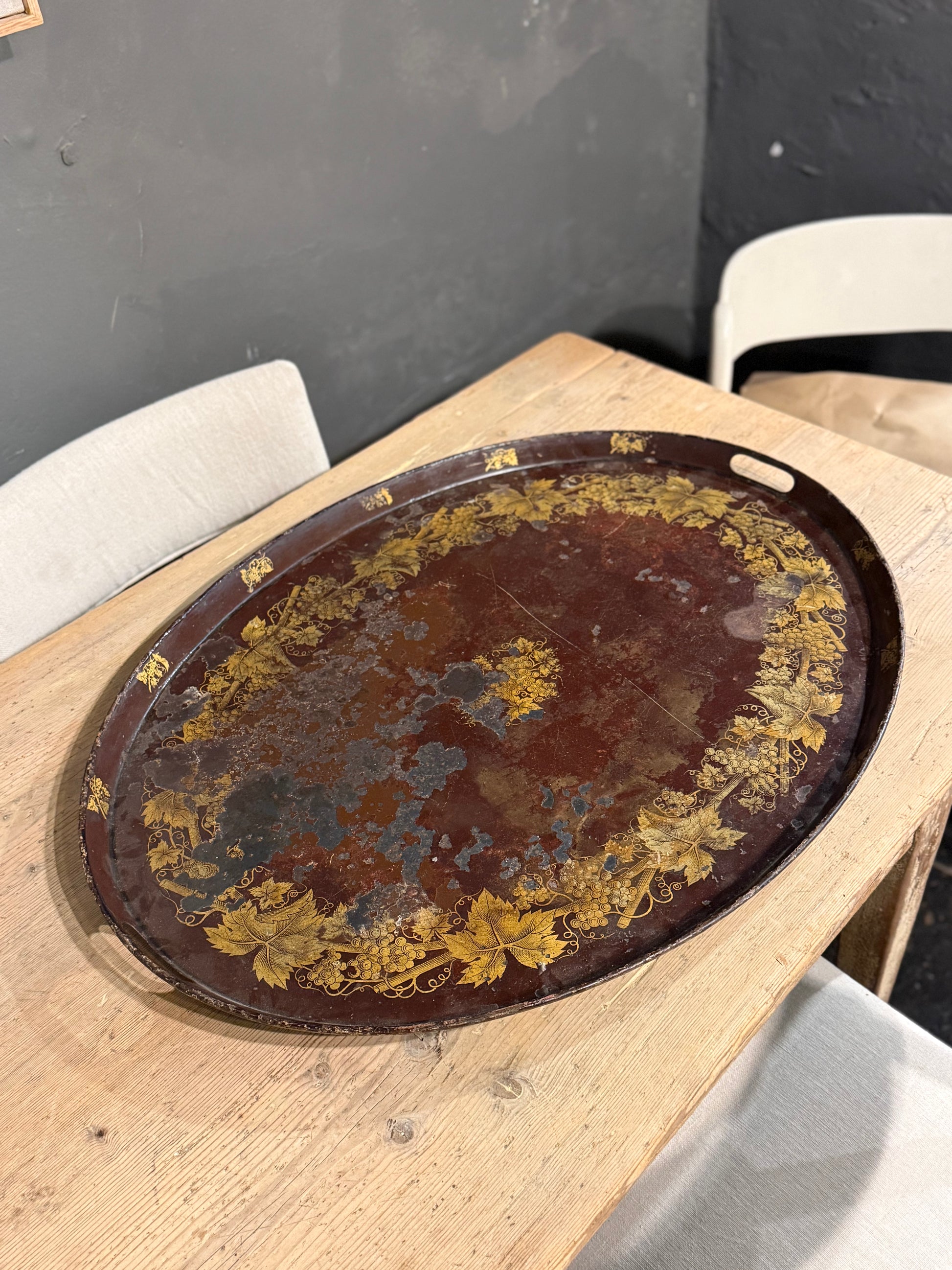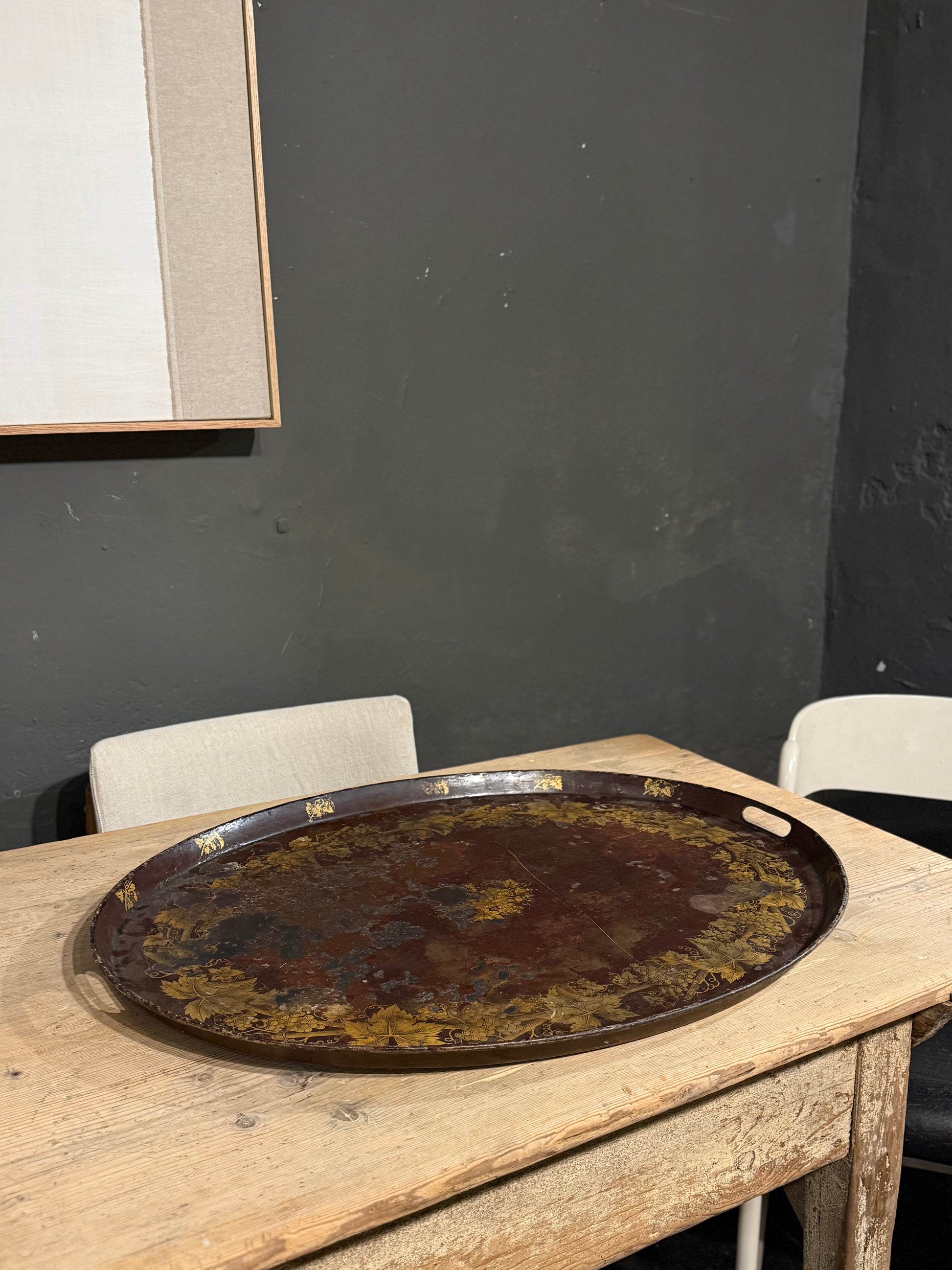 Preciosa bandeja antigua de hierro con forma ovalada y un delicado motivo floral en acabado dorado que recorre todo el borde. Una pieza llena de carácter, donde las zonas sin pintura revelan el paso natural del tiempo y añaden un encanto auténtico y único.