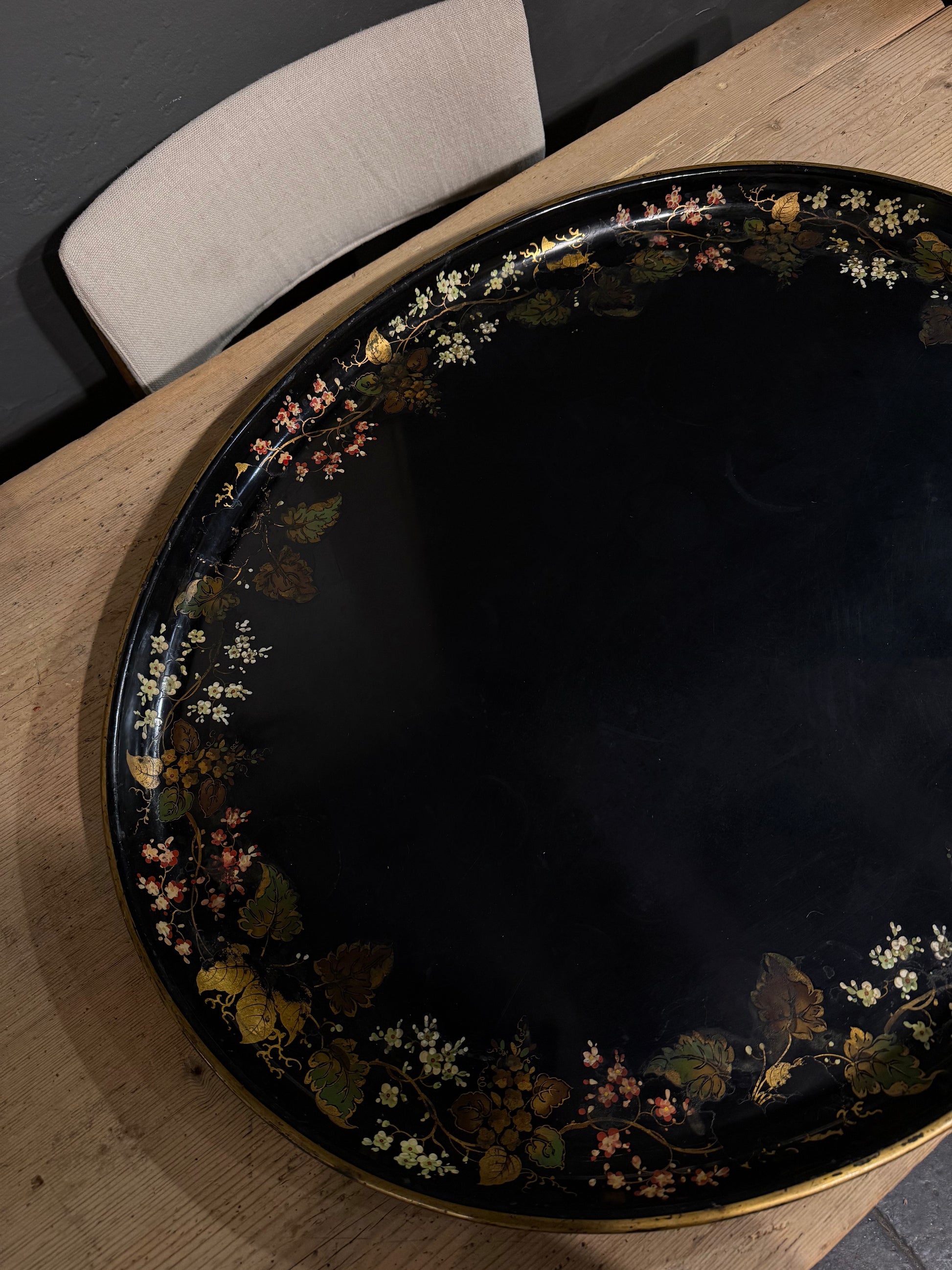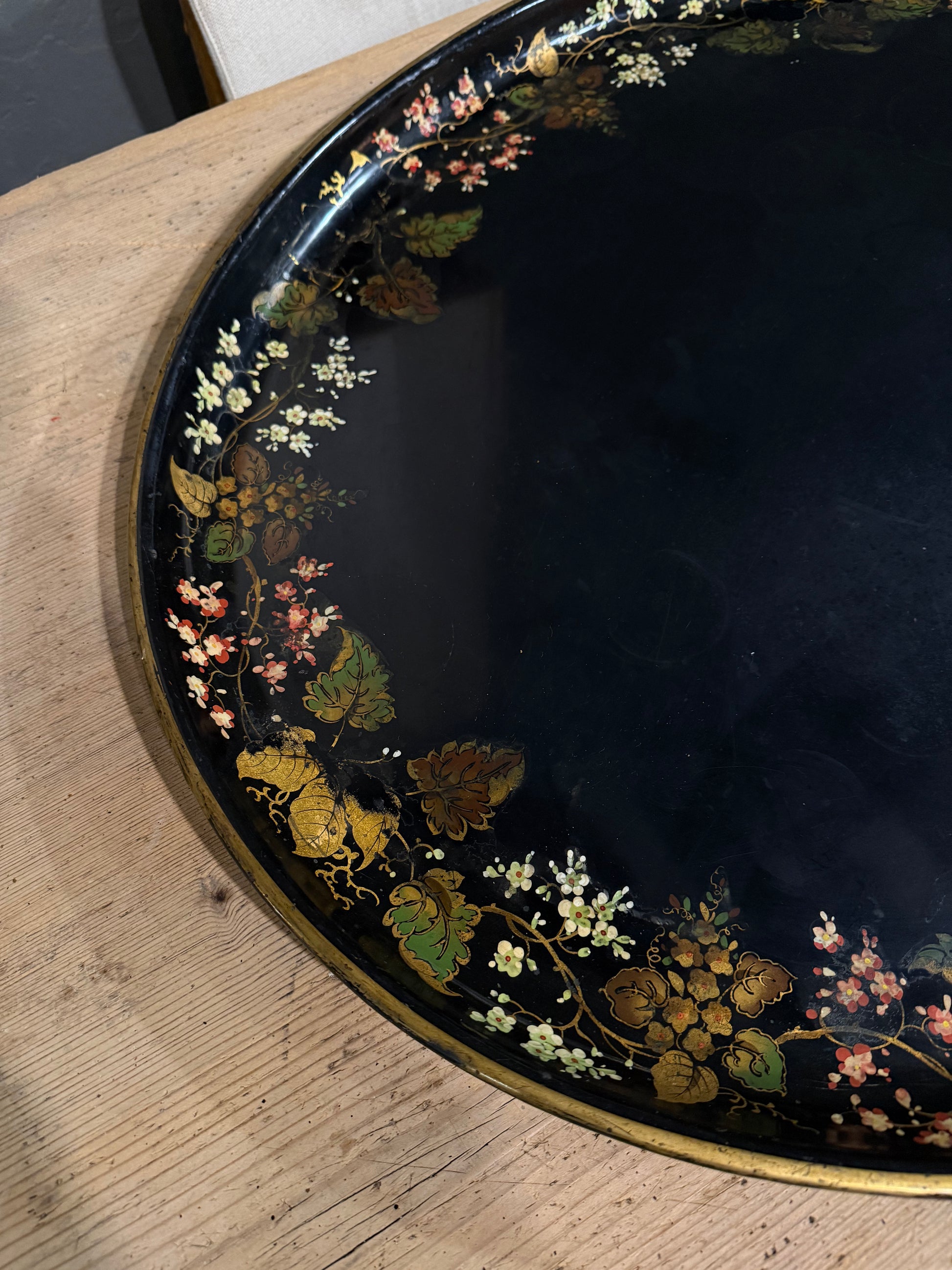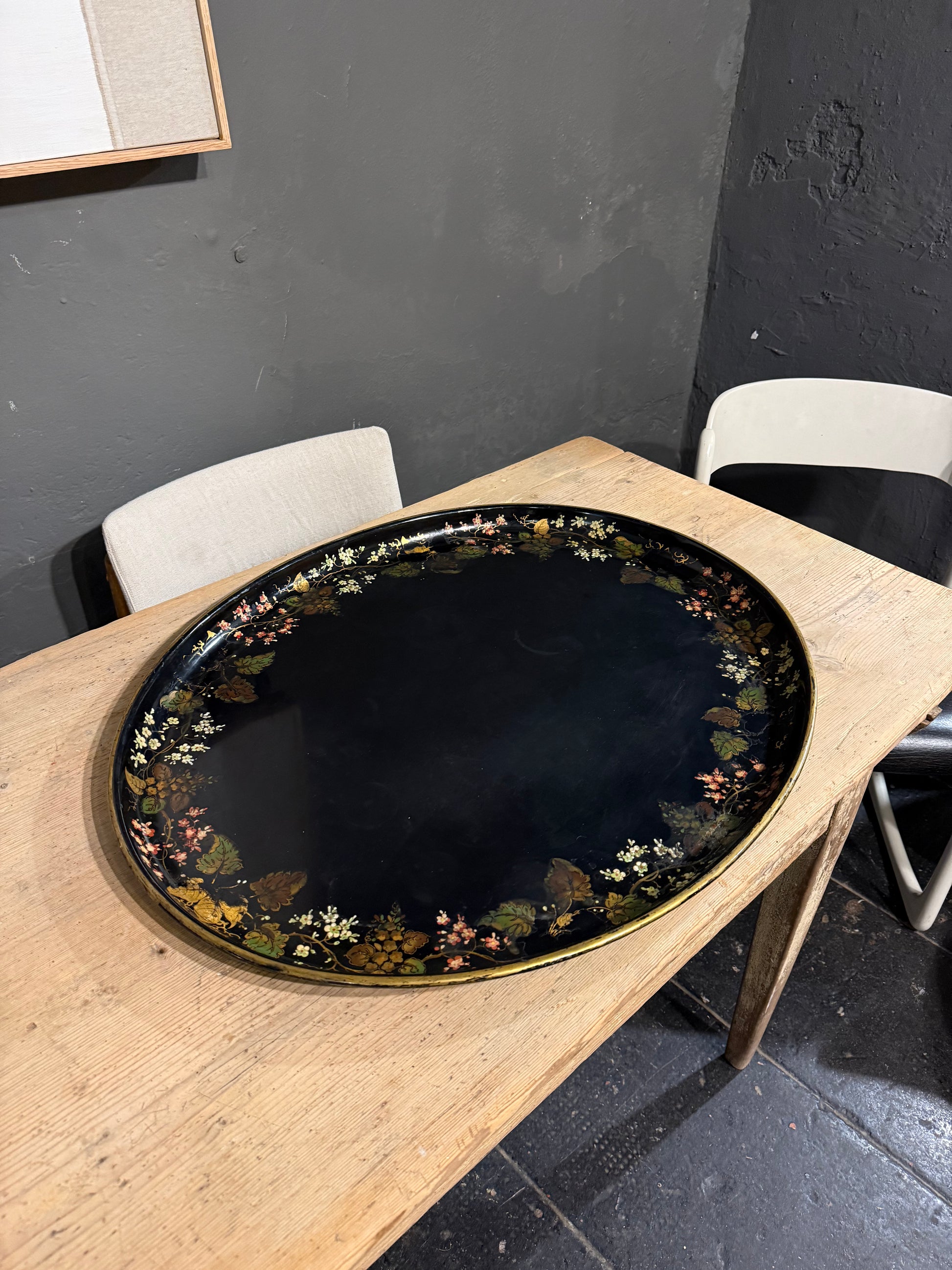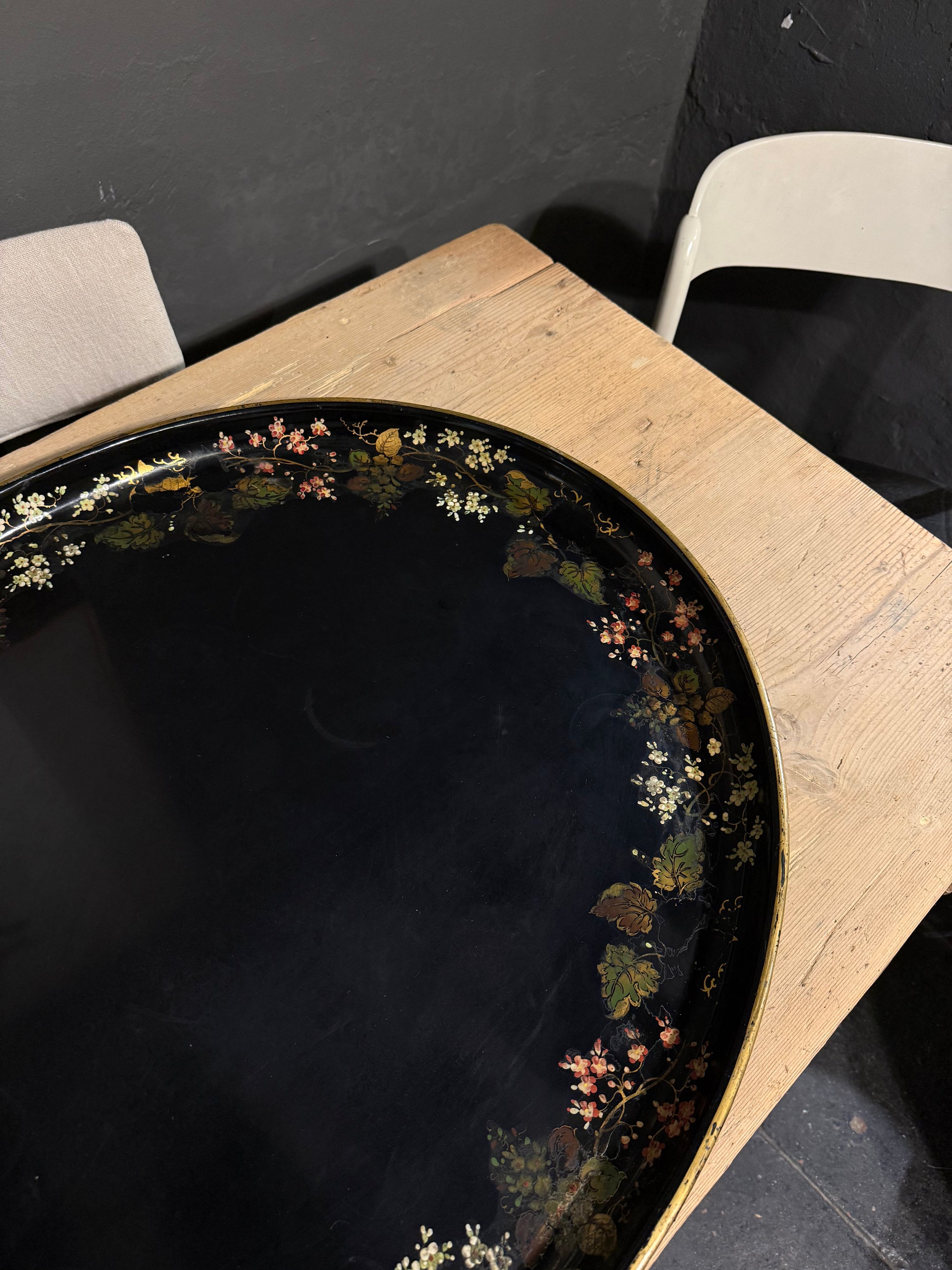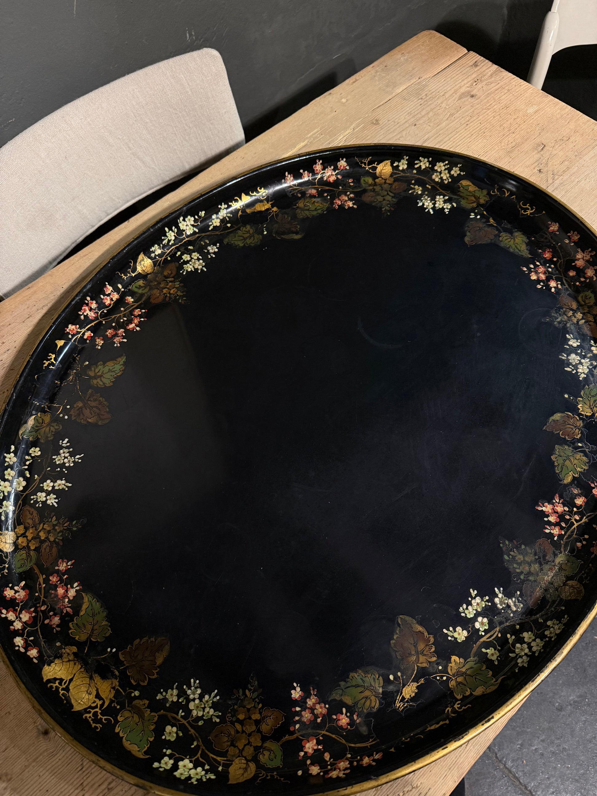 Bandeja ovalada en hierro lacado en negro, decorada con un borde floral exquisito, trabajado al detalle.