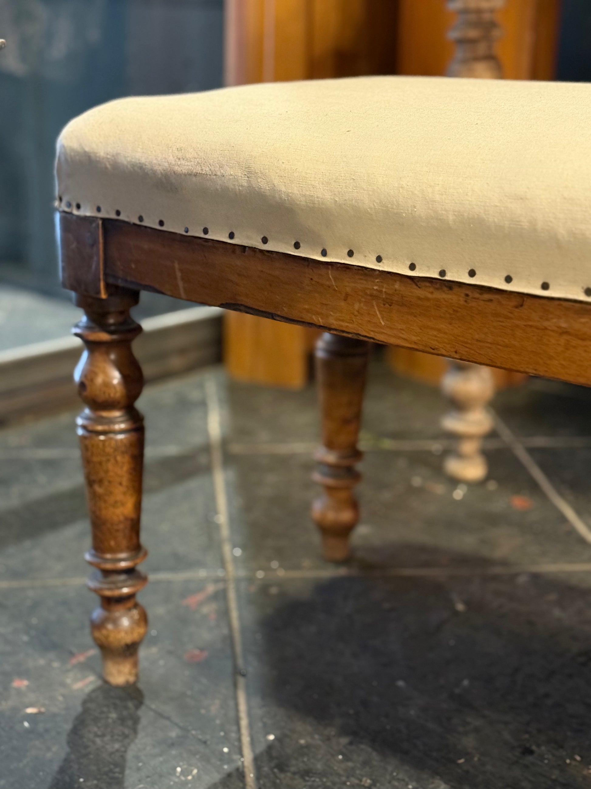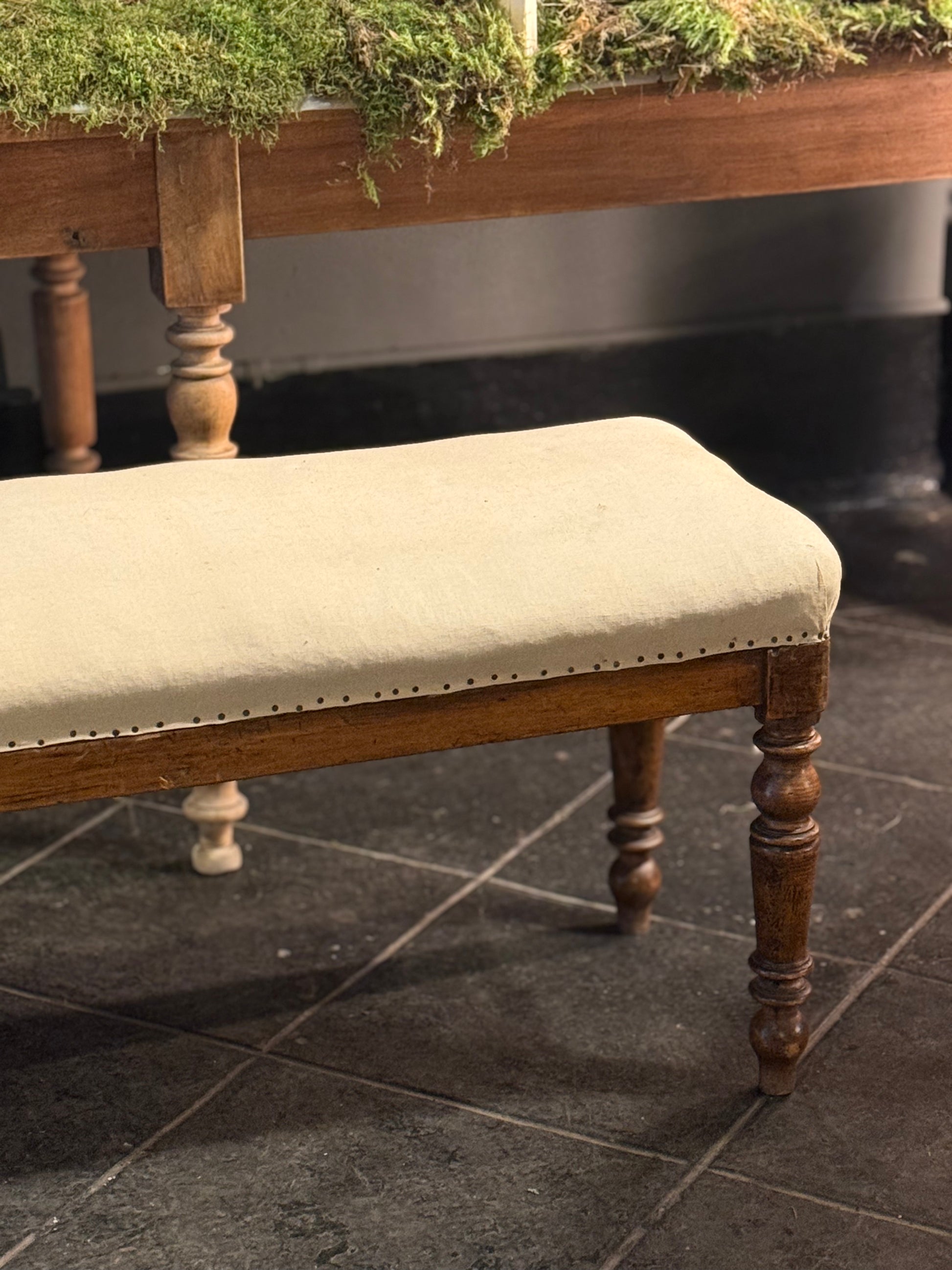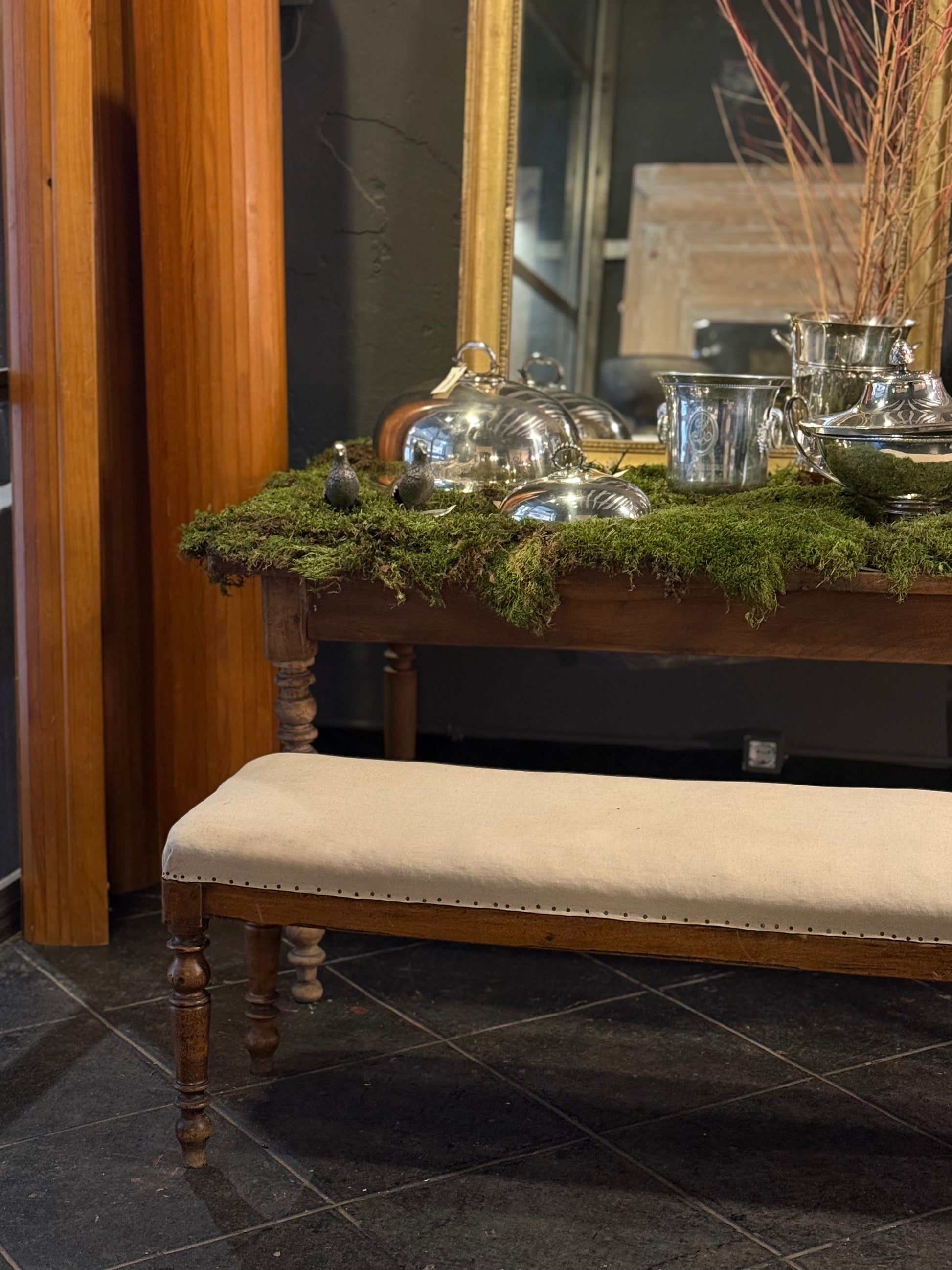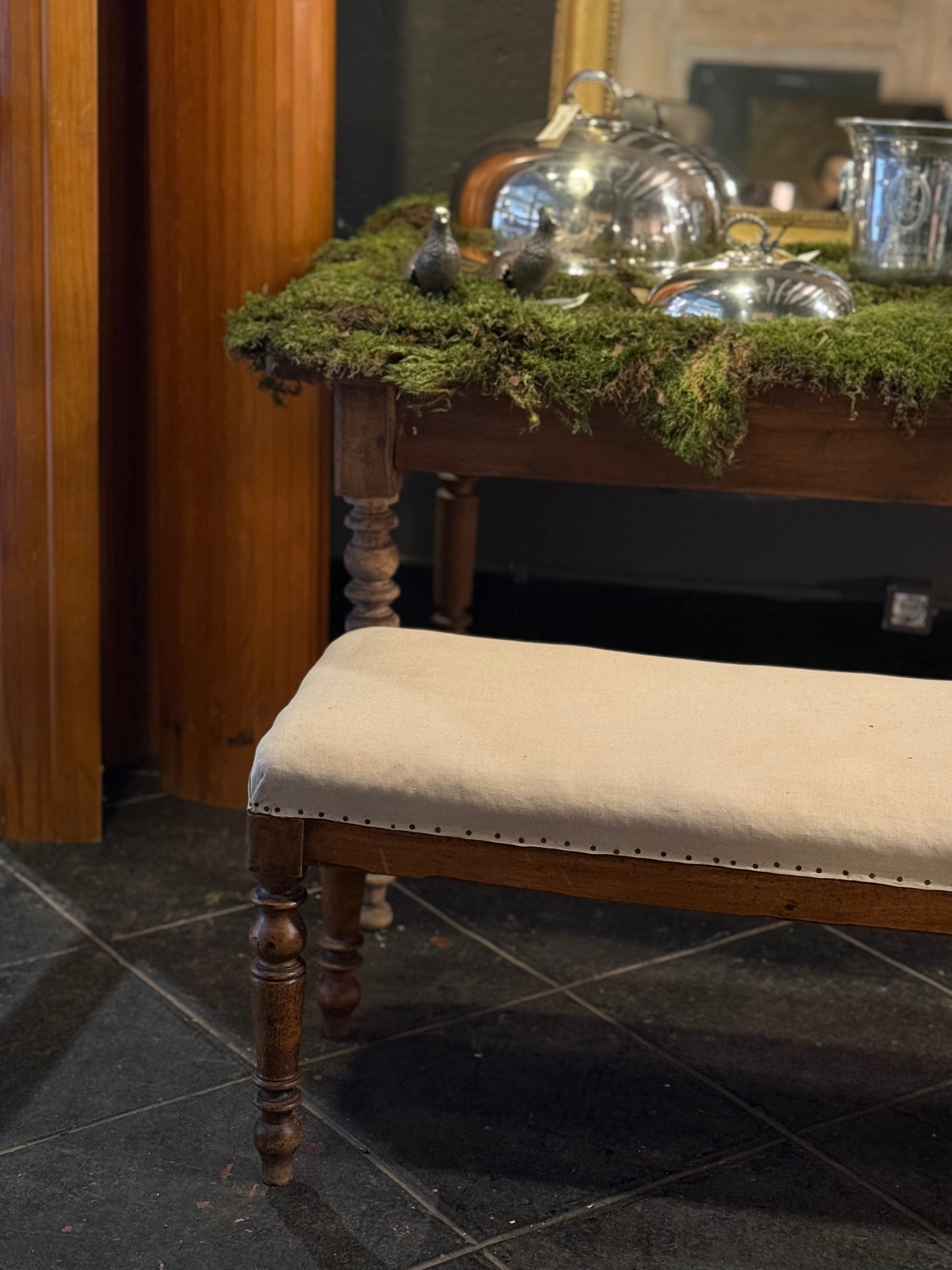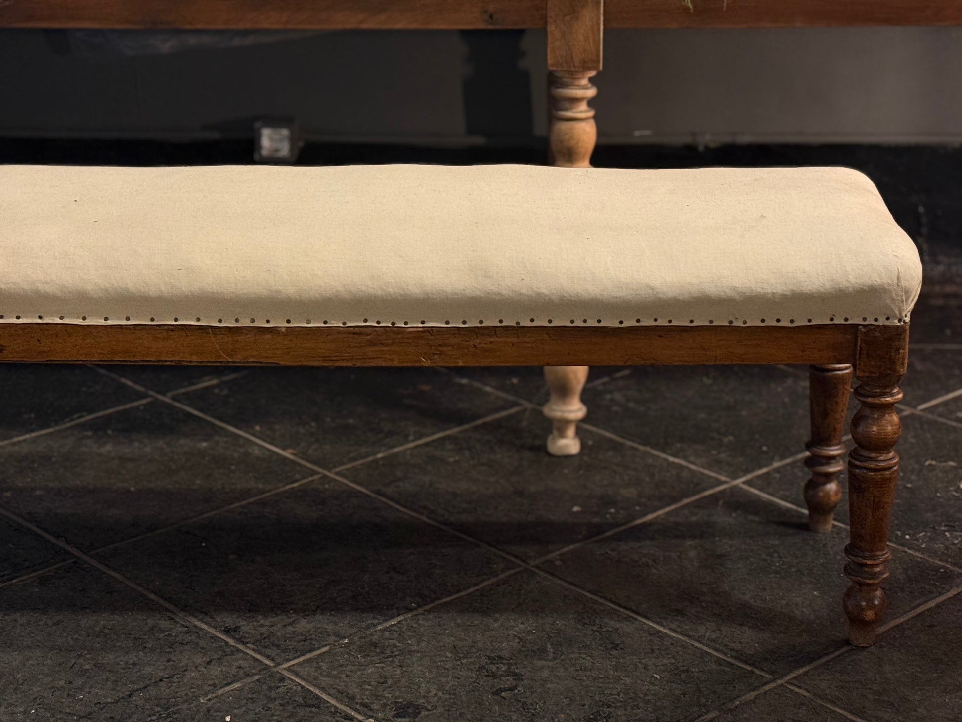 Preciosa banqueta de nogal con estructura robusta y líneas clásicas, presentada destapizada para que puedas personalizarla a tu gusto. Su madera noble y su diseño refinado la convierten en una pieza versátil y con muchísima presencia.
