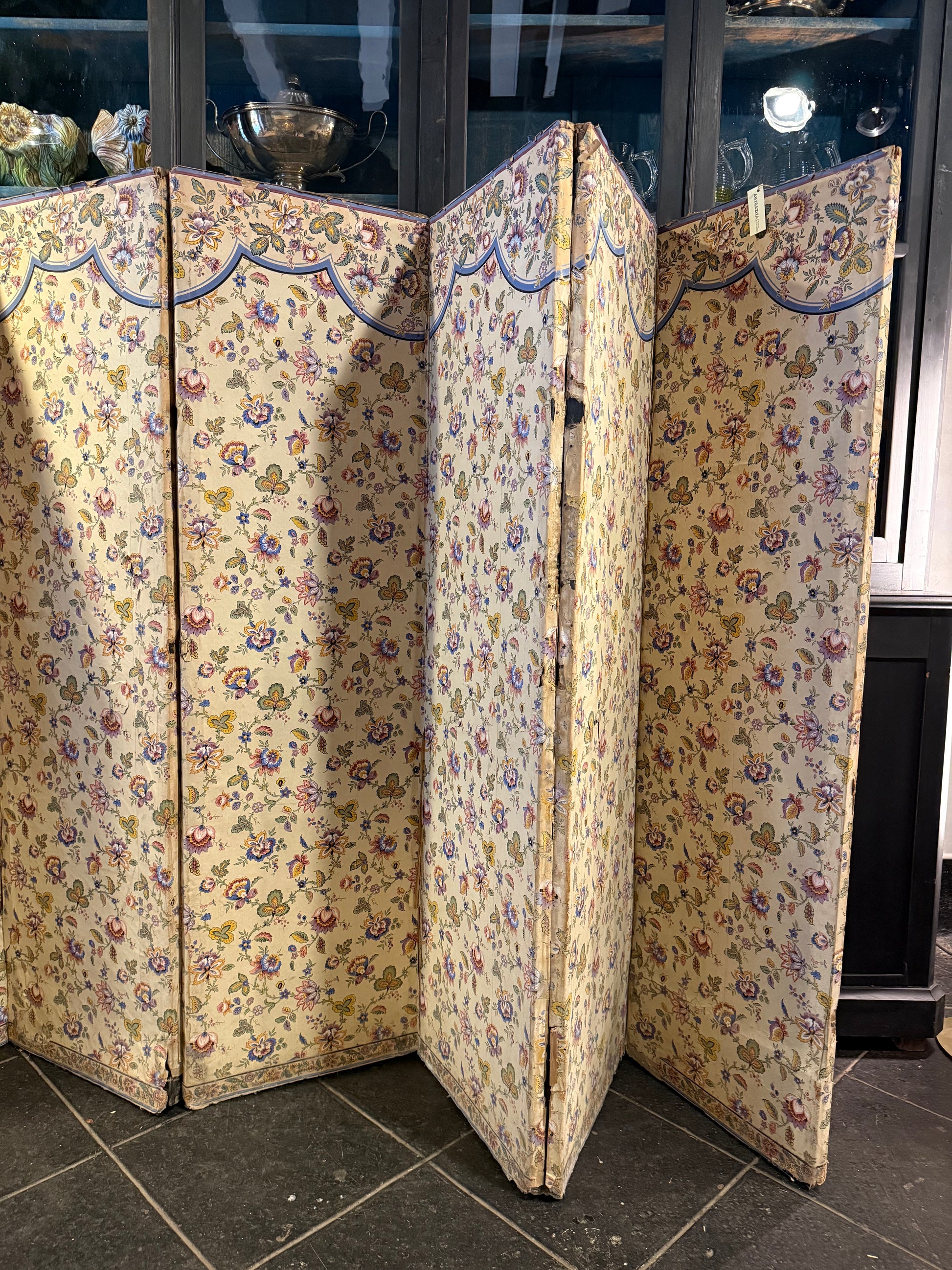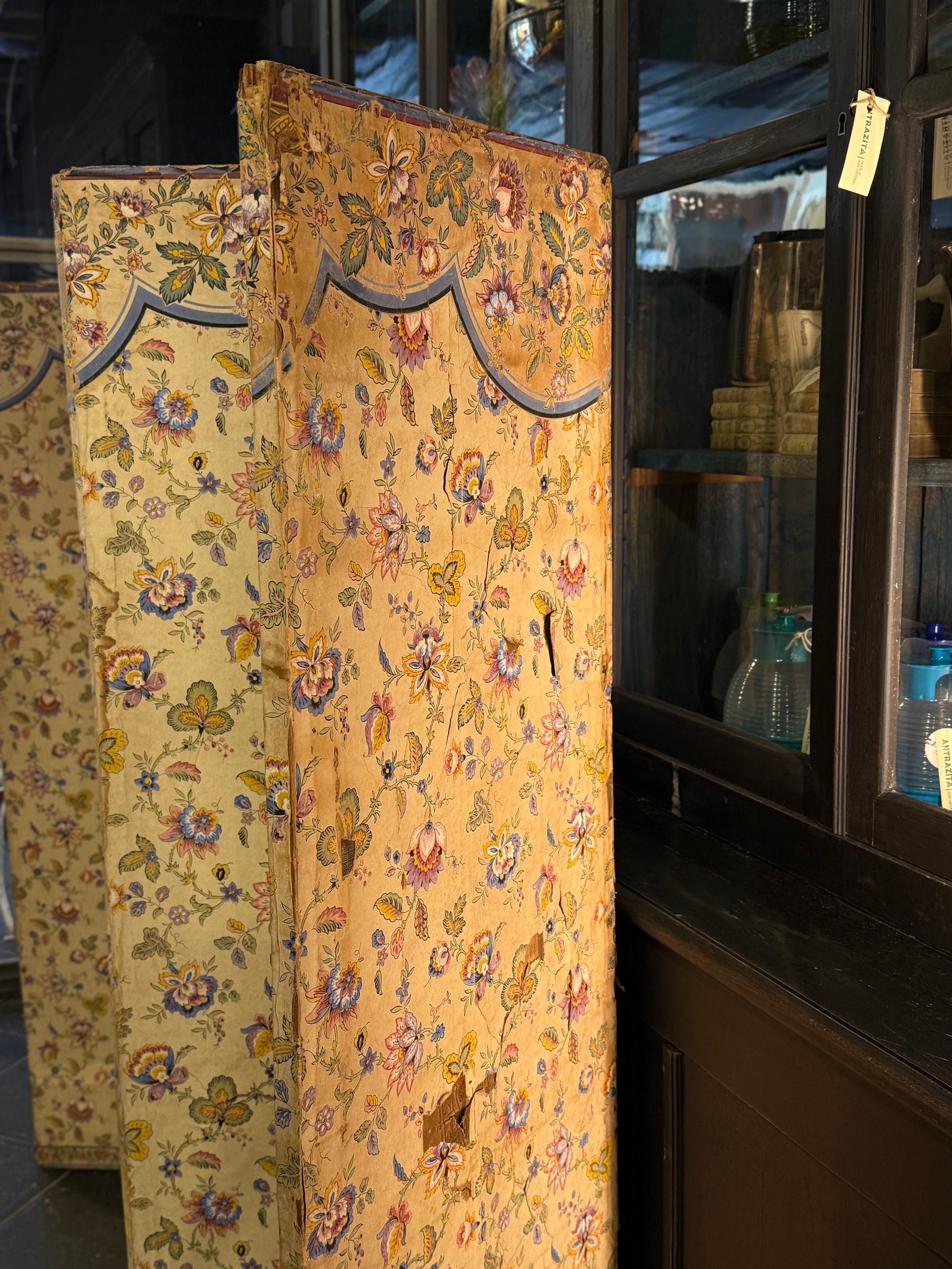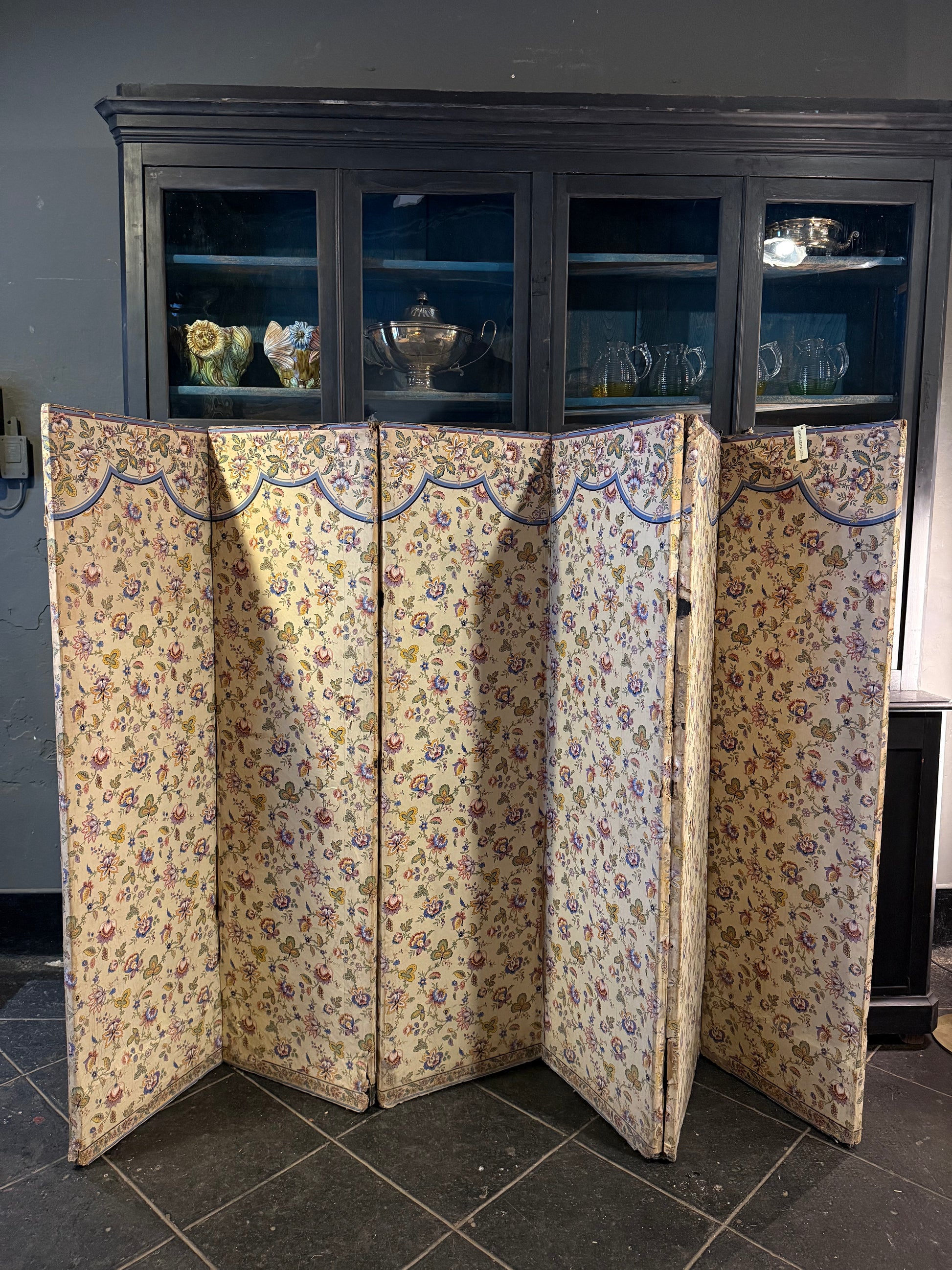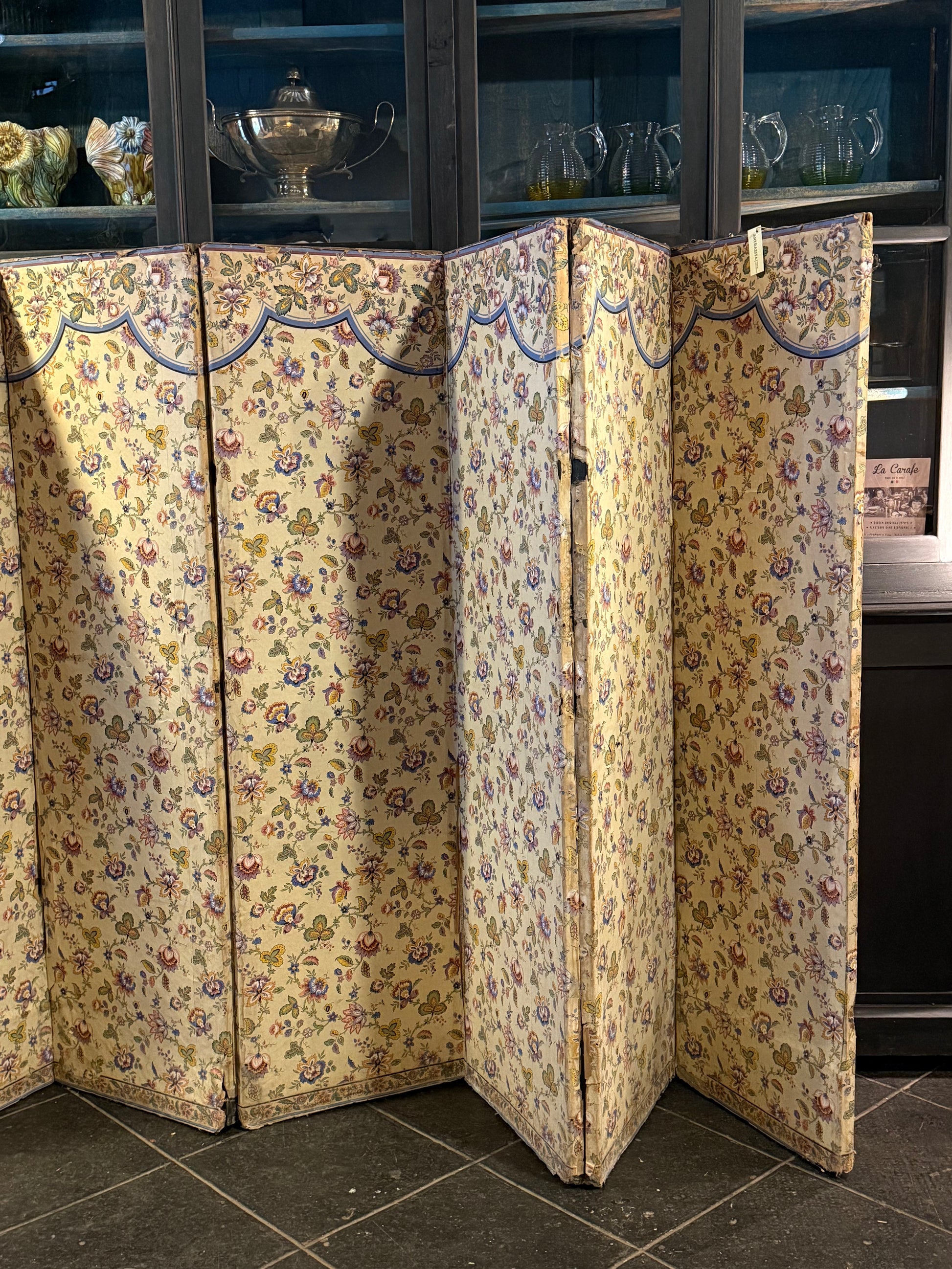 Impresionante biombo francés del siglo XIX, compuesto por seis paneles articulados, decorado con un delicado estampado floral sobre papel. Una pieza decorativa única, con gran presencia y un aire romántico que transforma cualquier espacio.