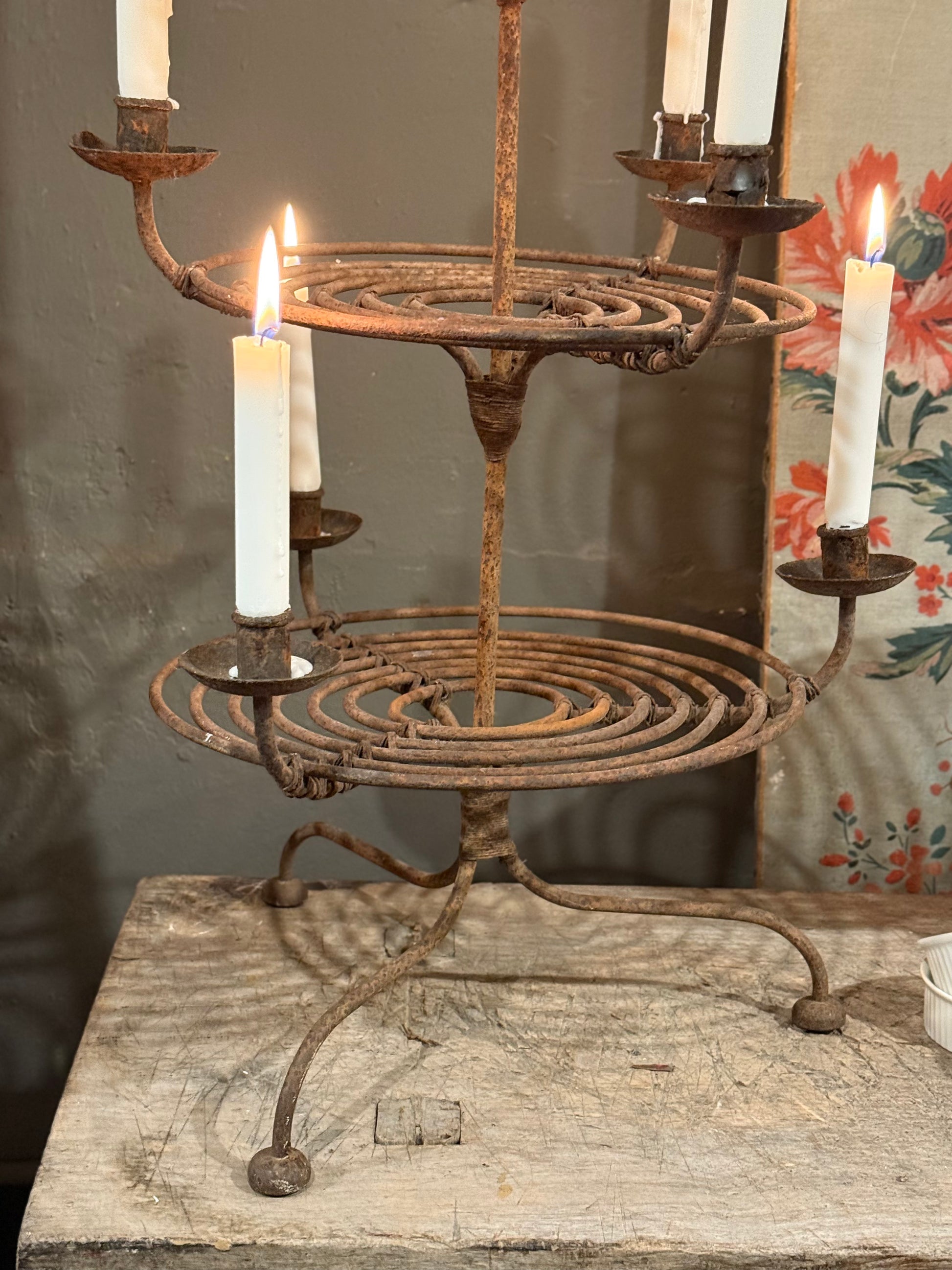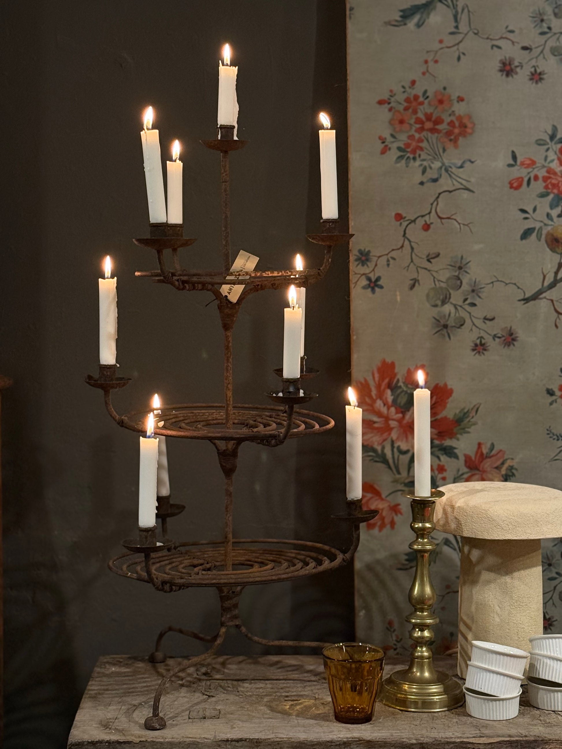 Imponente candelabro antiguo con capacidad para 10 velas, distribuido en 4 alturas diferentes que crean un juego visual precioso y muy escultural. Su acabado con óxido natural aporta un carácter único y una pátina auténtica que lo convierte en una pieza decorativa con muchísima personalidad.