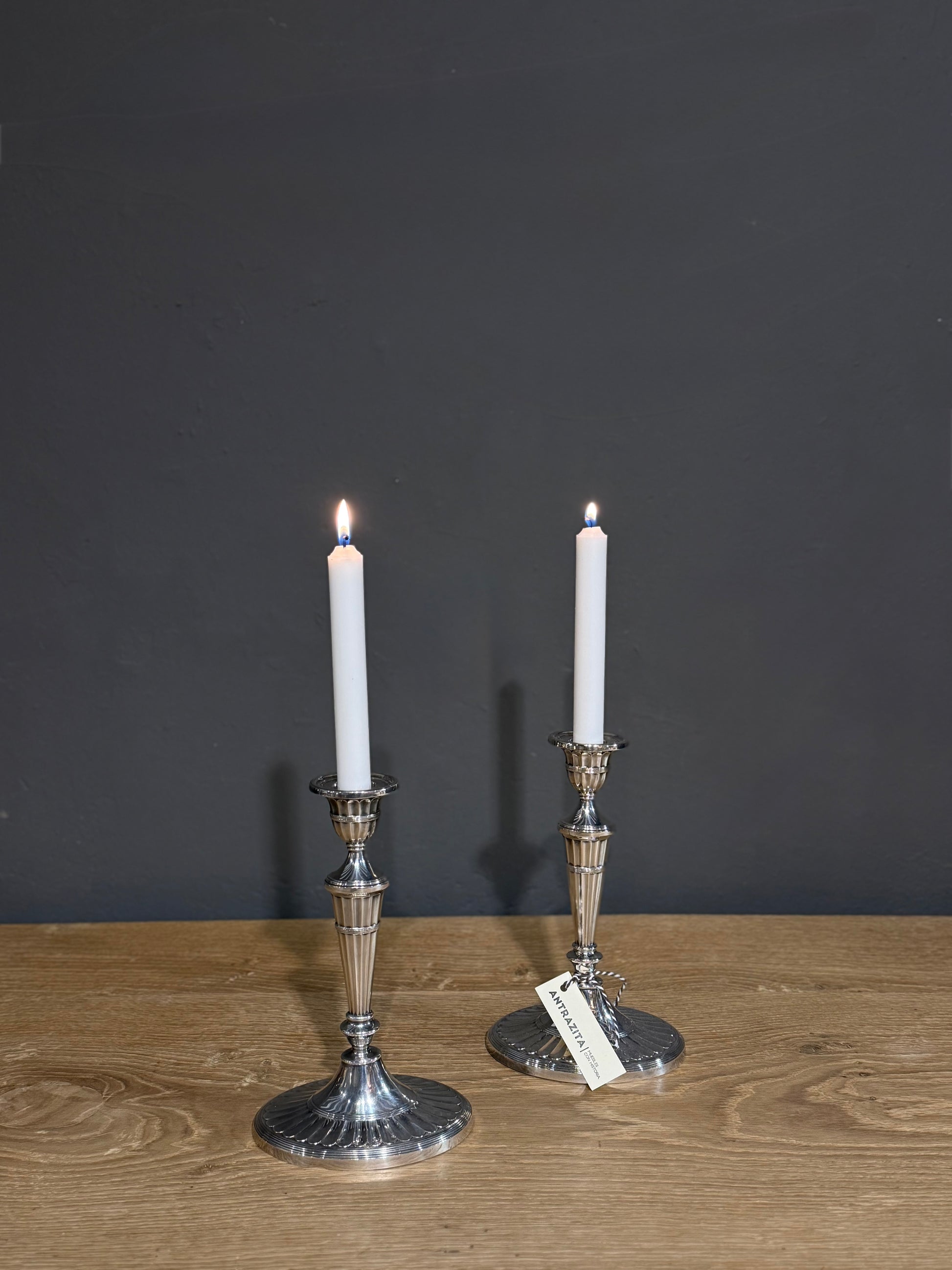 Preciosa pareja de candeleros antiguos realizados en metal plateado, con un diseño clásico y refinado que aporta luz y elegancia a cualquier ambiente. Su silueta esbelta y su acabado envejecido les confieren un encanto atemporal, perfecto para integrar tanto en interiores contemporáneos como en decoraciones más tradicionales.