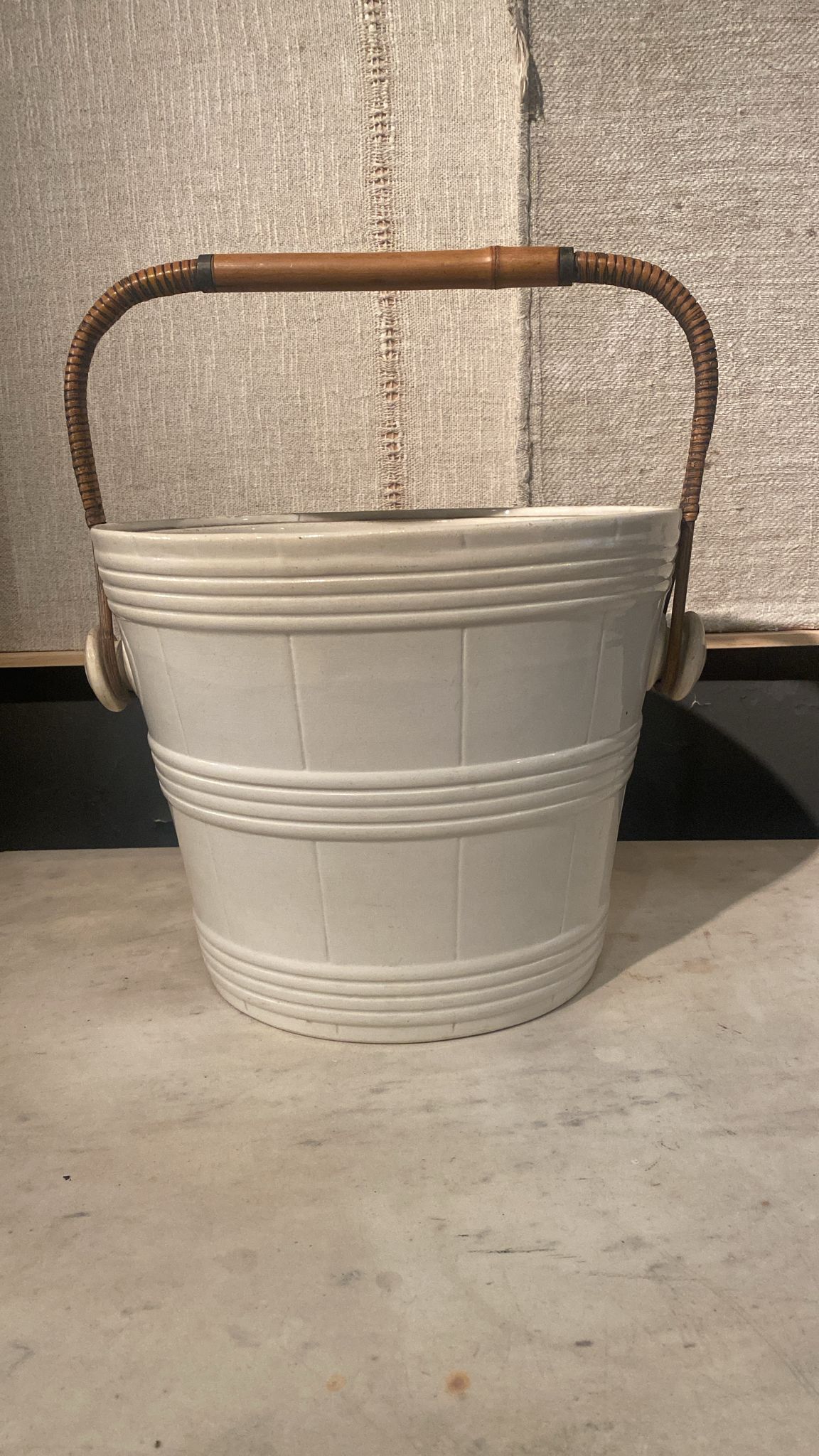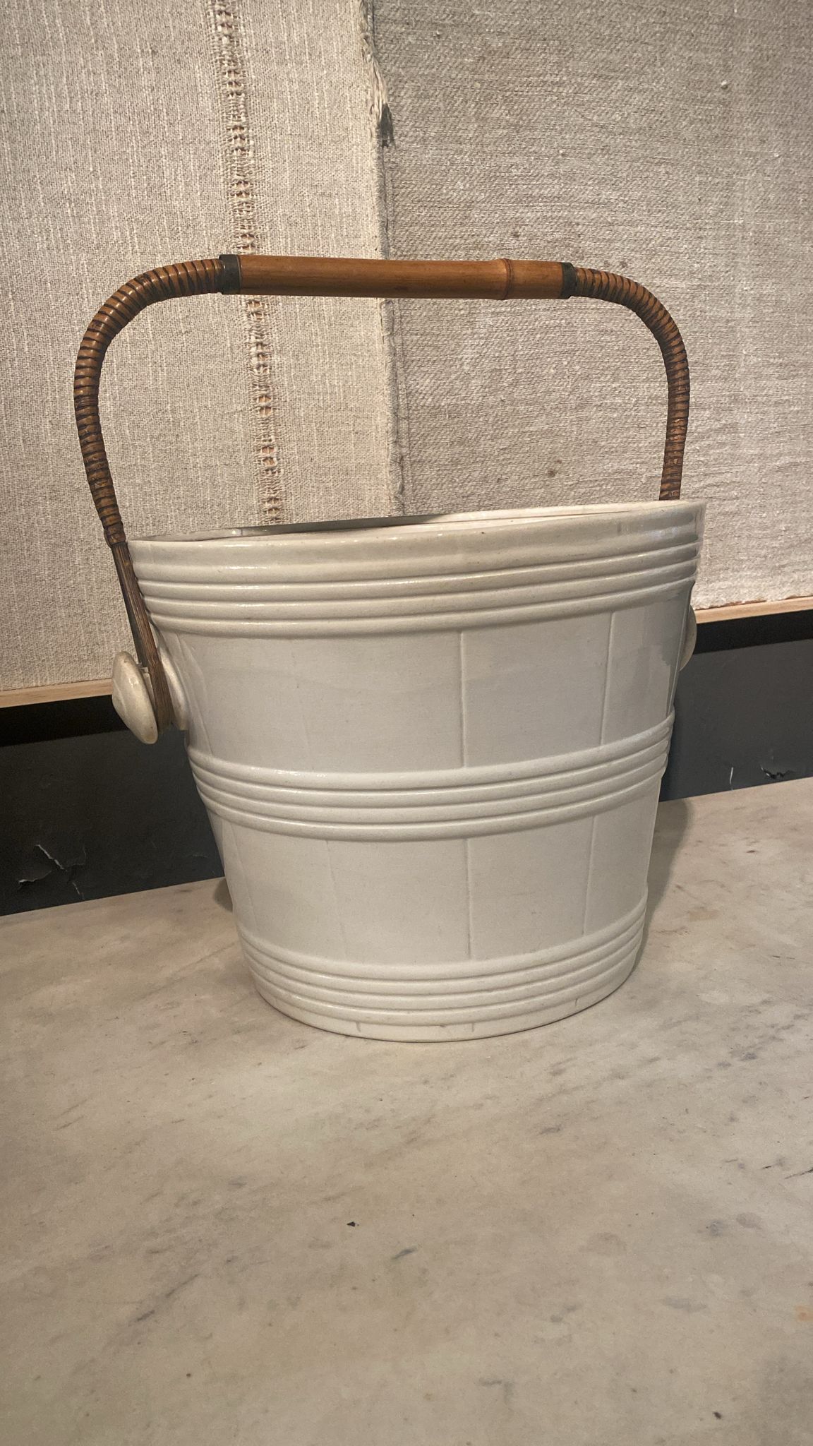 Precioso enfriador de loza blanca Opaque de Sarreguemines, una pieza francesa llena de encanto y carácter. Su diseño sobrio y elegante, típico de la reconocida manufactura, lo convierte en un elemento decorativo y funcional perfecto para cualquier mesa o estancia.