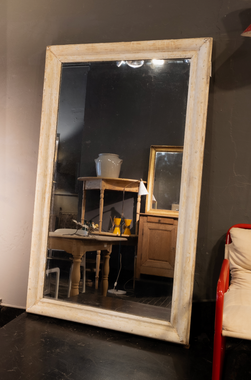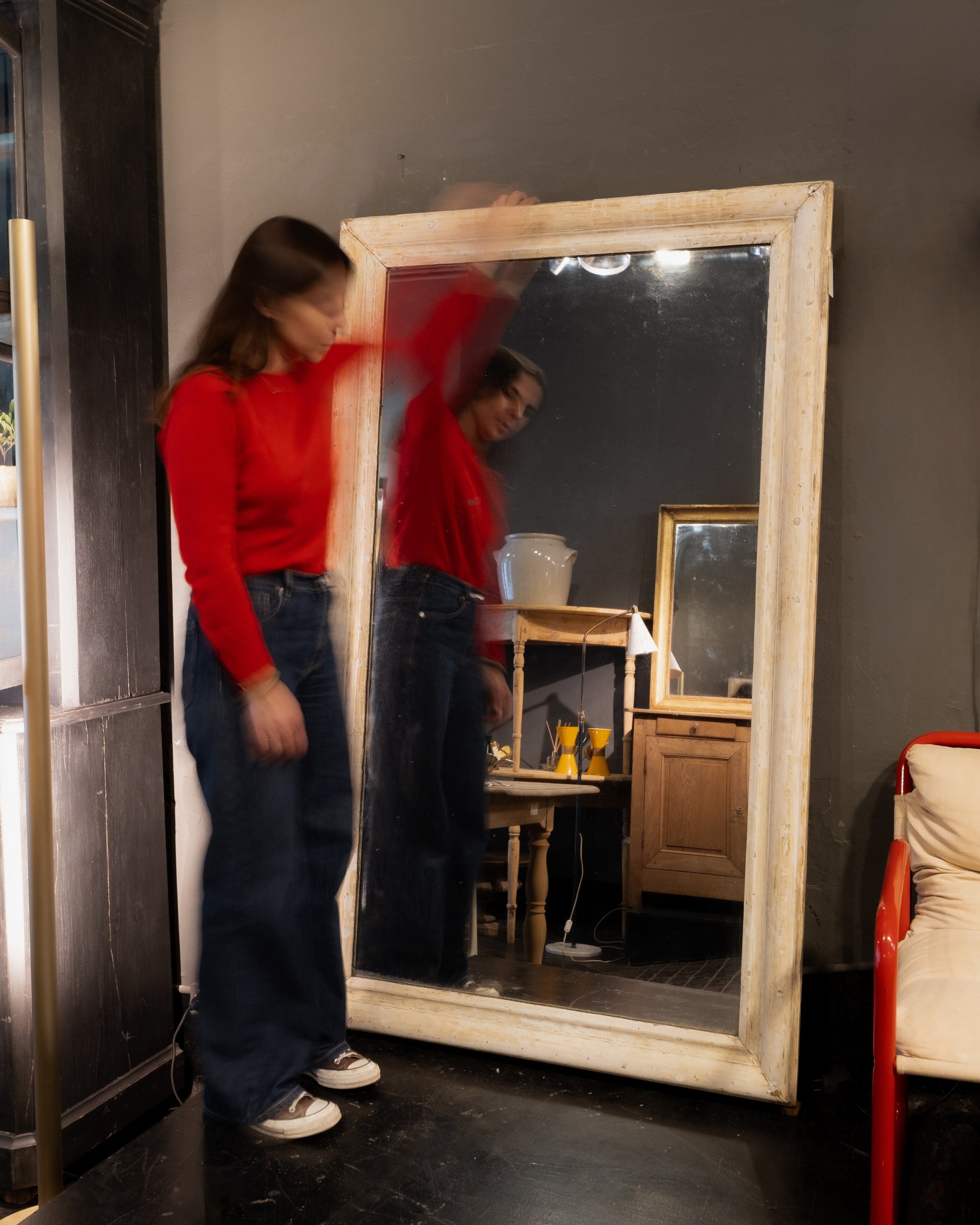 Un imprescindible para ampliar espacios y aportar luz de forma natural. Este espejo de gran formato, con marco trabajado en madera y acabado en pátina blanca, es perfecto para crear ambientes cálidos y elegantes.