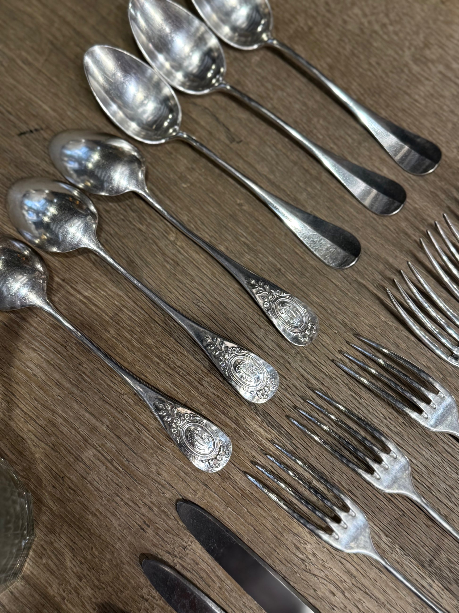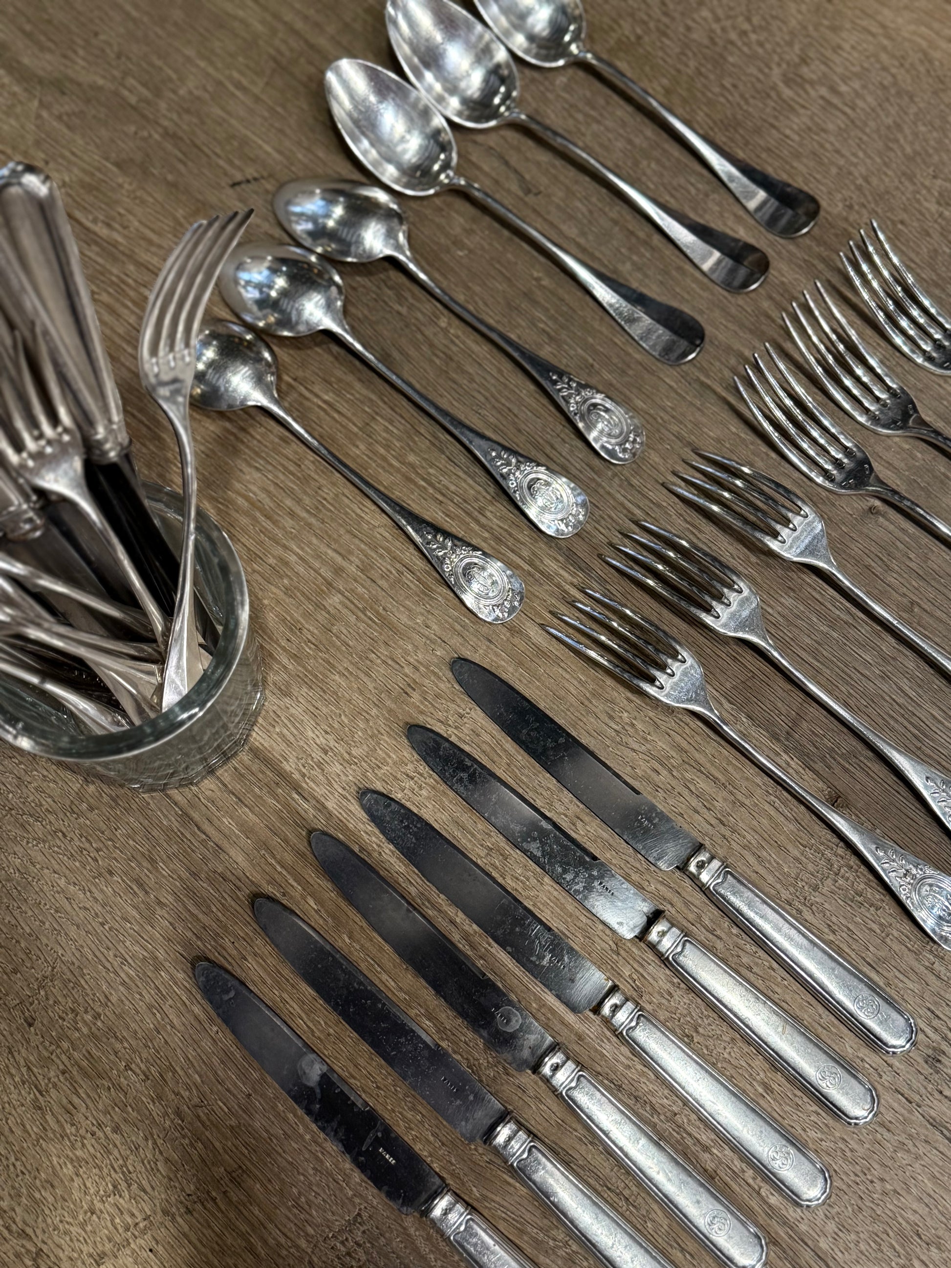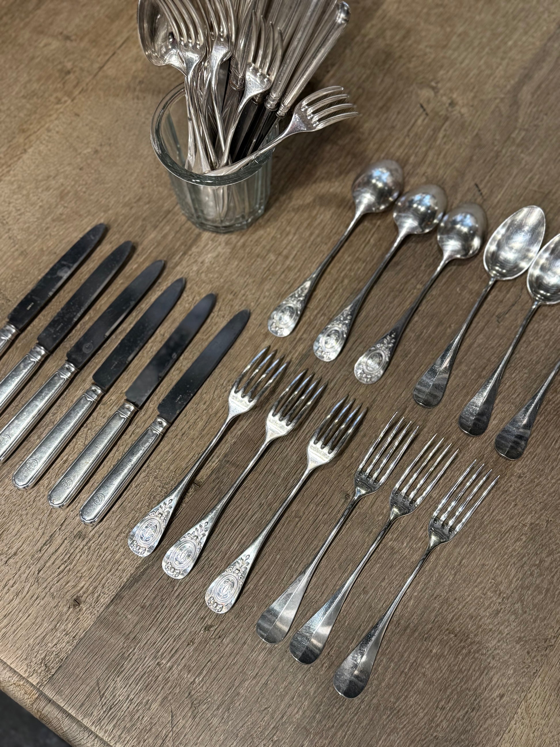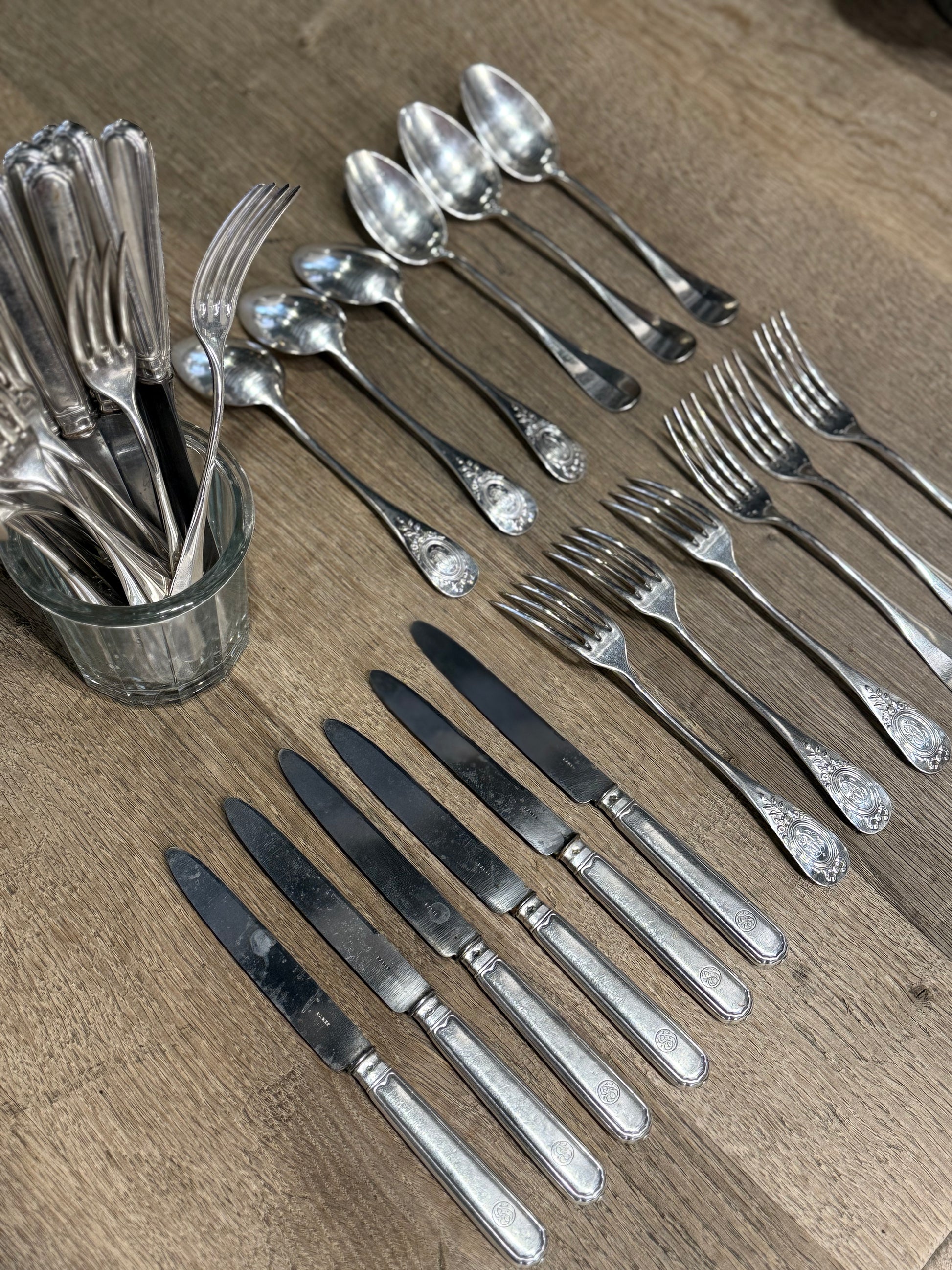Precioso conjunto de cubiertos de alpaca, con un diseño clásico y elegante que refleja el refinamiento de las mesas antiguas. Cada pieza presenta un delicado trabajo en el mango y un brillo atemporal propio de la alpaca, material muy apreciado por su resistencia y su belleza similar a la plata.