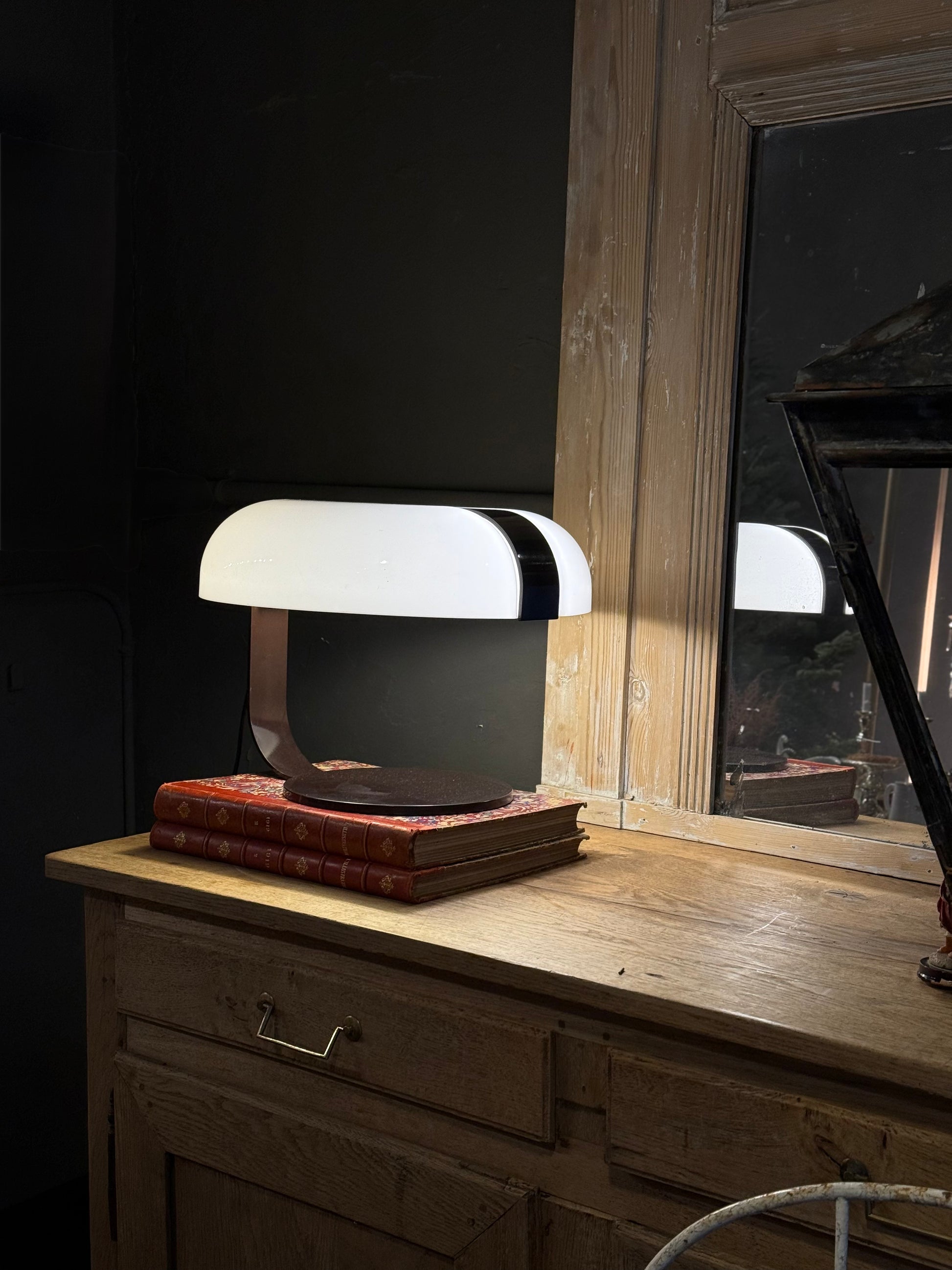 Lámpara de mesa italiana moderna de los años 70, realizada en metal marrón y plástico blanco. Con un diseño limpio y equilibrado, esta pieza refleja a la perfección la estética funcional y elegante del diseño italiano de mediados del siglo XX.