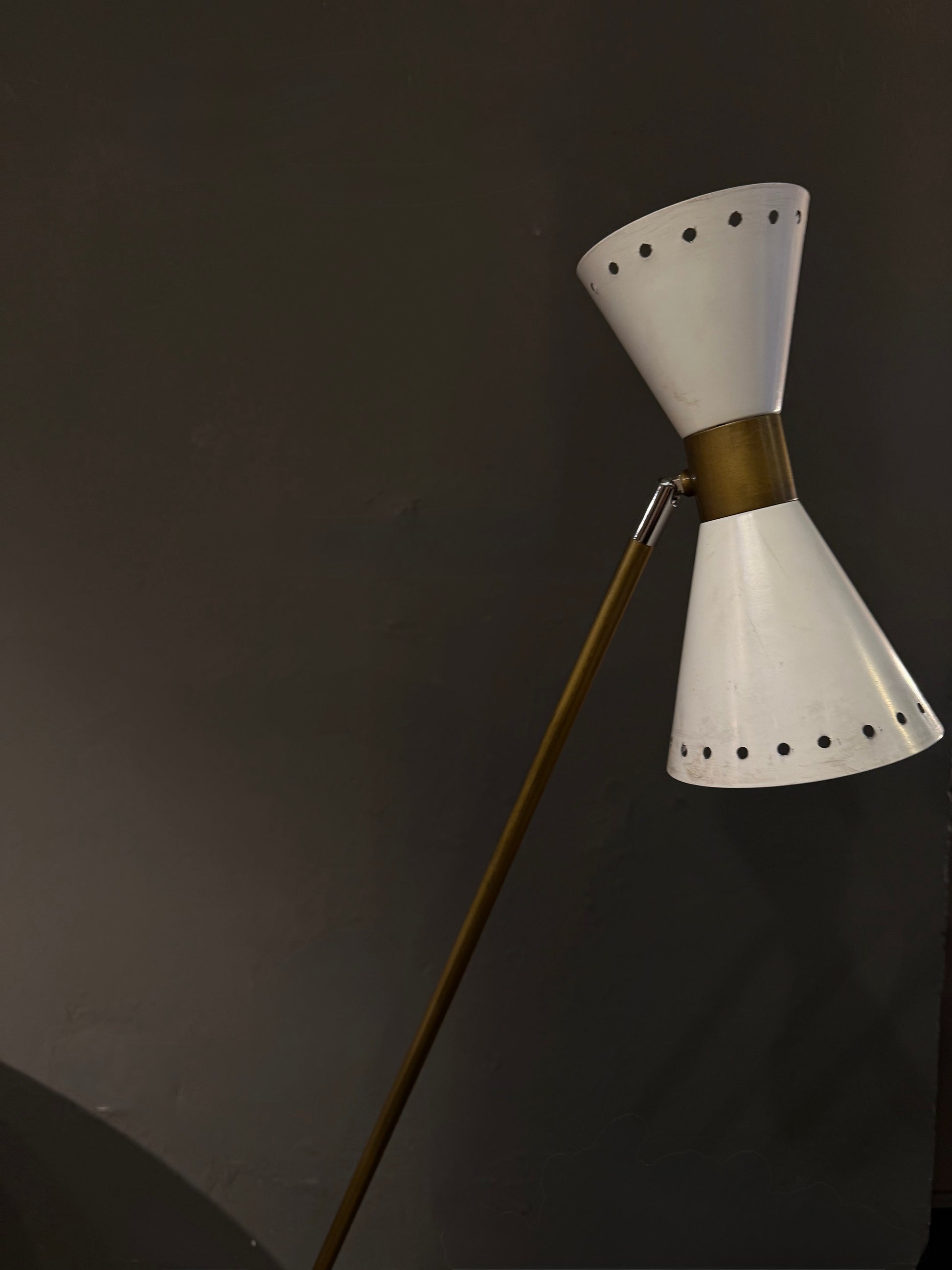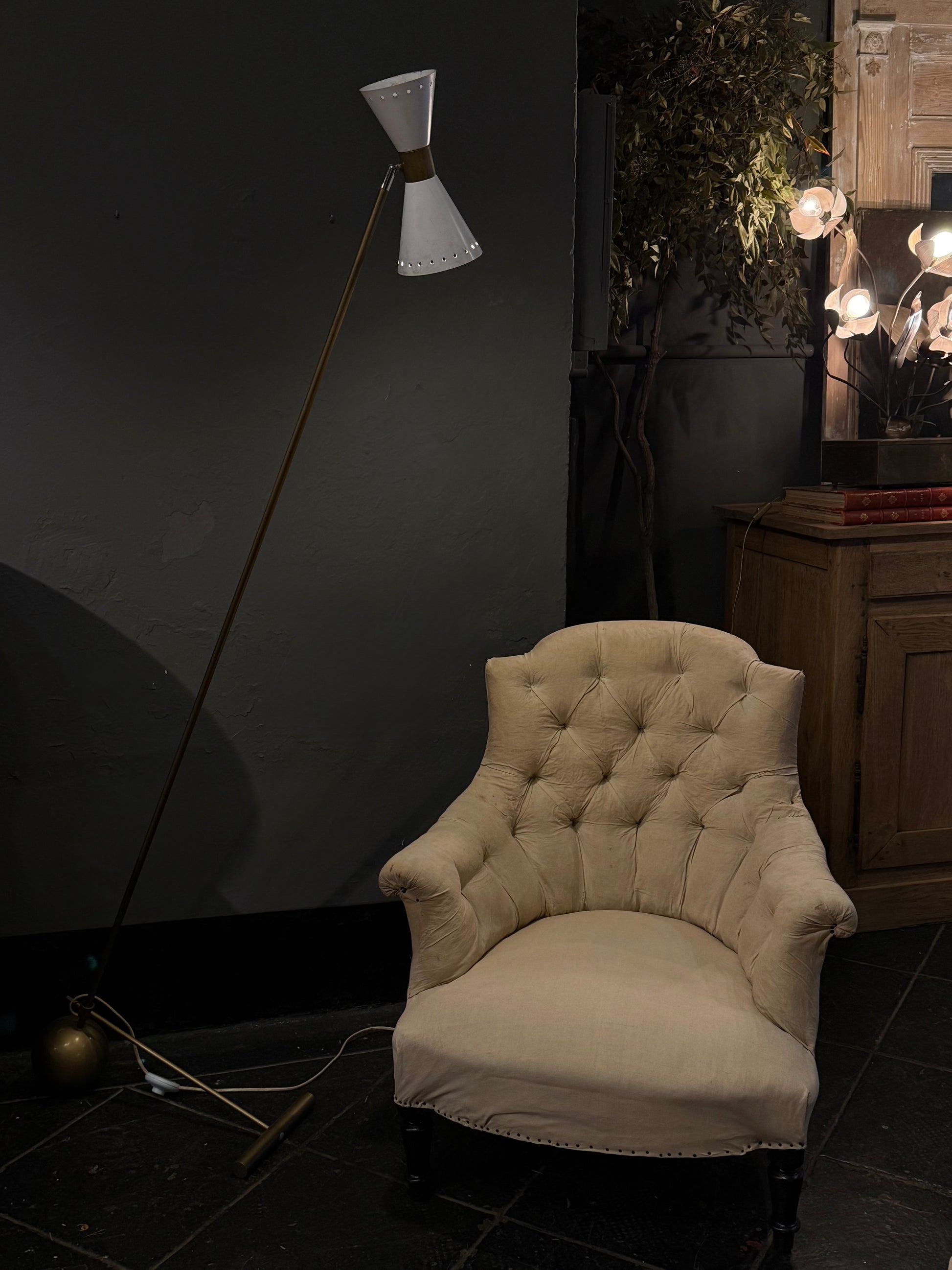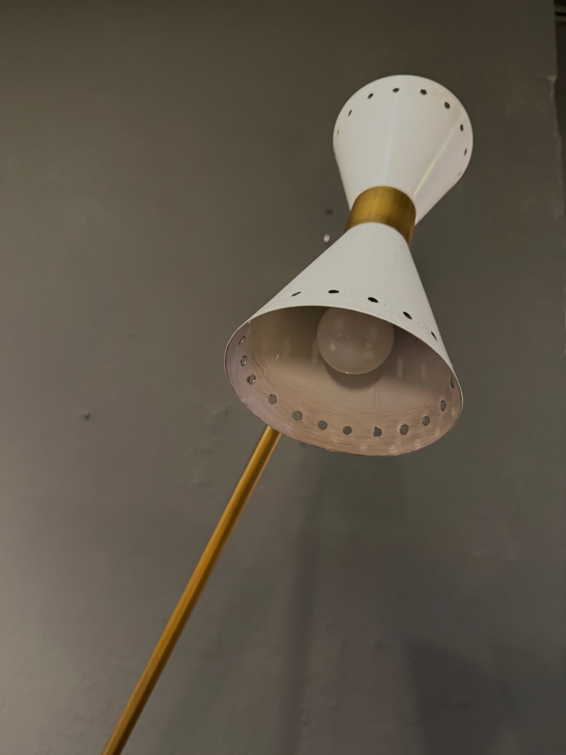 Lámpara de pie vintage de estética italiana, con una silueta elegante y dinámica que combina latón y metal lacado. Su diseño estilizado y su base esférica le aportan una presencia escultórica, ligera y muy sofisticada.