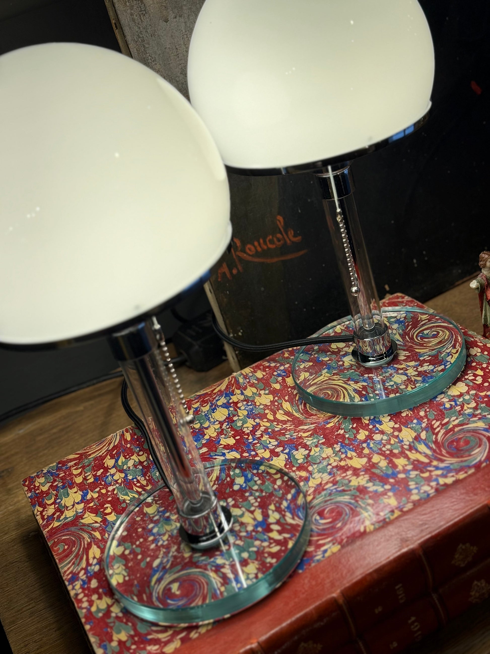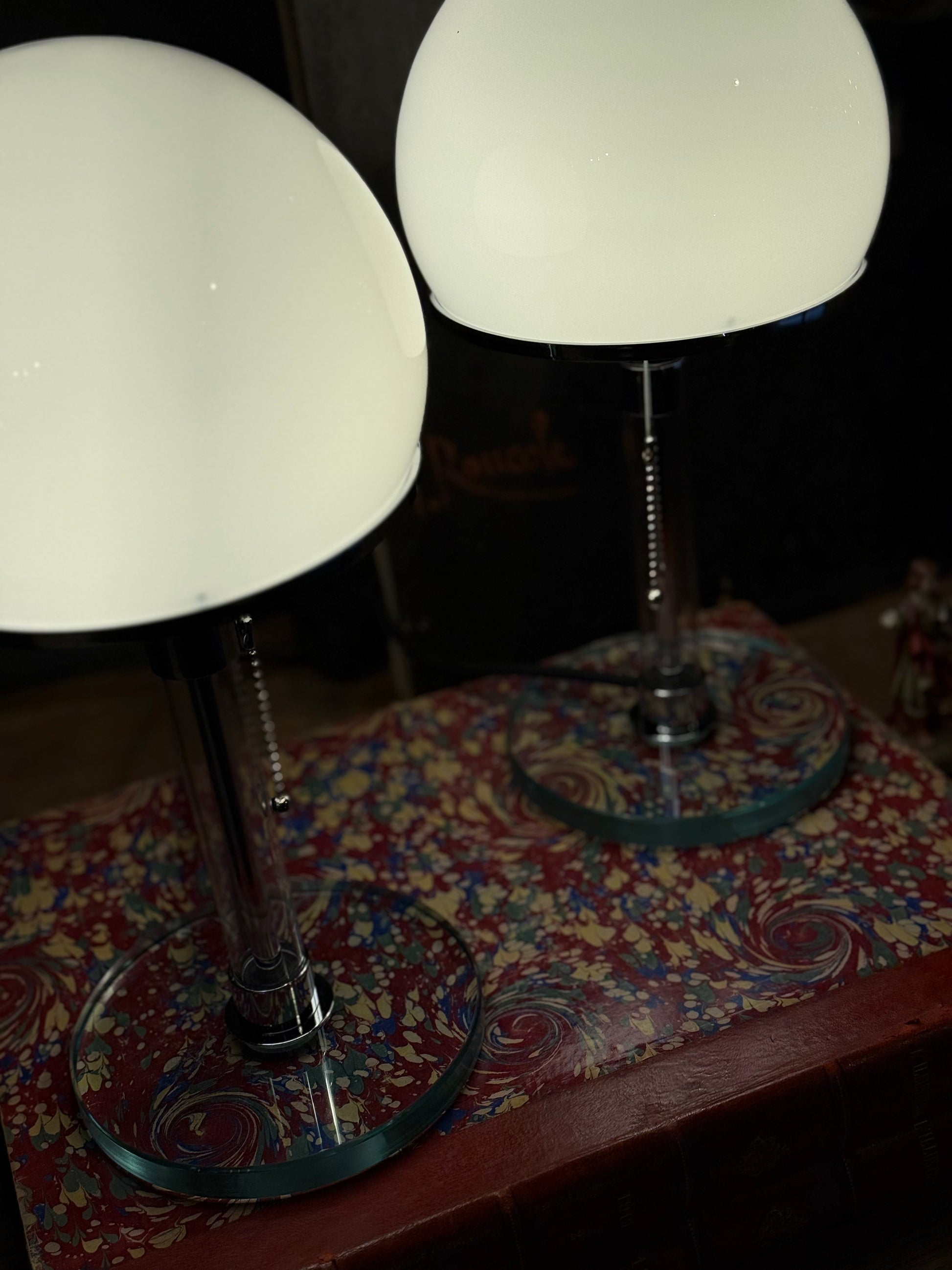Su silueta —pantalla hemisférica, vástago cilíndrico y base circular de vidrio— resume la esencia del lenguaje Bauhaus: claridad, proporción y belleza sin artificios.