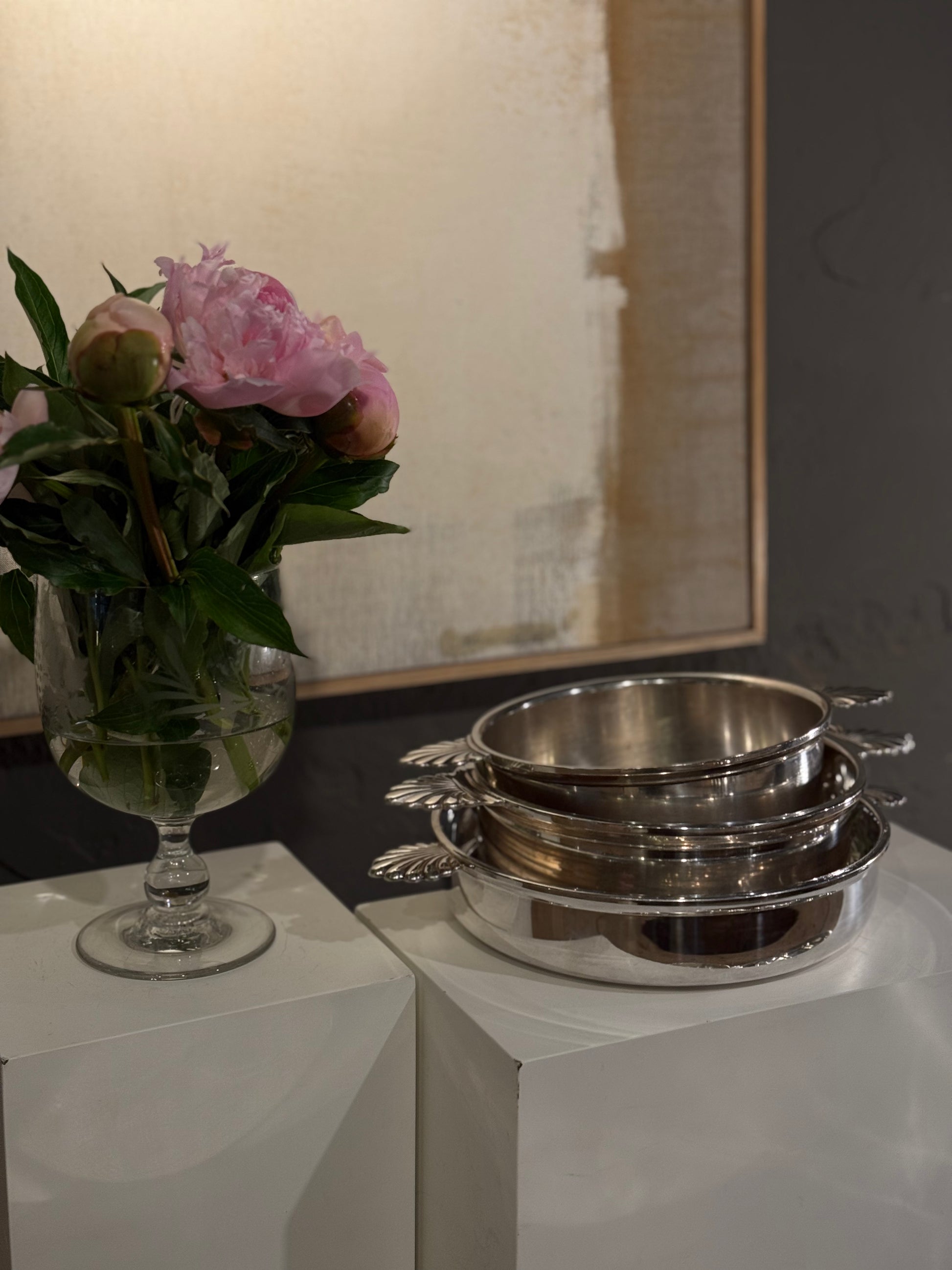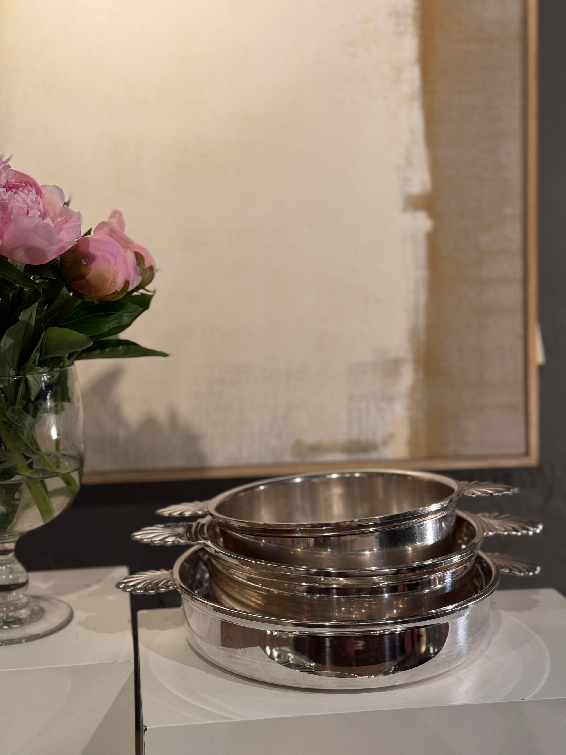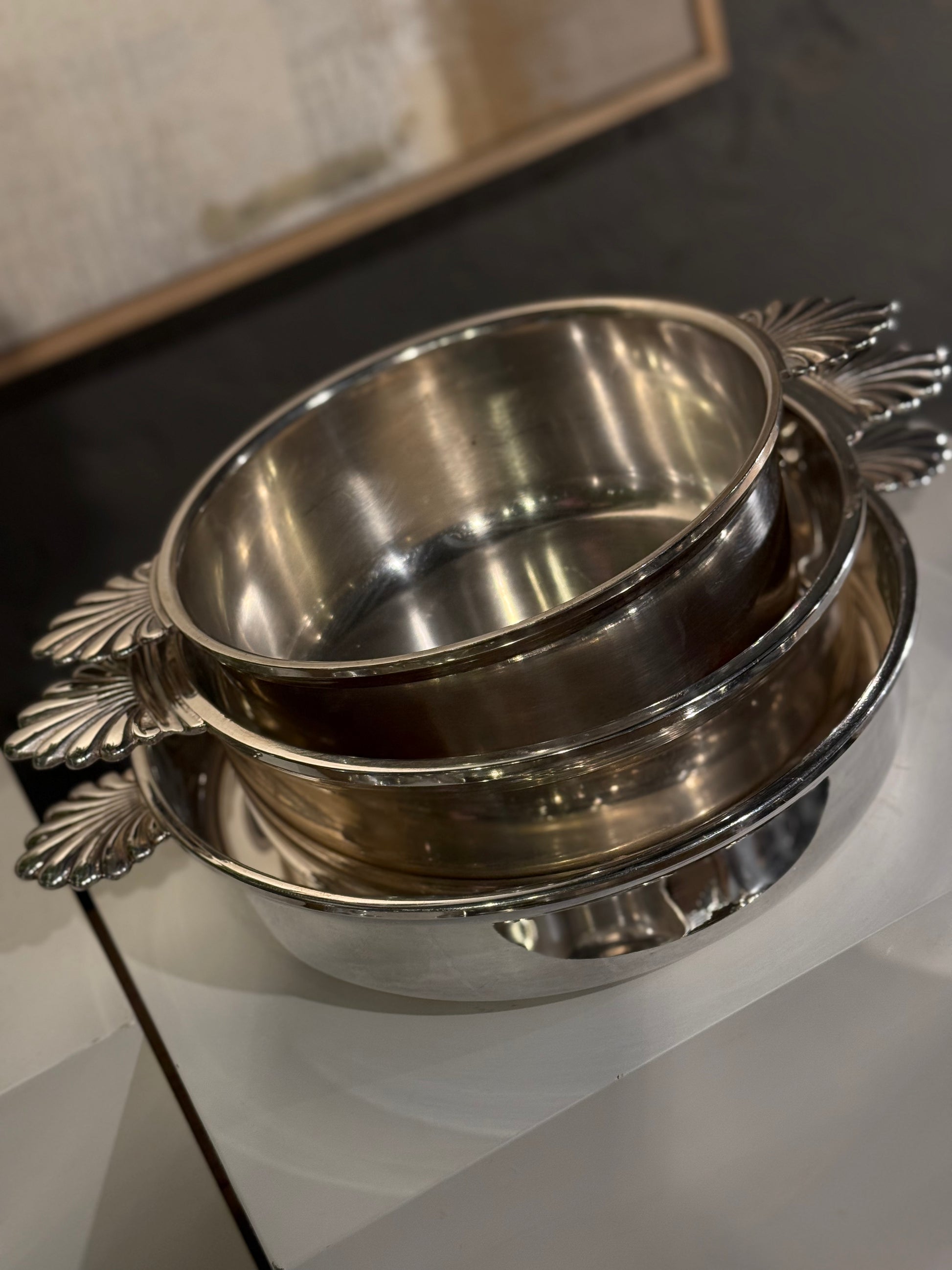 Elegantes y llenas de carácter, estas legumbreras redondas de alpaca son mucho más que piezas utilitarias: son verdaderos objetos decorativos con historia. Su acabado en metal plateado envejecido les da un aire clásico y sofisticado, mientras que el delicado detalle en forma de concha en el extremo añade un toque distintivo y refinado.
