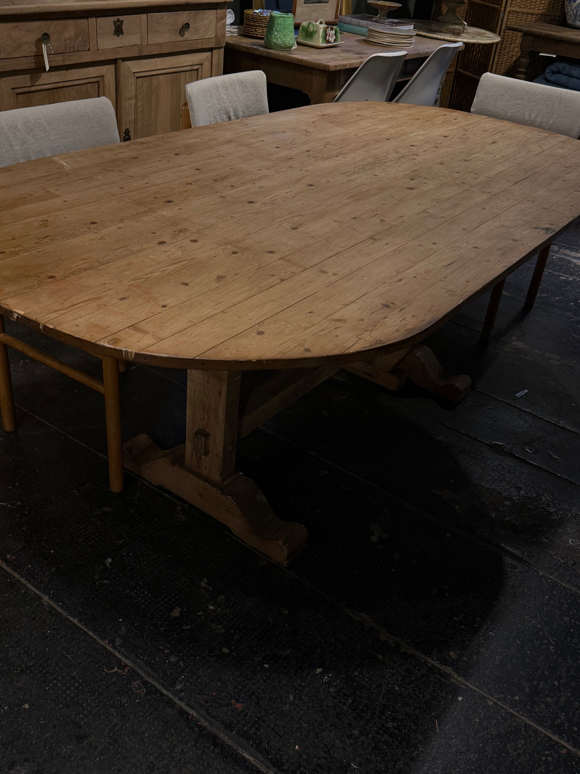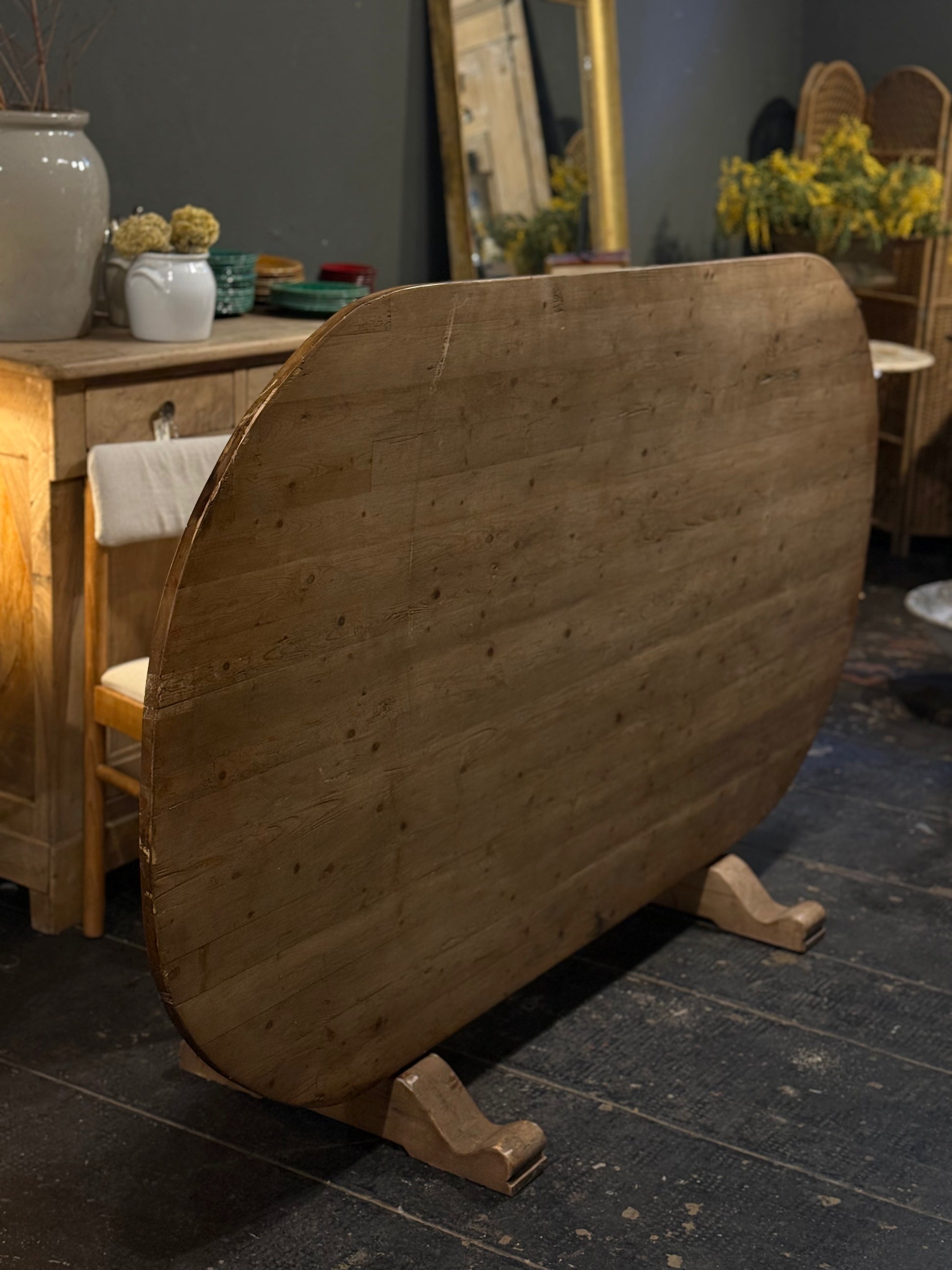 Preciosa y original mesa de vendimia en formato ovalado, una versión poco habitual dentro de este tipo de piezas tradicionales, ya que la mayoría suelen encontrarse en medidas más reducidas.