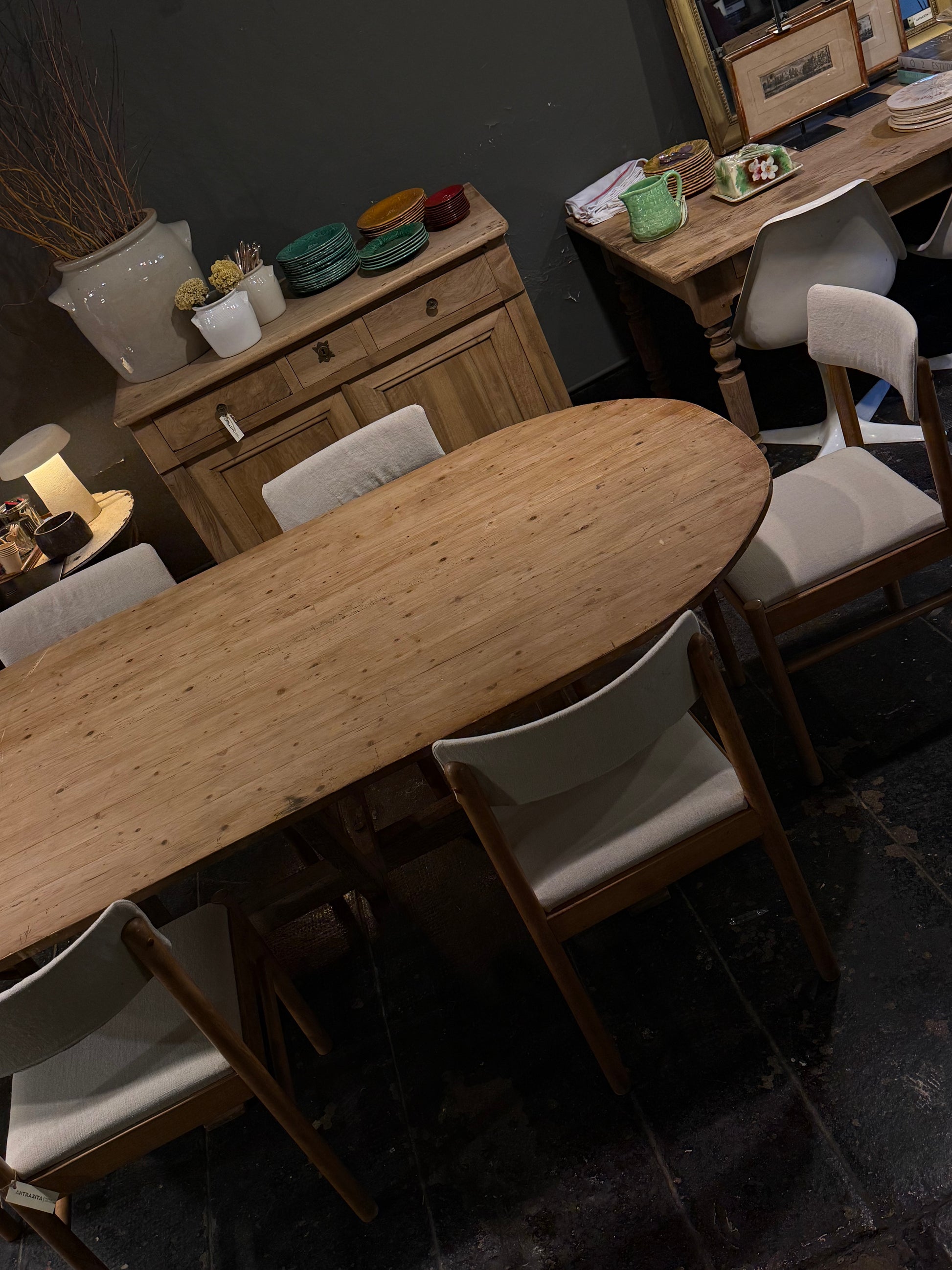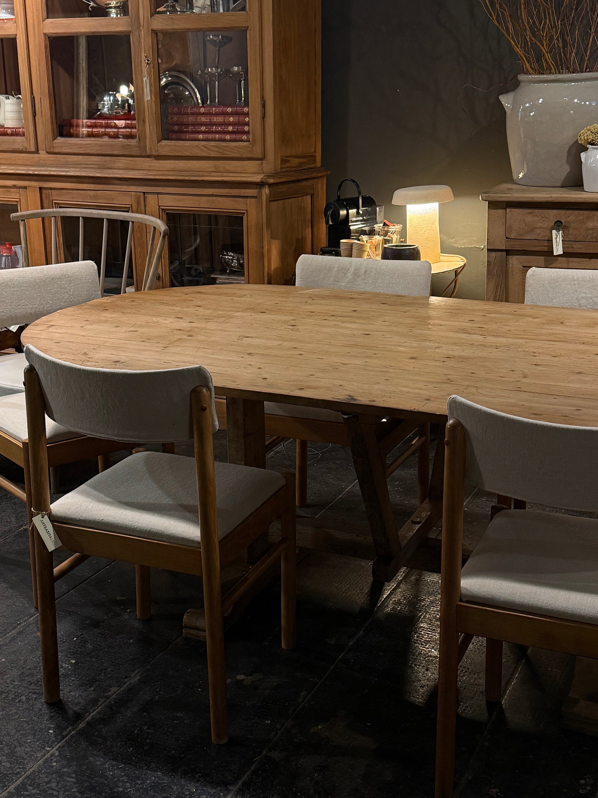 Su silueta ovalada suaviza el conjunto y favorece la reunión, convirtiéndola en una mesa perfecta para grandes comidas y encuentros. Conserva el encanto rústico propio de las mesas de campo, con la belleza de la madera trabajada y las huellas naturales del tiempo que le aportan autenticidad.
