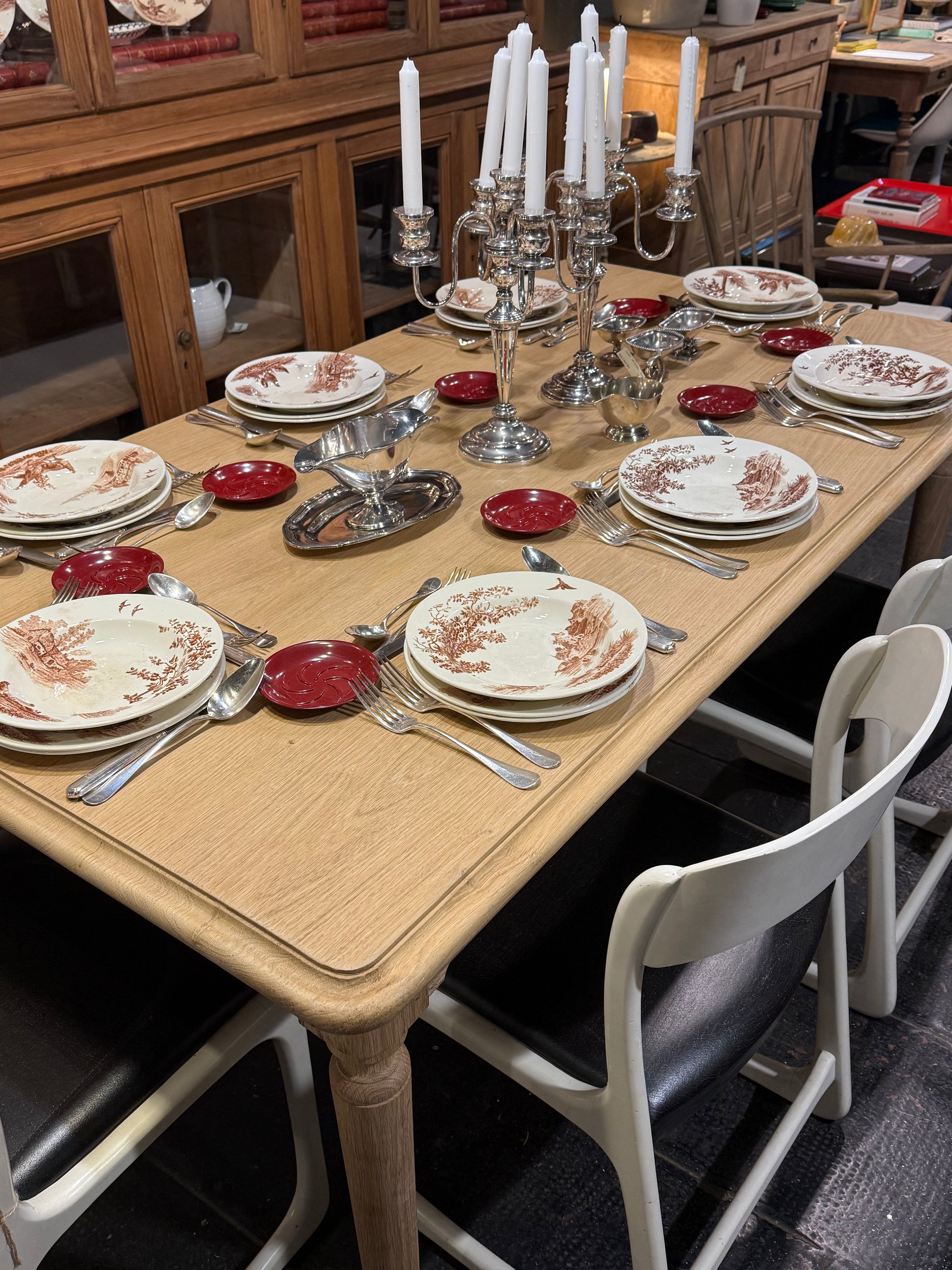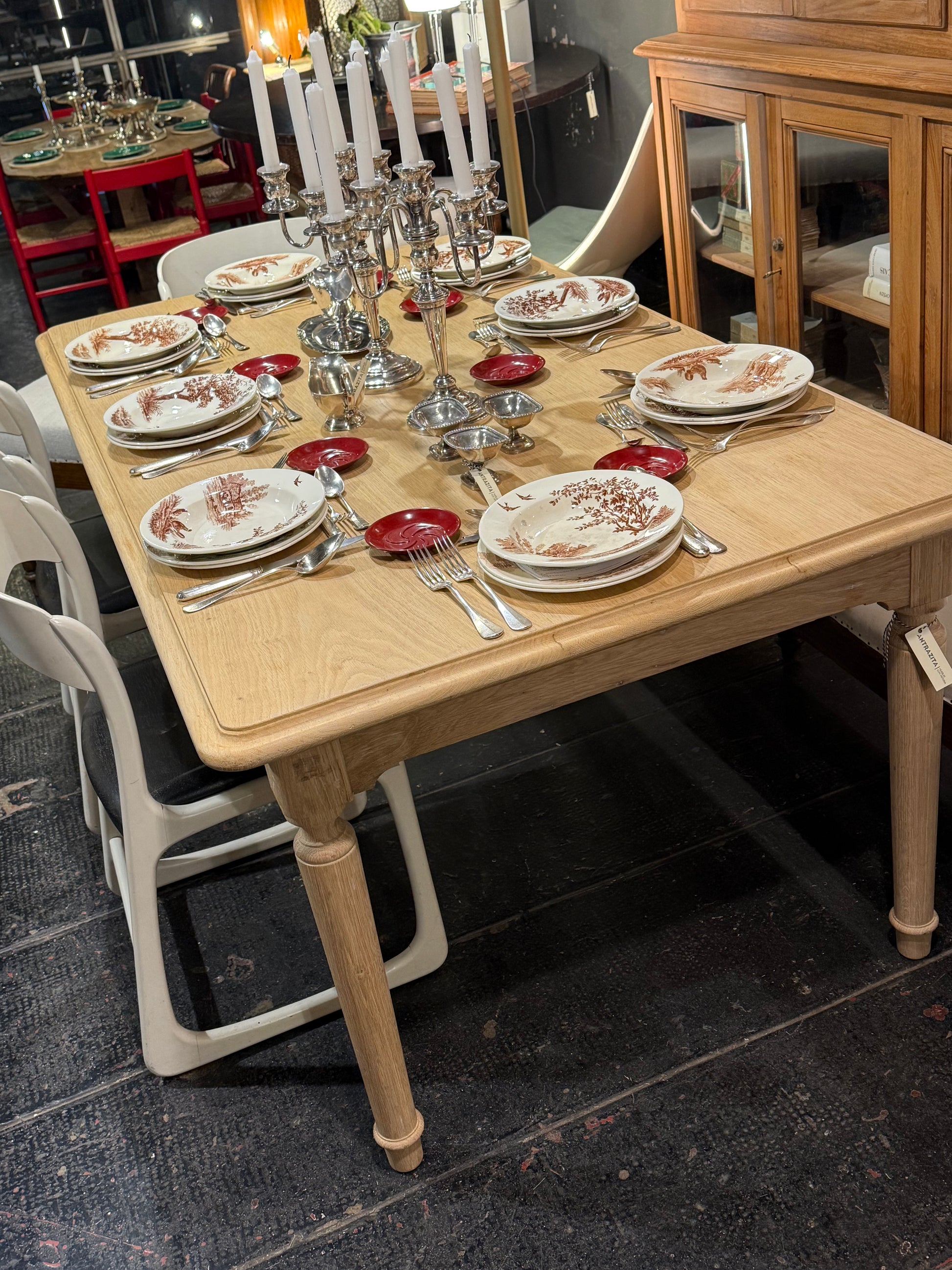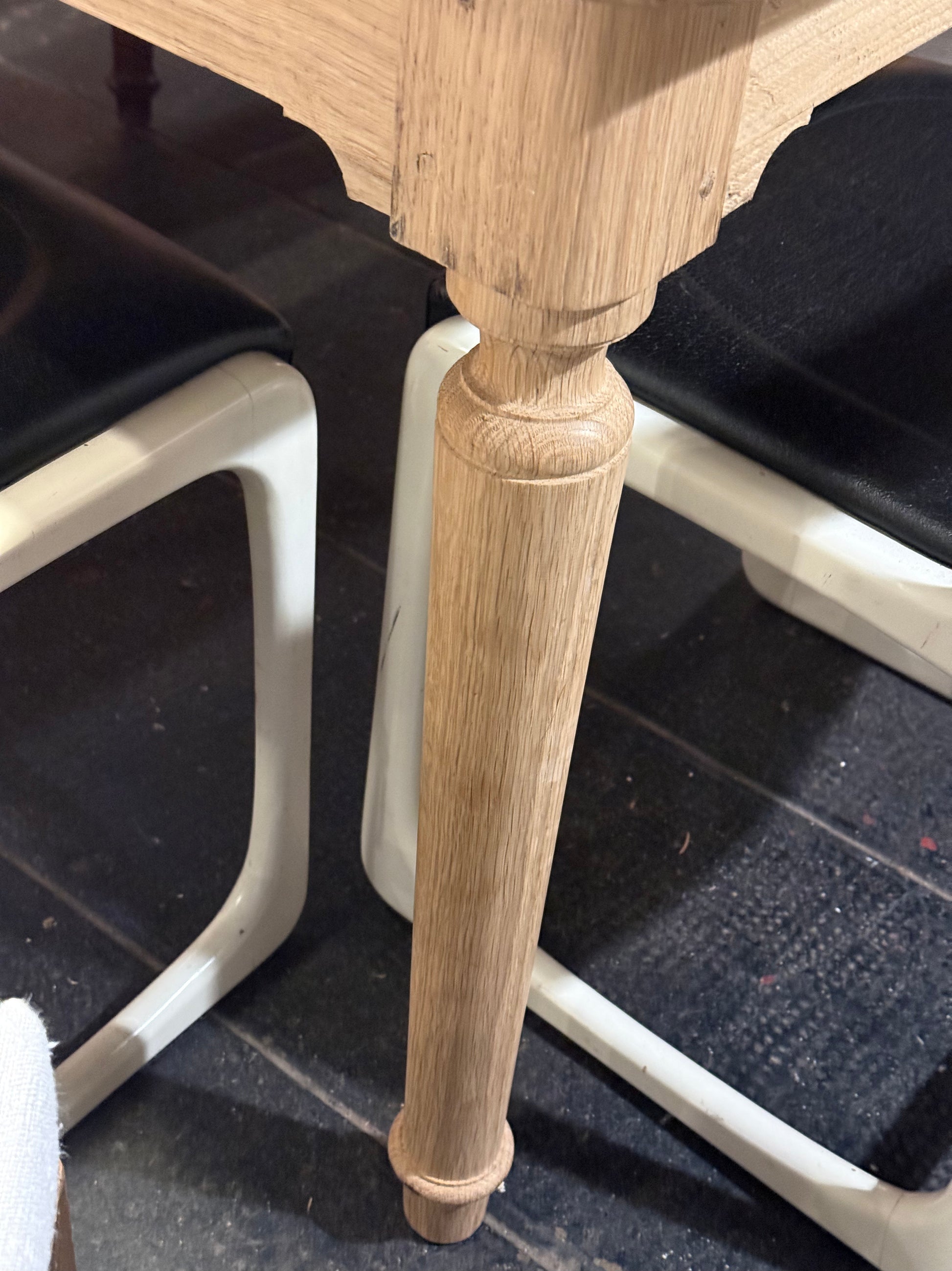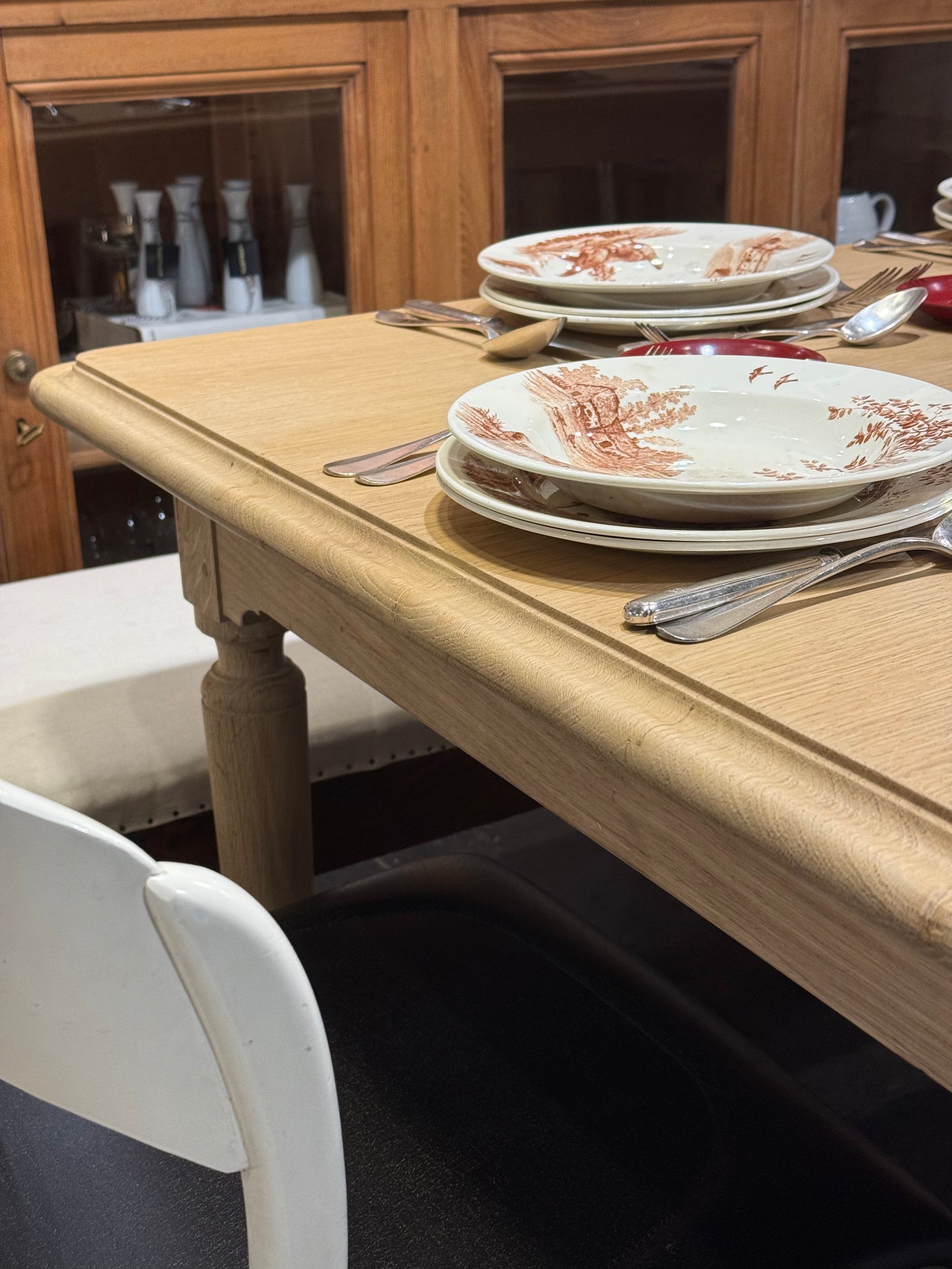 Mesa de roble francesa, una pieza de líneas sencillas y elegantes que destaca por la calidez de su madera y por la suavidad de sus proporciones. El sobre presenta cantos ligeramente redondeados, un detalle sutil que aporta ligereza visual y hace que la pieza resulte especialmente armoniosa.