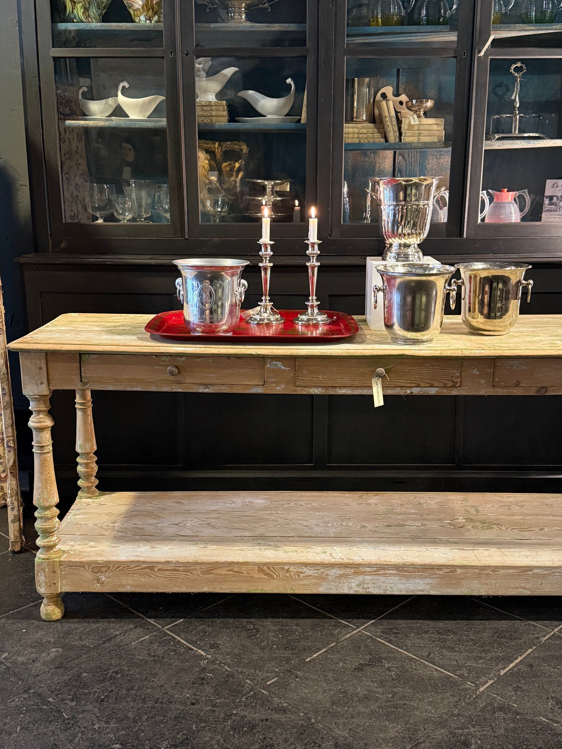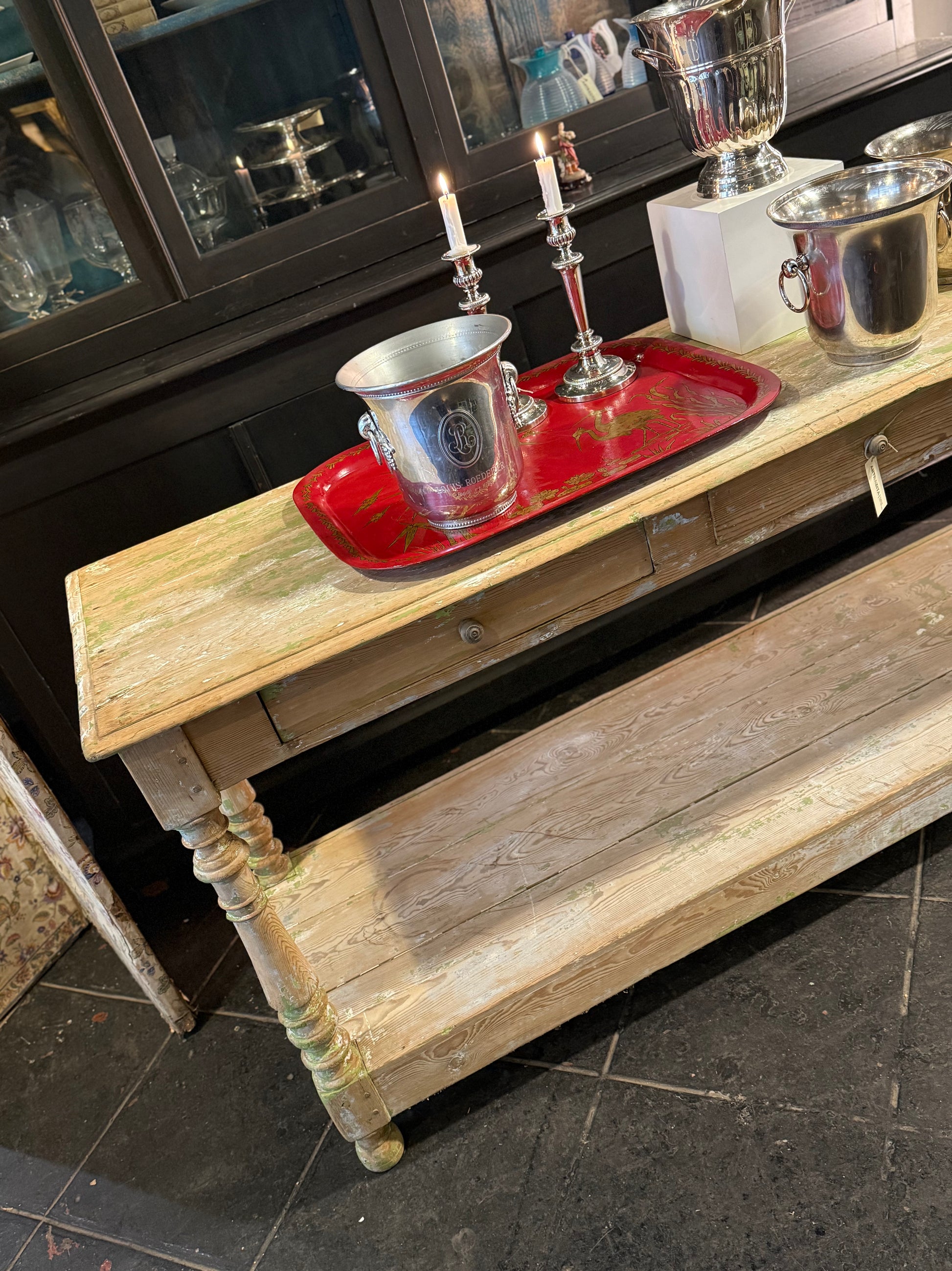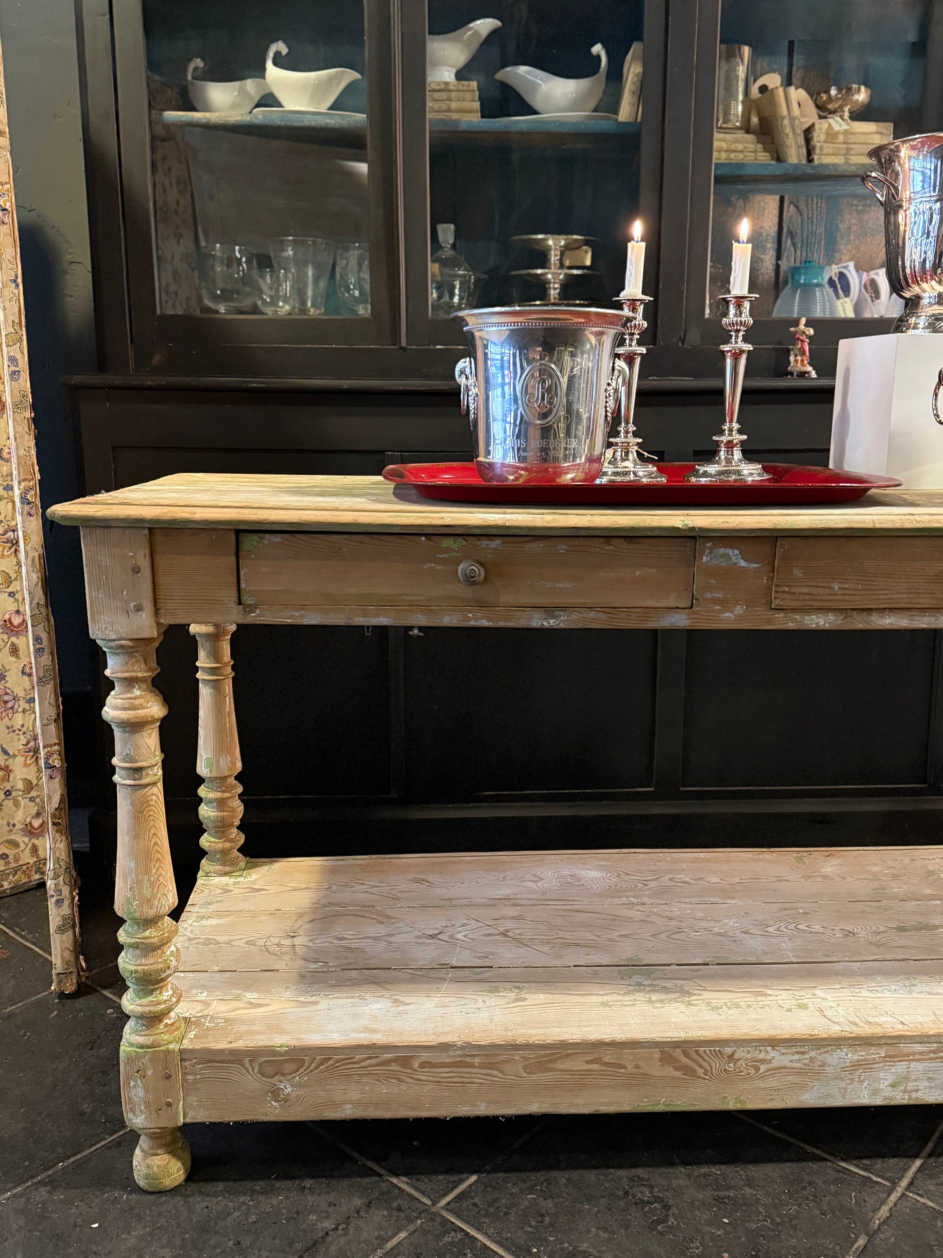 Mostrador antiguo de pino con un suave toque de pátina verde que resalta su encanto único y aporta personalidad a cualquier espacio. Cuenta con tres cajones ideales para almacenaje y una superficie generosa que lo convierte en una pieza funcional y decorativa a la vez.