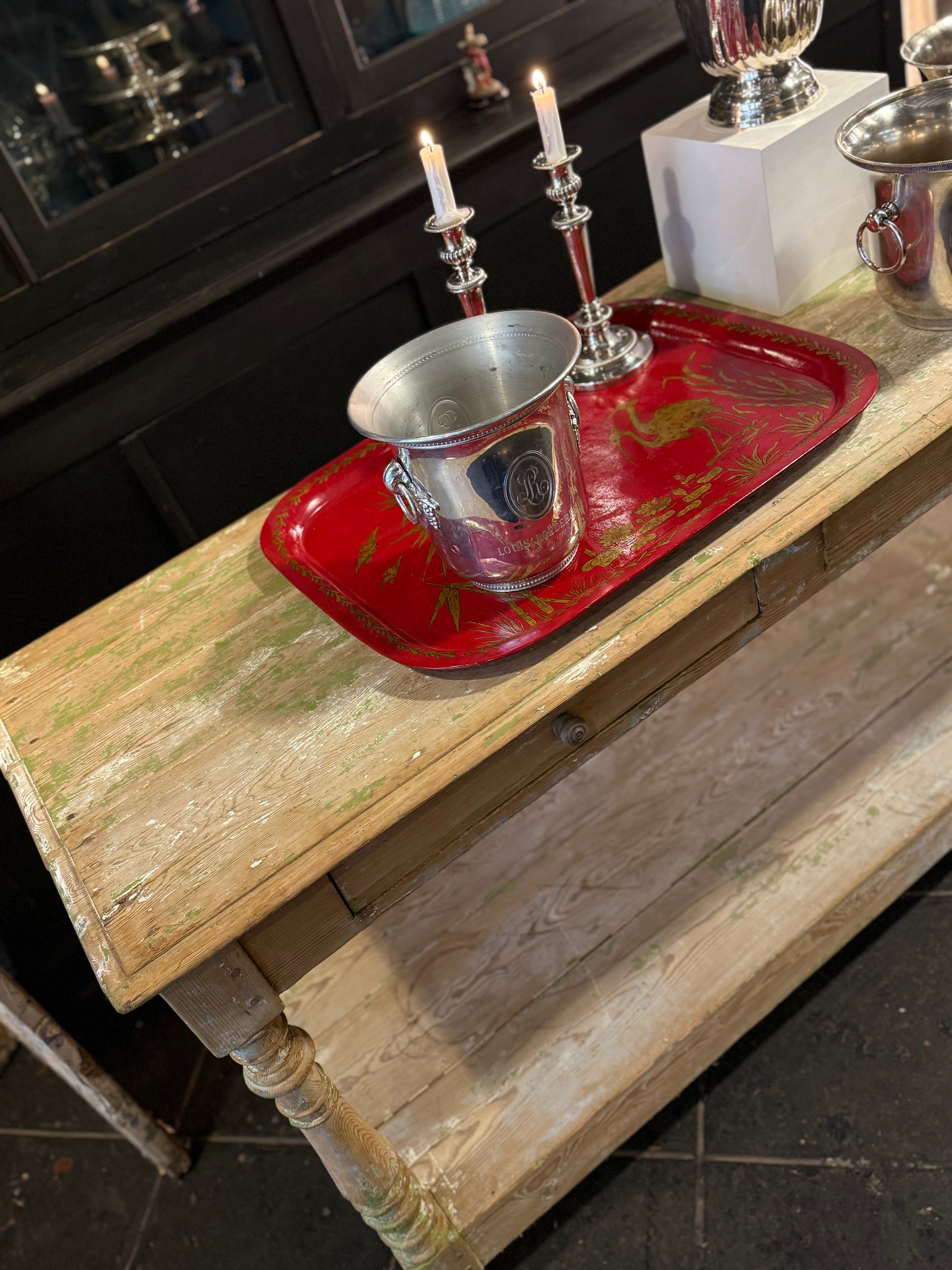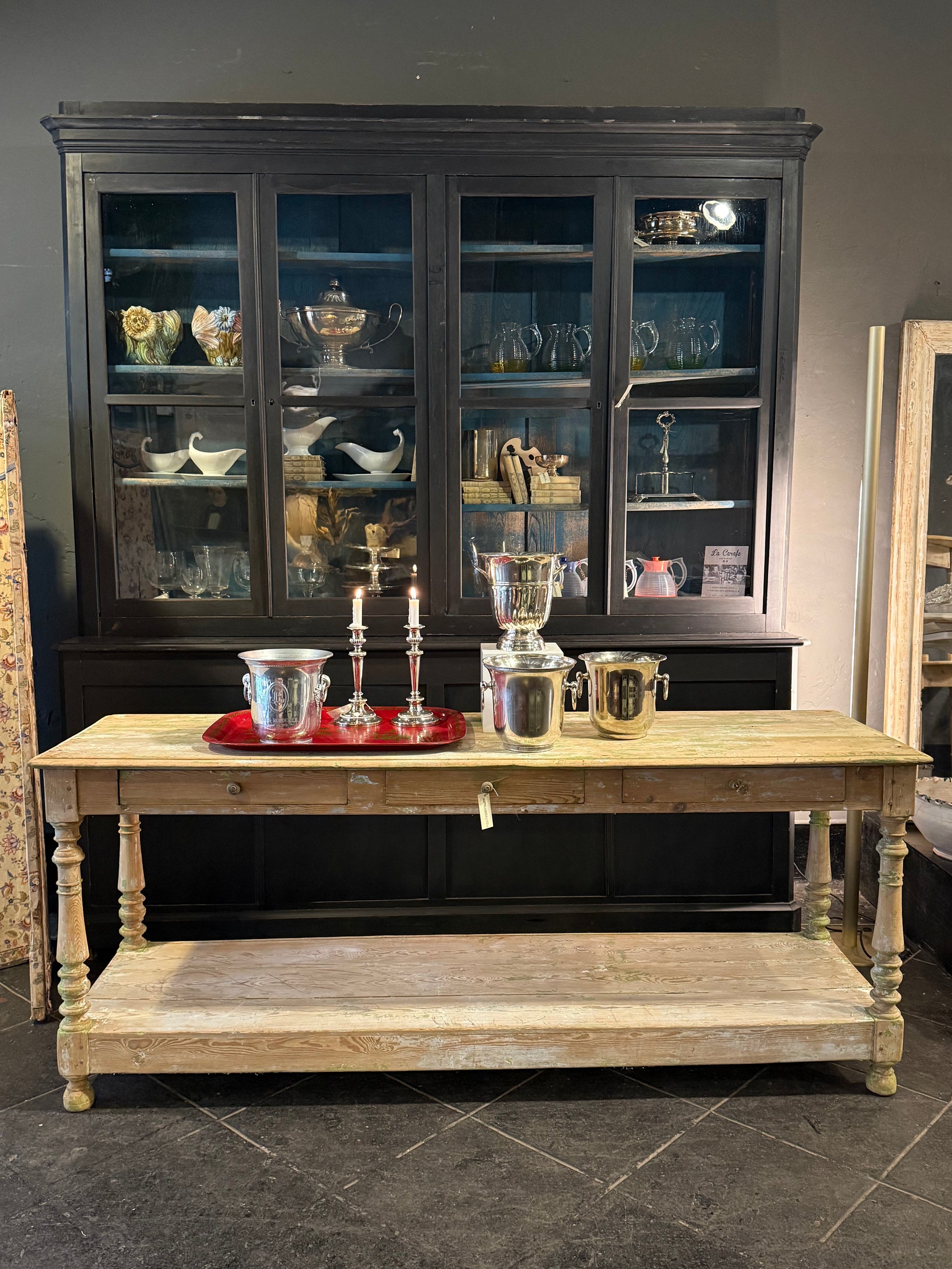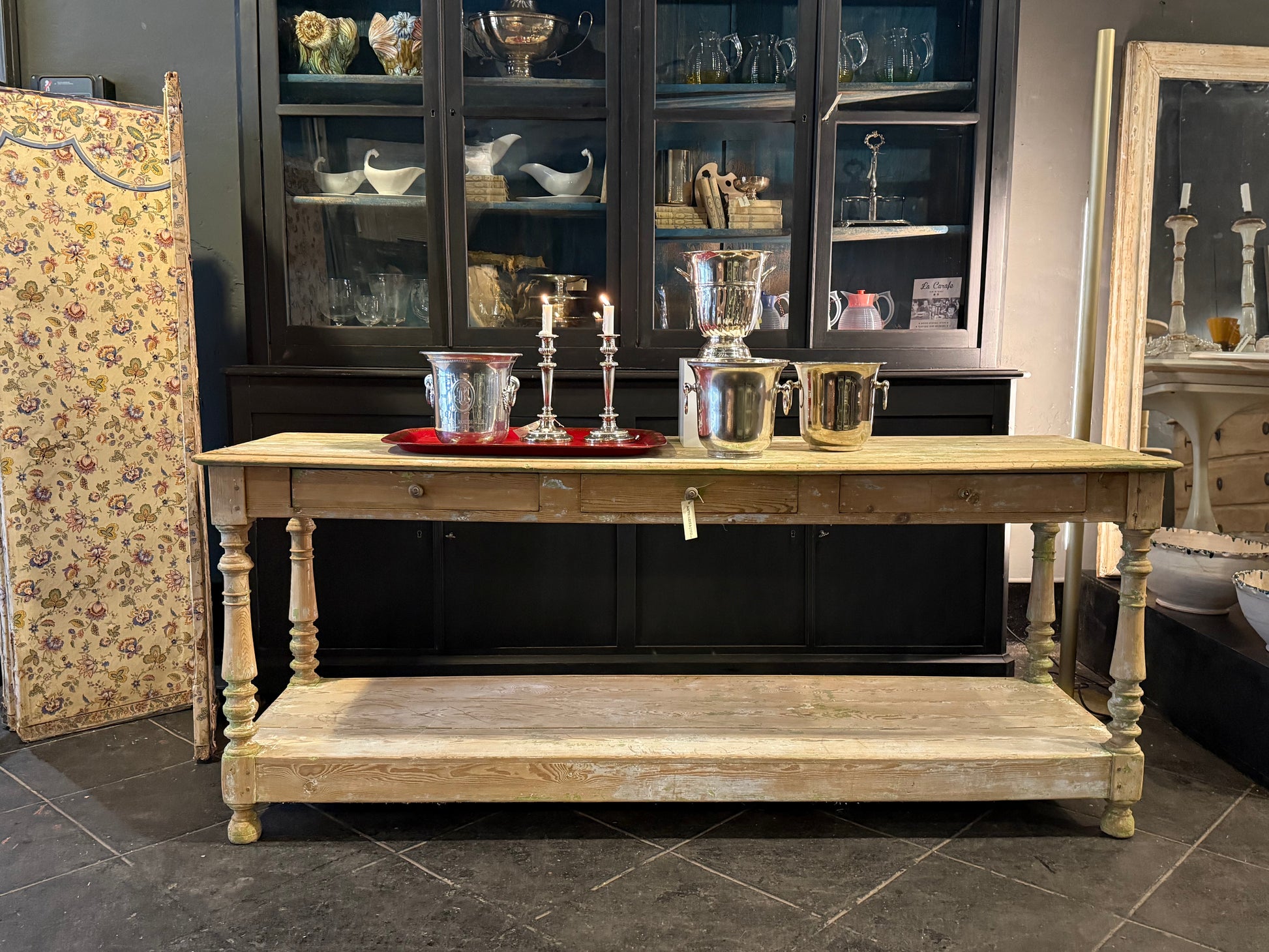 Mostrador antiguo de pino con un suave toque de pátina verde que resalta su encanto único y aporta personalidad a cualquier espacio. Cuenta con tres cajones ideales para almacenaje y una superficie generosa que lo convierte en una pieza funcional y decorativa a la vez.