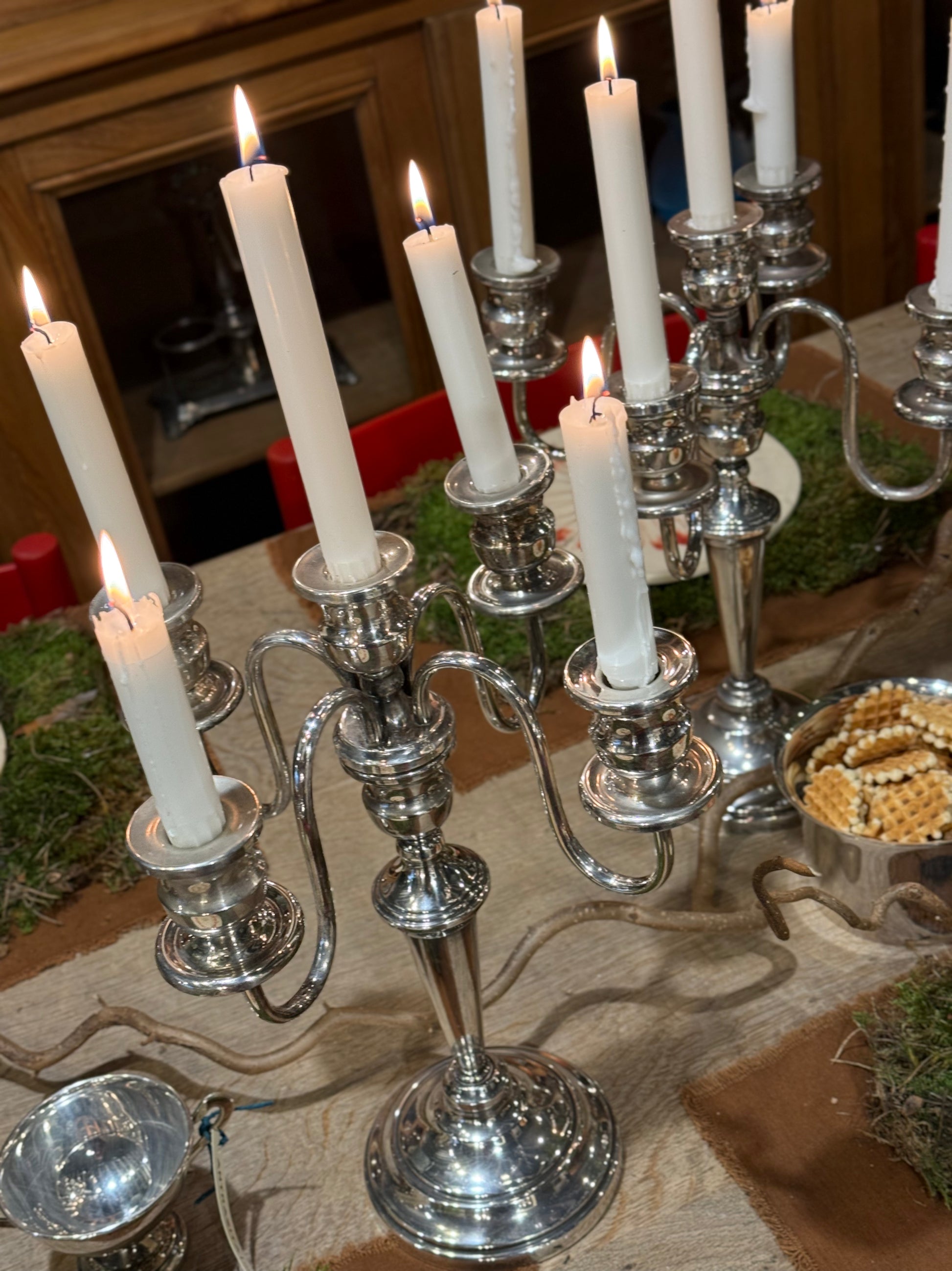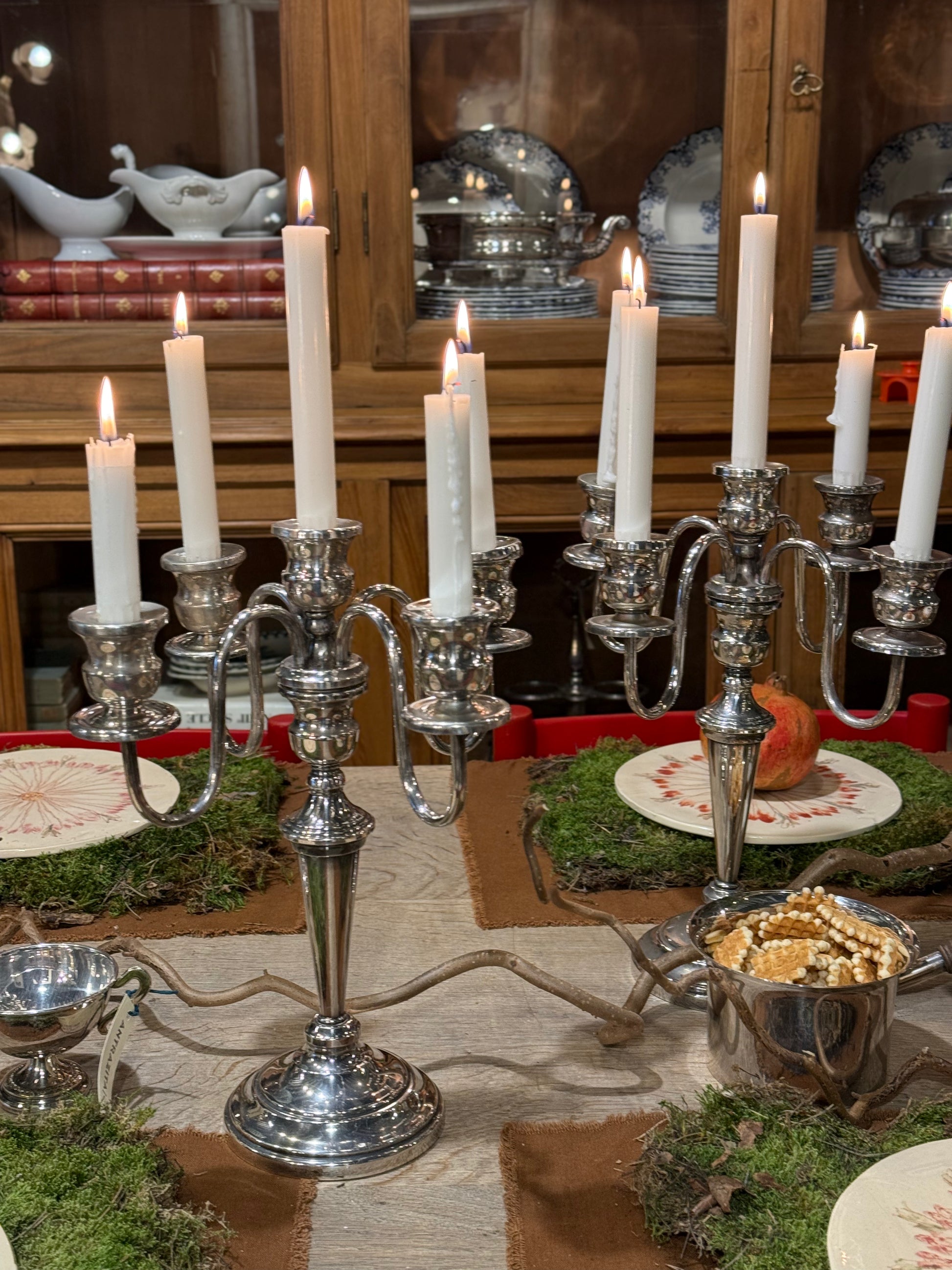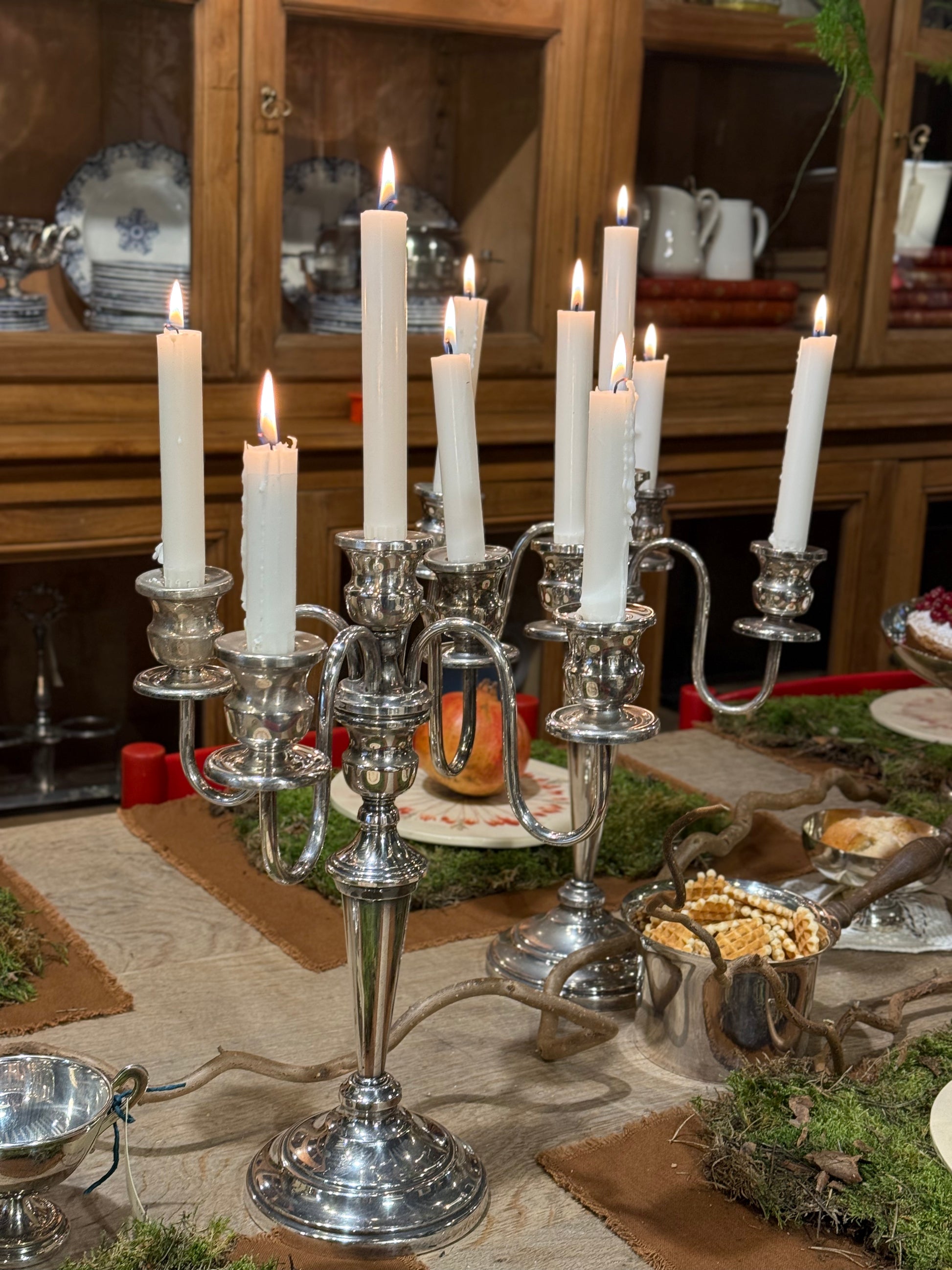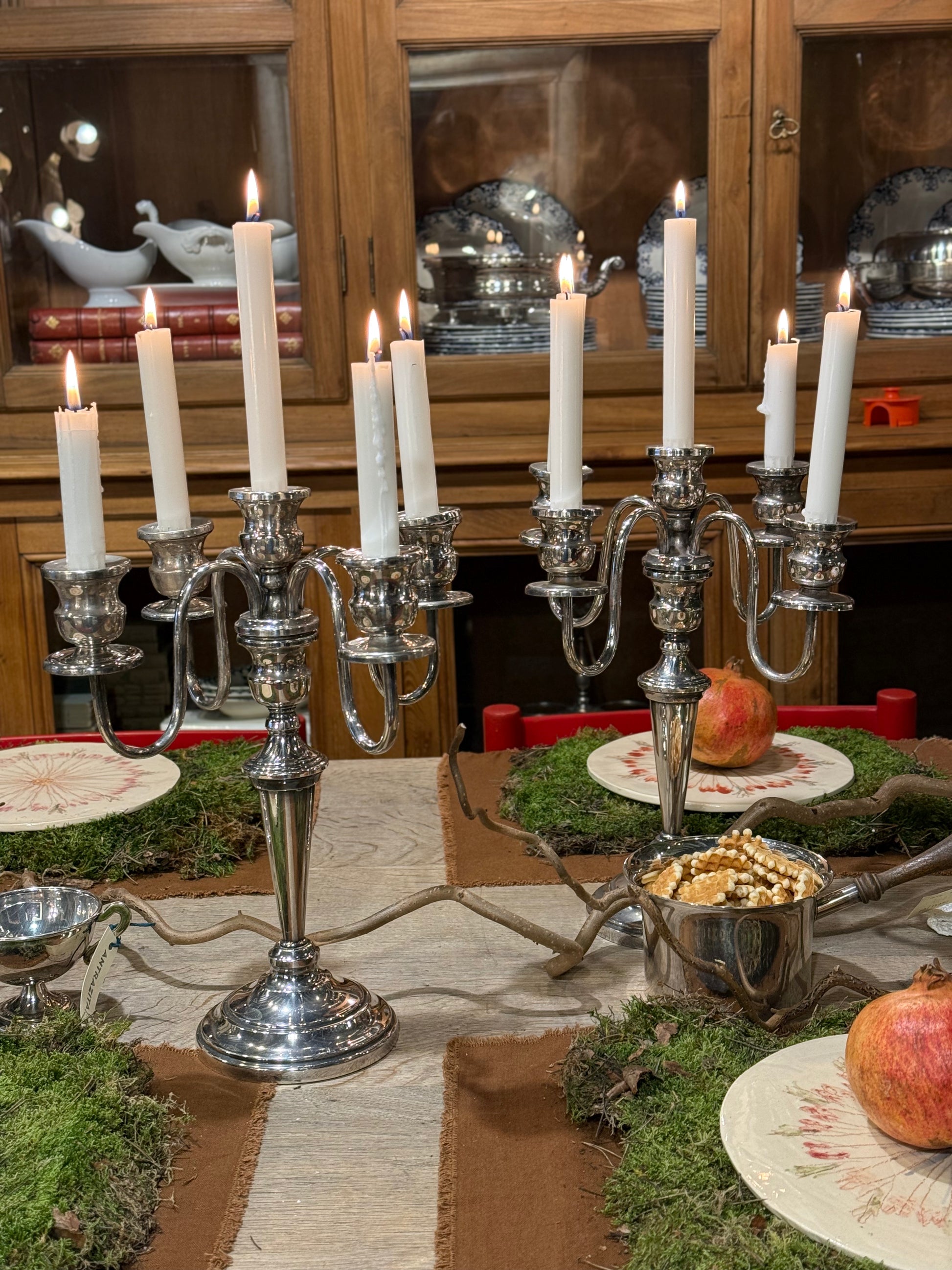 Elegante pareja de candelabros de metal plateado, con un diseño clásico y atemporal que aporta luz, equilibrio y sofisticación a cualquier espacio.