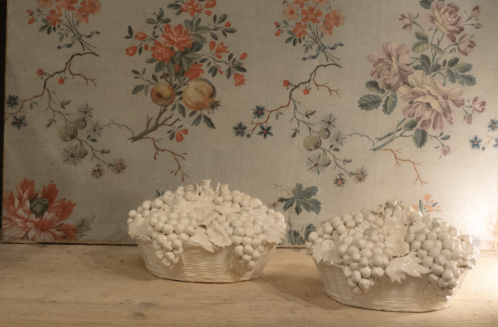 Una pareja encantadora de fruteros de cerámica esmaltada, de origen italiano, con forma de cesta cubierta por racimos de uvas en relieve.