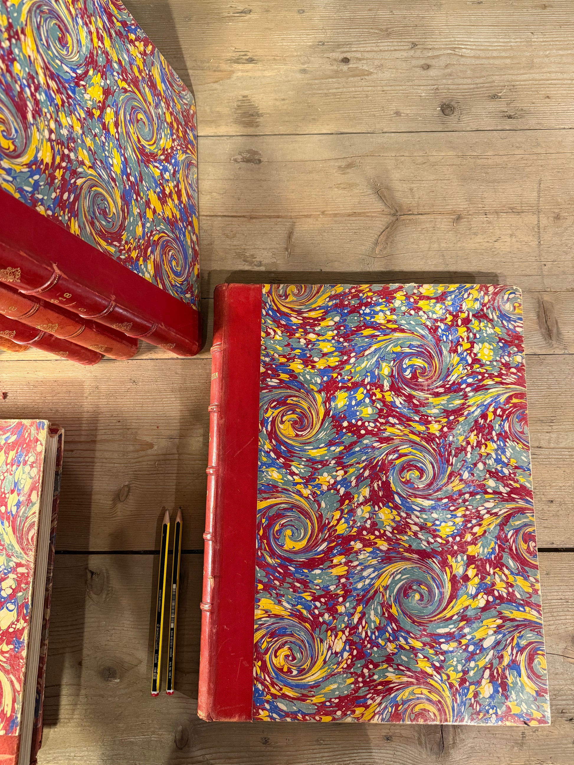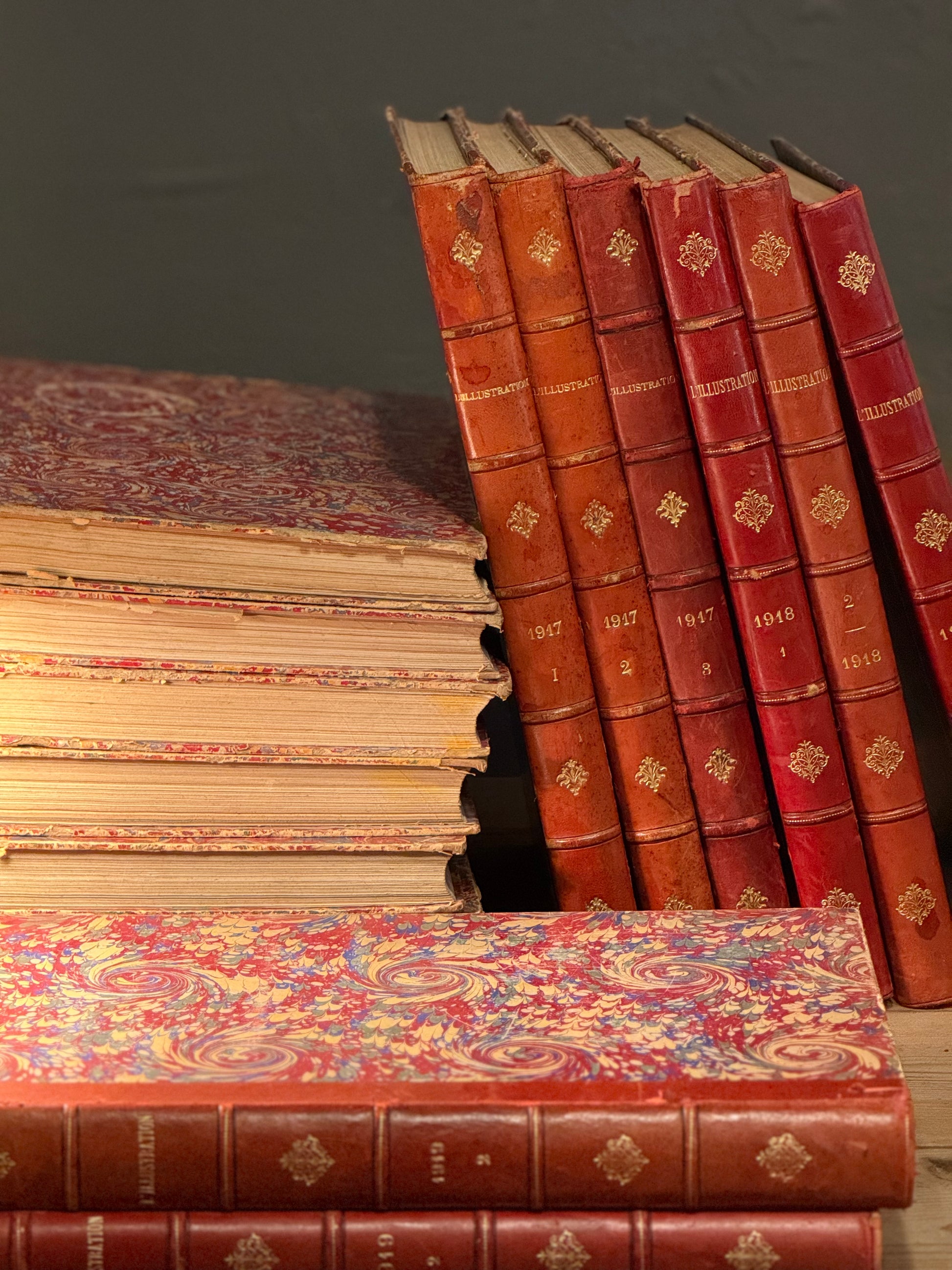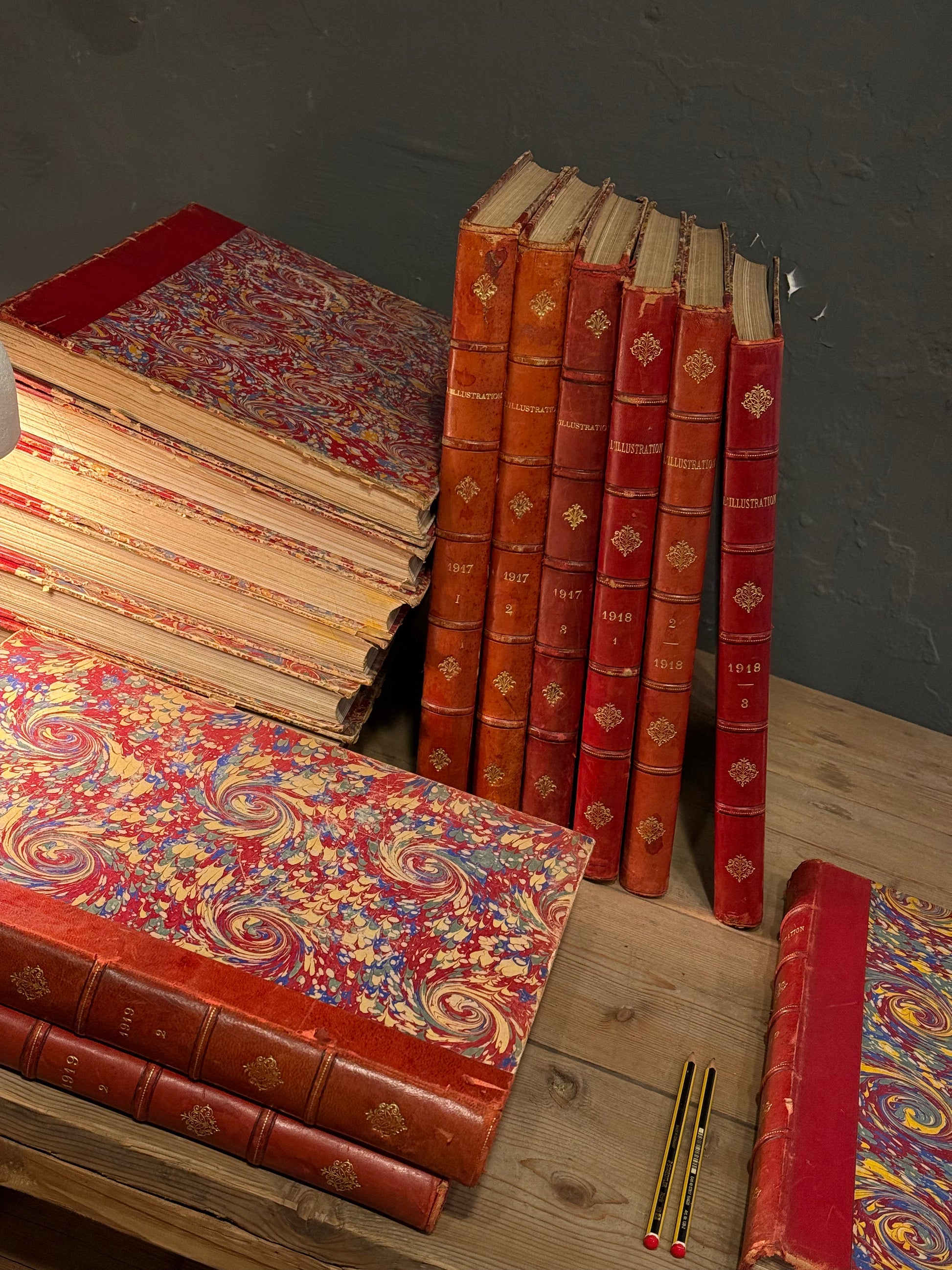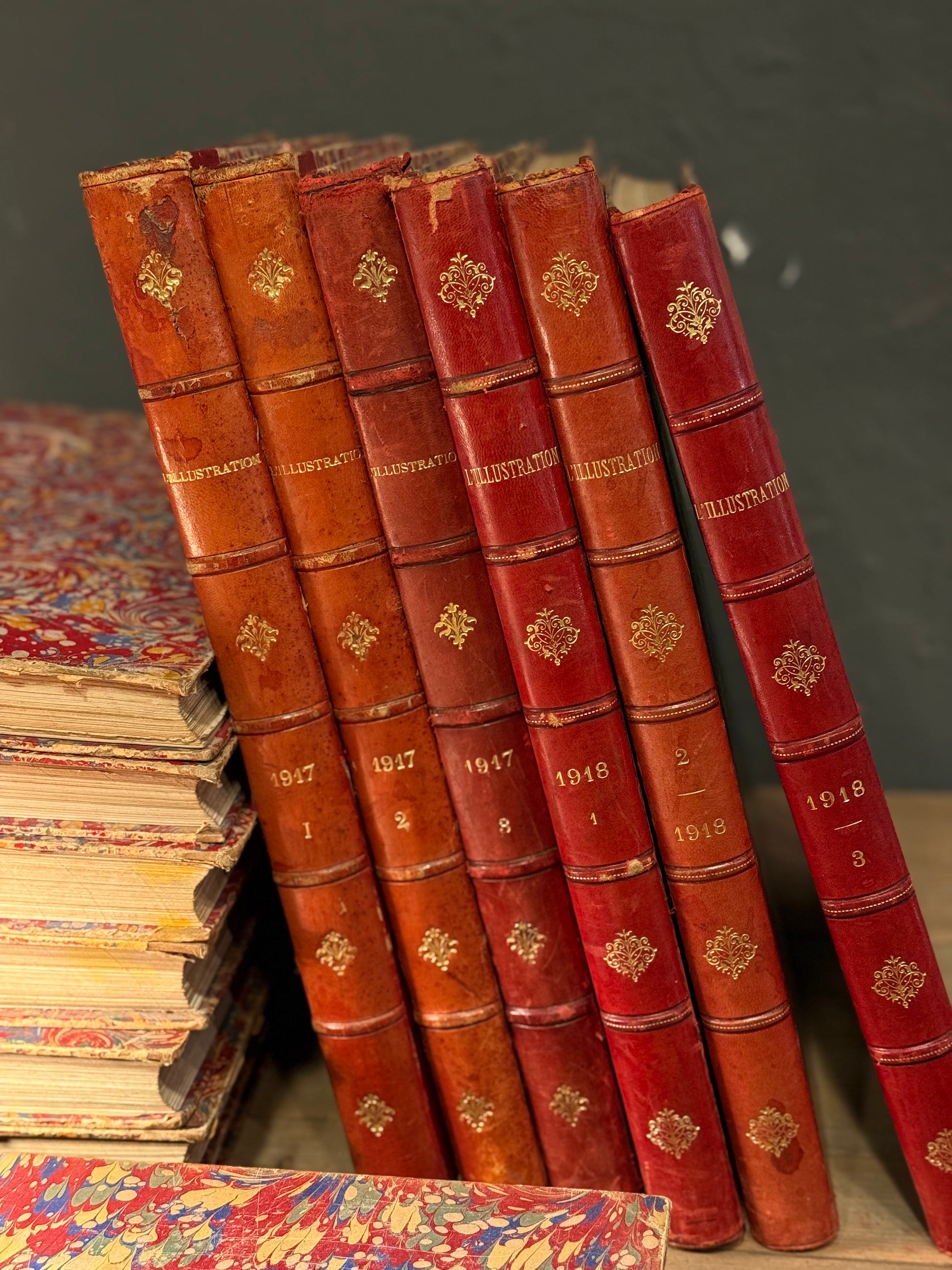 Colección de 16 libros de la revistas originales de la prestigiosa publicación francesa L'Illustration, con lomos encuadernados en piel.