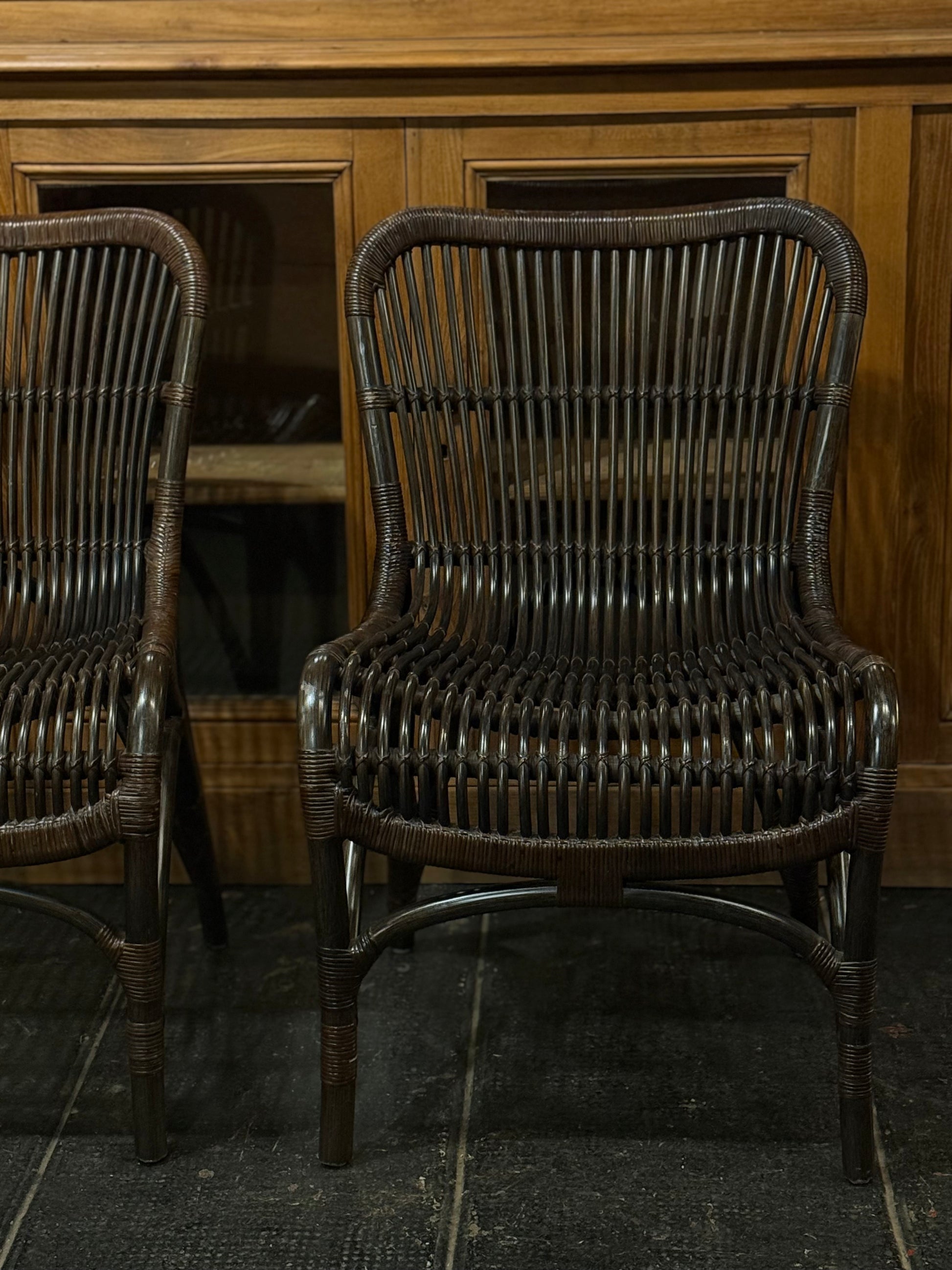 Elegante conjunto de 4 sillas de ratán en tono marrón chocolate, diseñadas por la reconocida firma japonesa Yamakawa Contemporary Rattan.