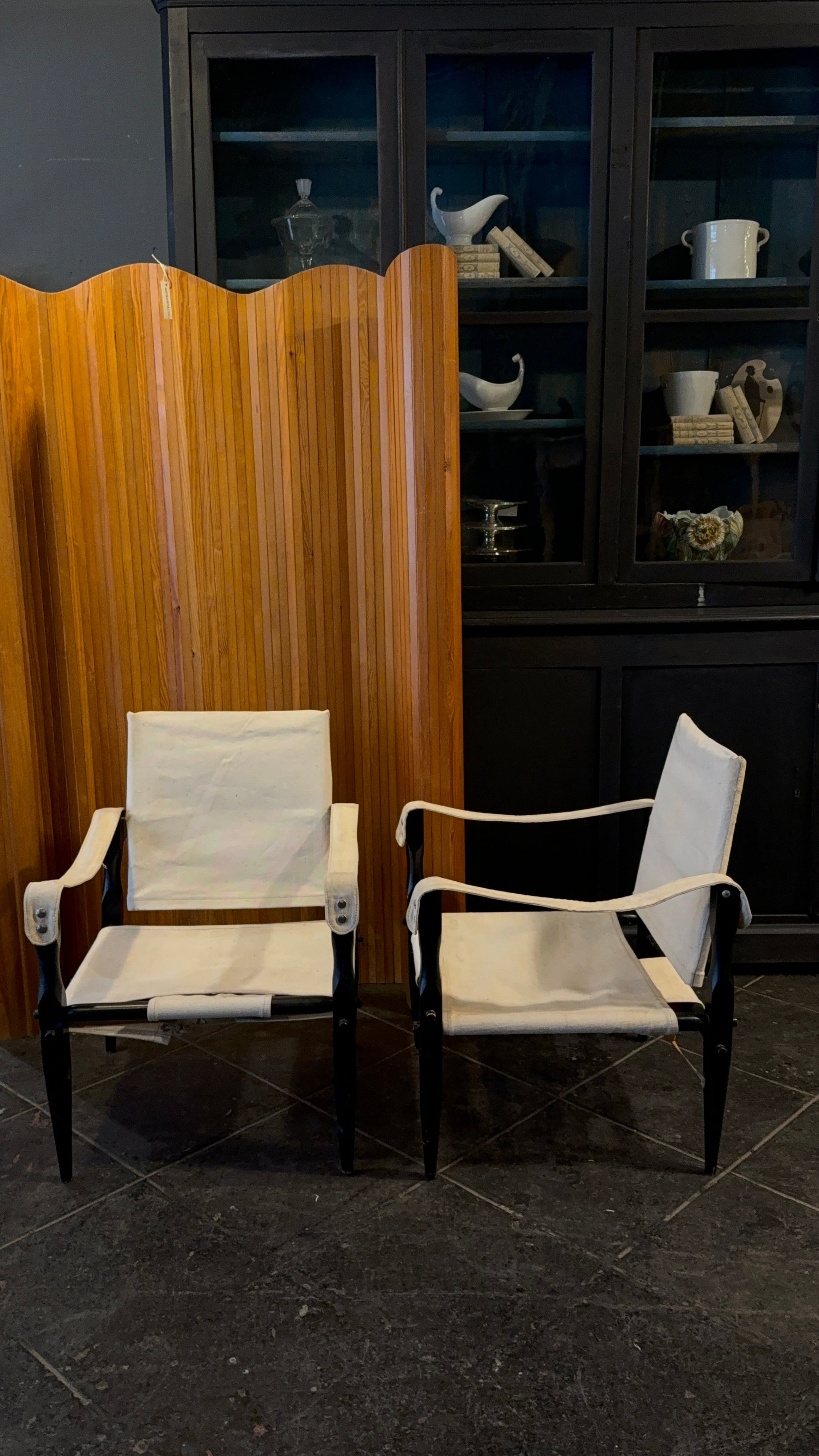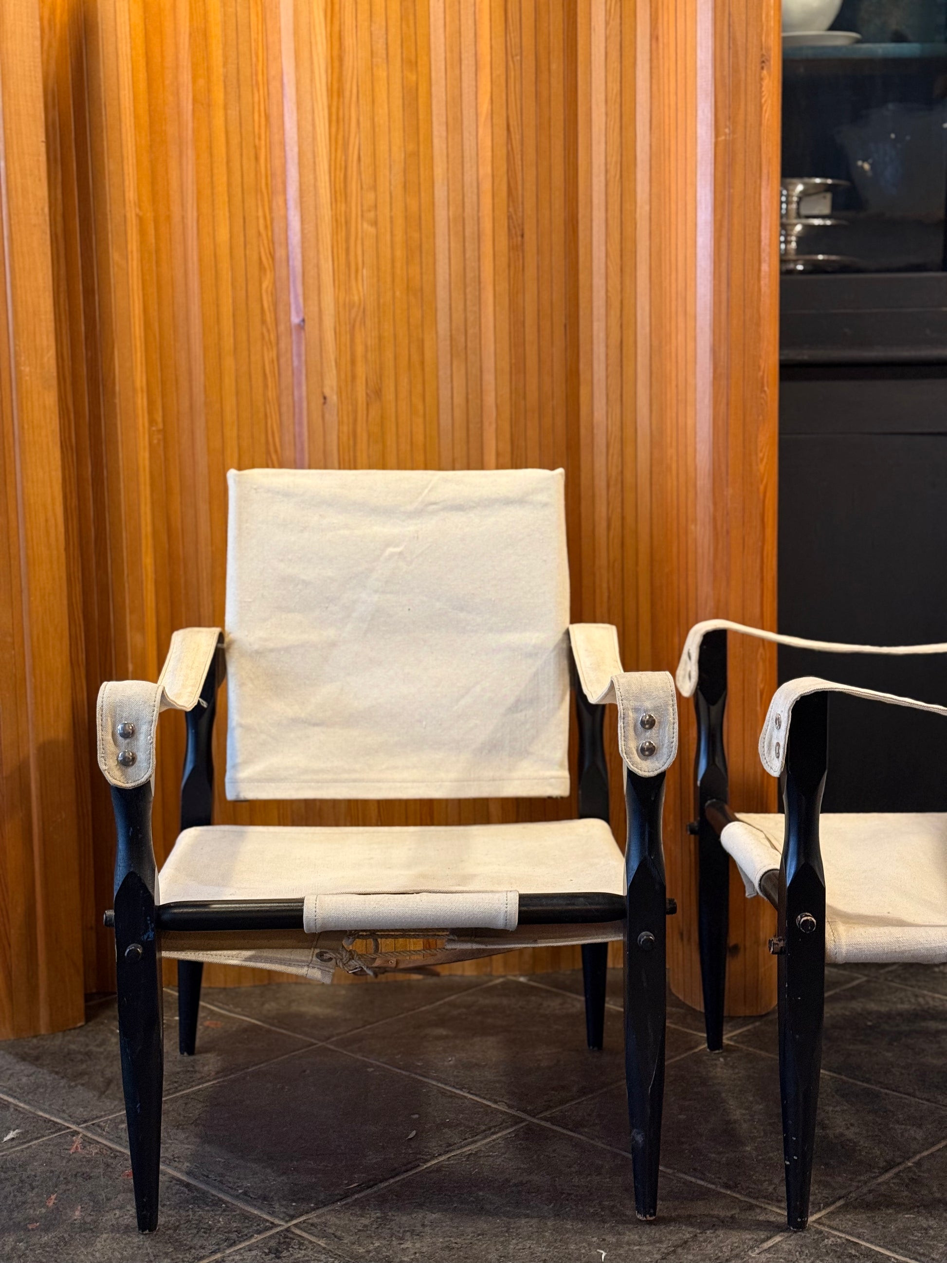 La silla safari de los años 60 vuelve con una reinterpretación sobria y elegante. Su estructura de madera pintada en negro contrasta con la lona beige del asiento y respaldo, creando una pieza que combina el espíritu retro con una estética atemporal y versátil.