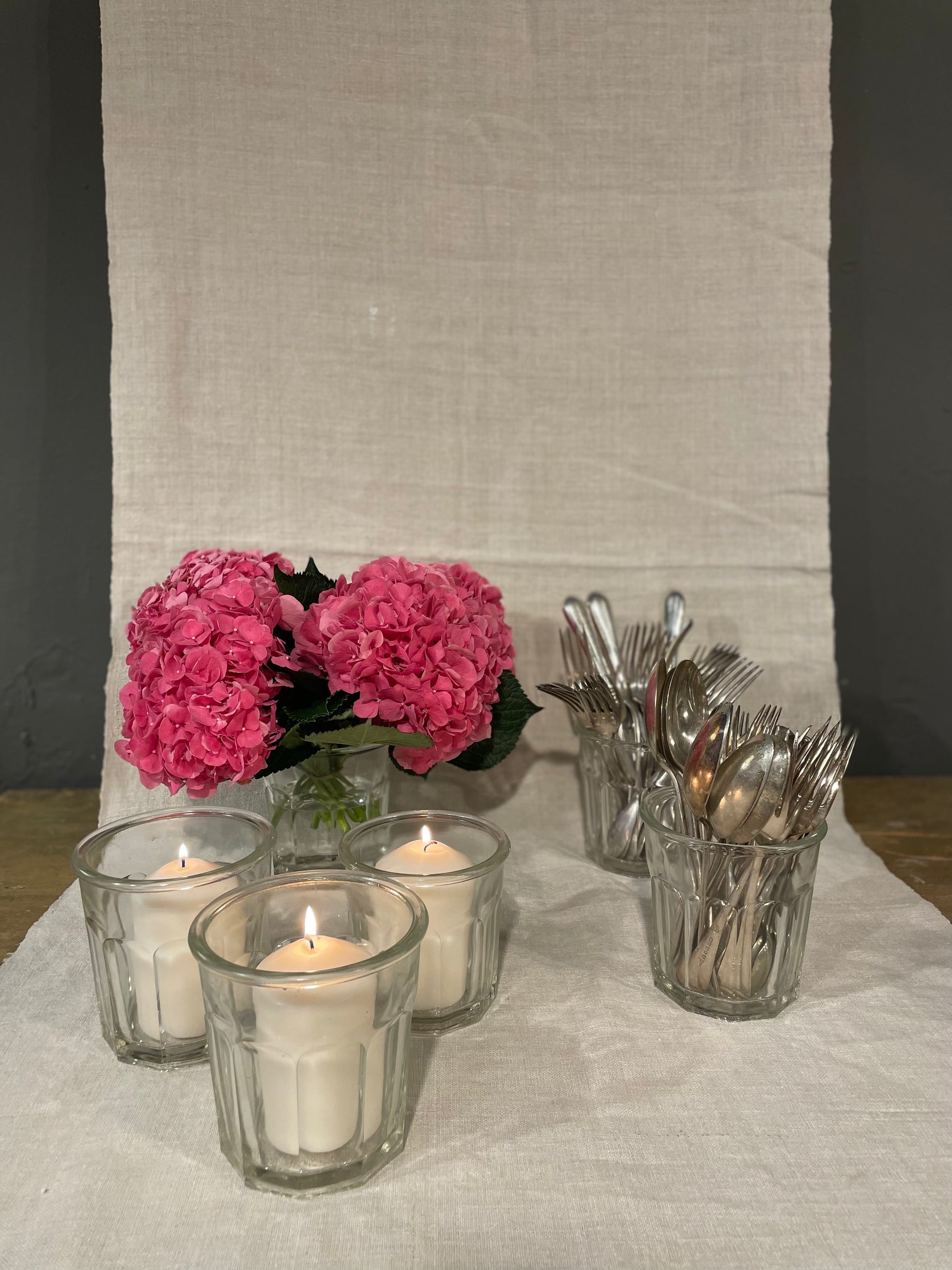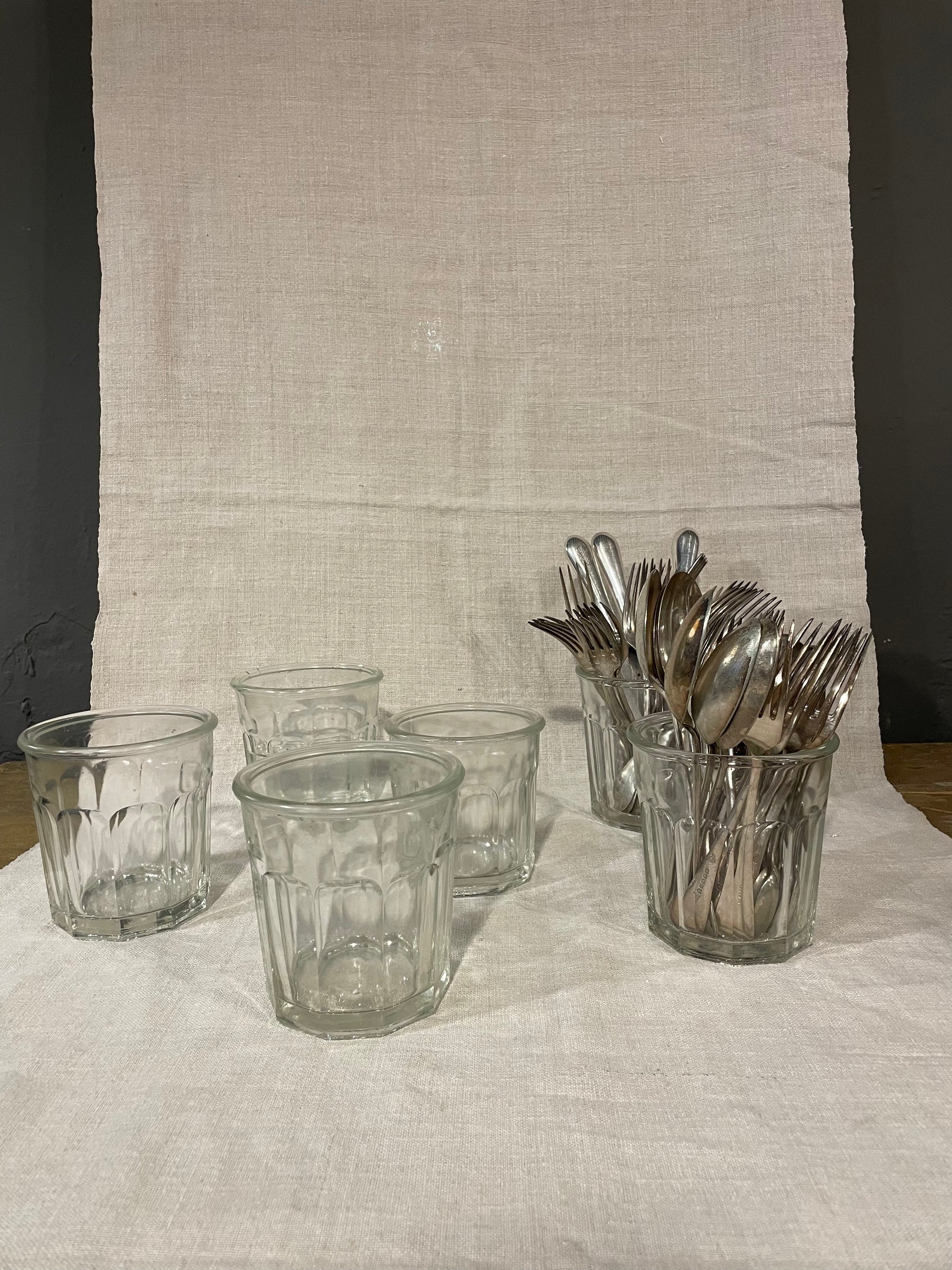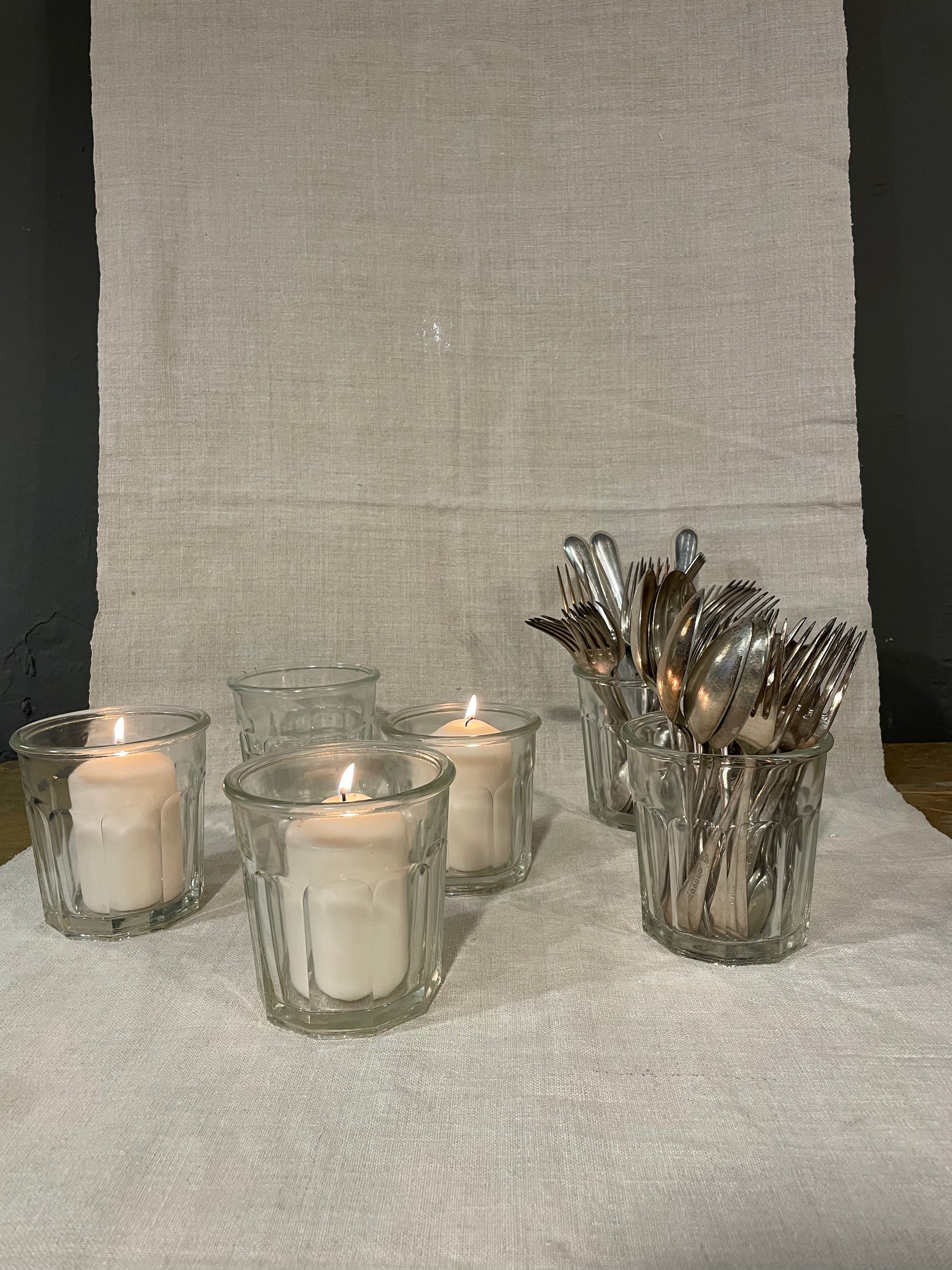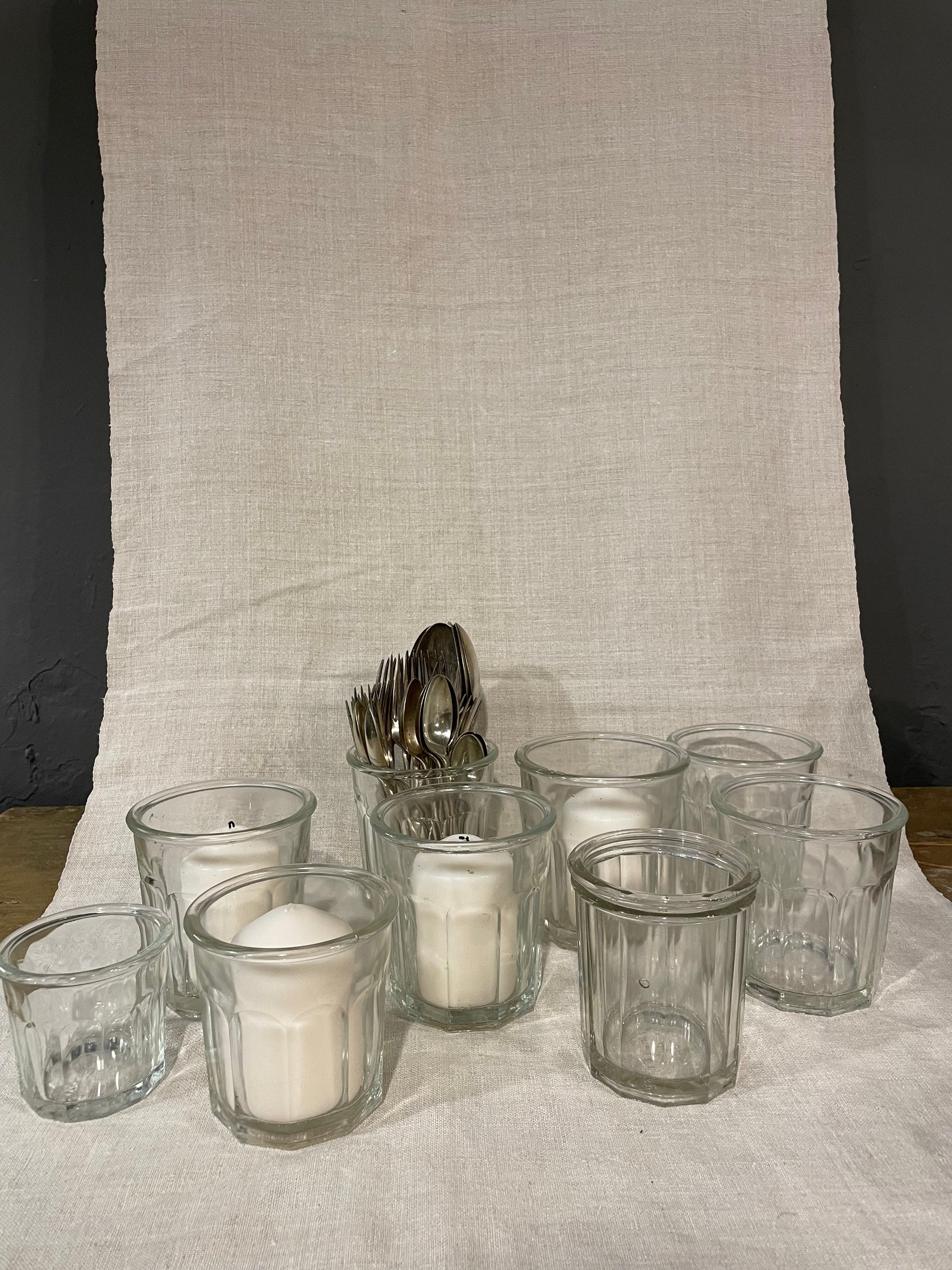 Antiguos vasos de mermelada francesa con acabado redondo.