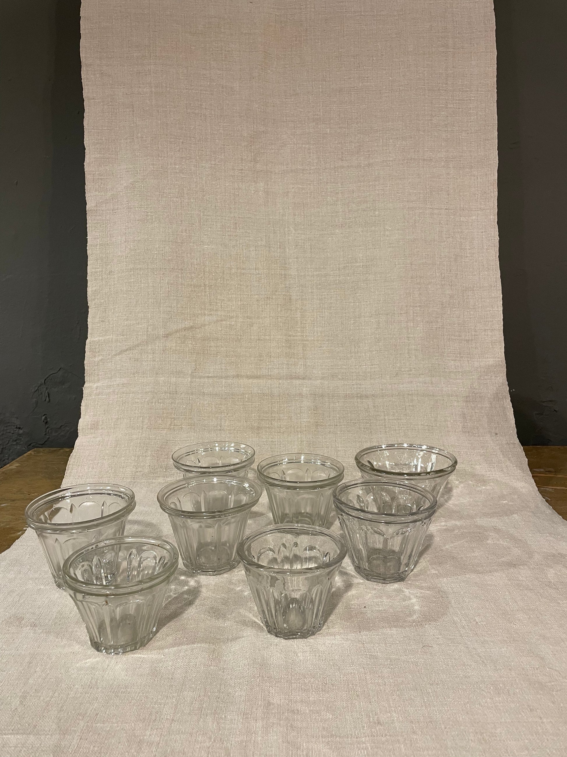 Antiguos vasos de mermelada francesa con acabado triangular.